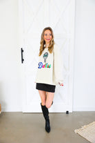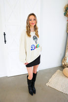 Rep your city in full sparkle with the Light Beige “Dallas” City Icon Sweatshirt by Queen of Sparkles 🌆✨ This soft, cozy sweatshirt features a dazzling sequin Dallas city icon paired with multicolor sequin “Dallas” lettering for a vibrant, statement-making look. Effortlessly stylish and ultra-comfortable, it’s the perfect elevated casual piece for game days, concerts, weekend outings, or adding a touch of glam to everyday wear. A must-have for every Dallas girl who loves sparkle! 💙⭐️