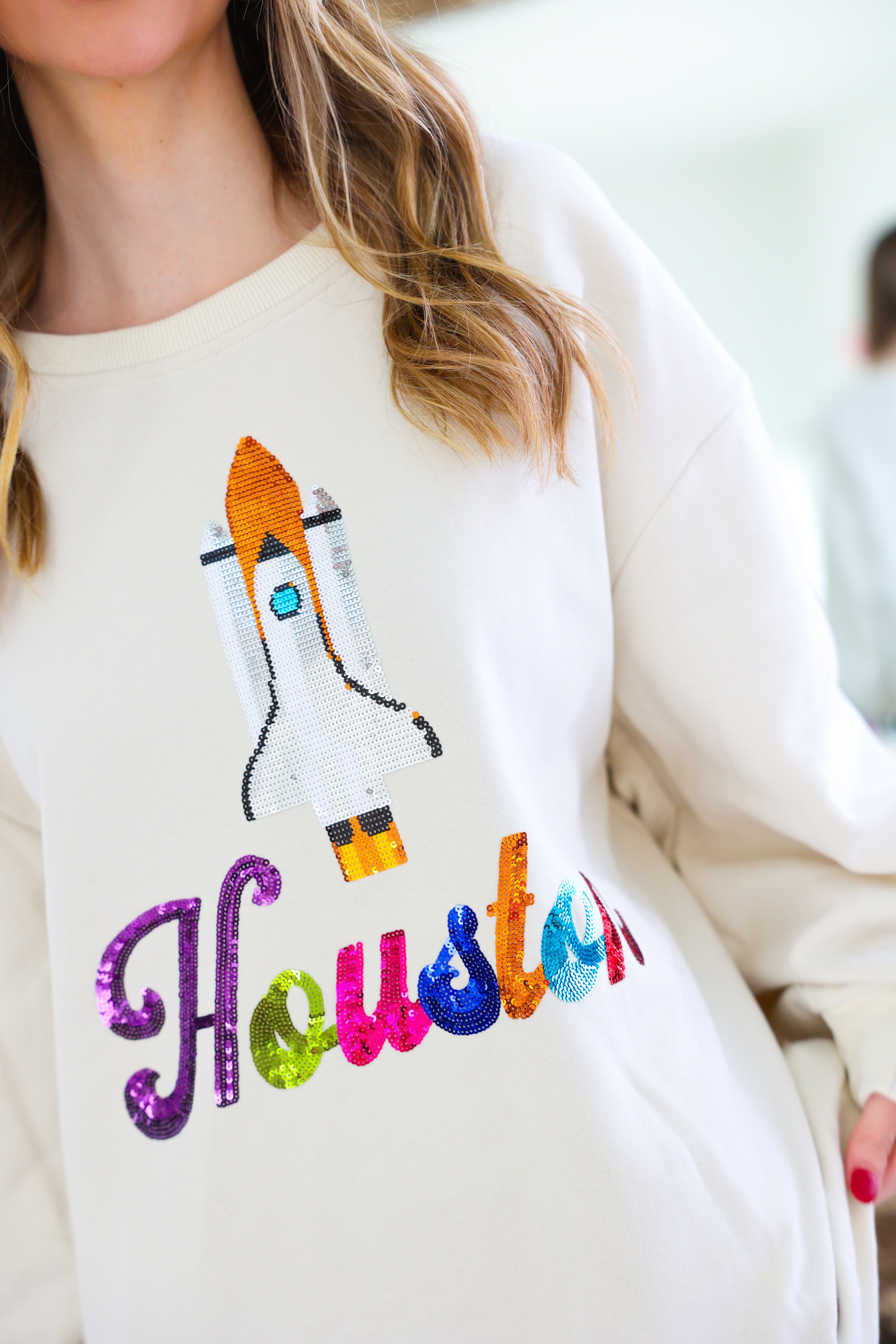 Light beige sweatshirt with multicolor sequin “Houston” lettering 🌈