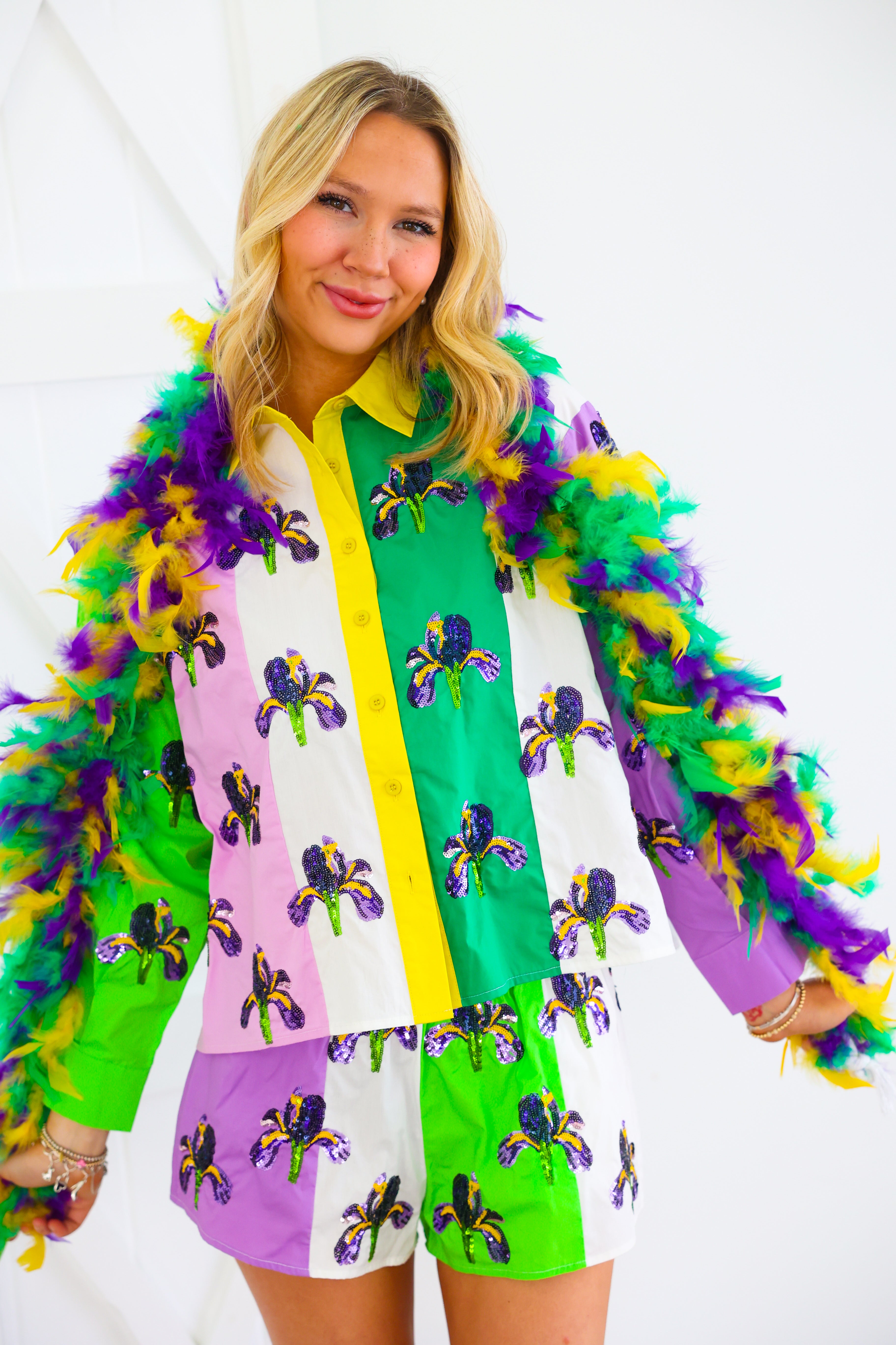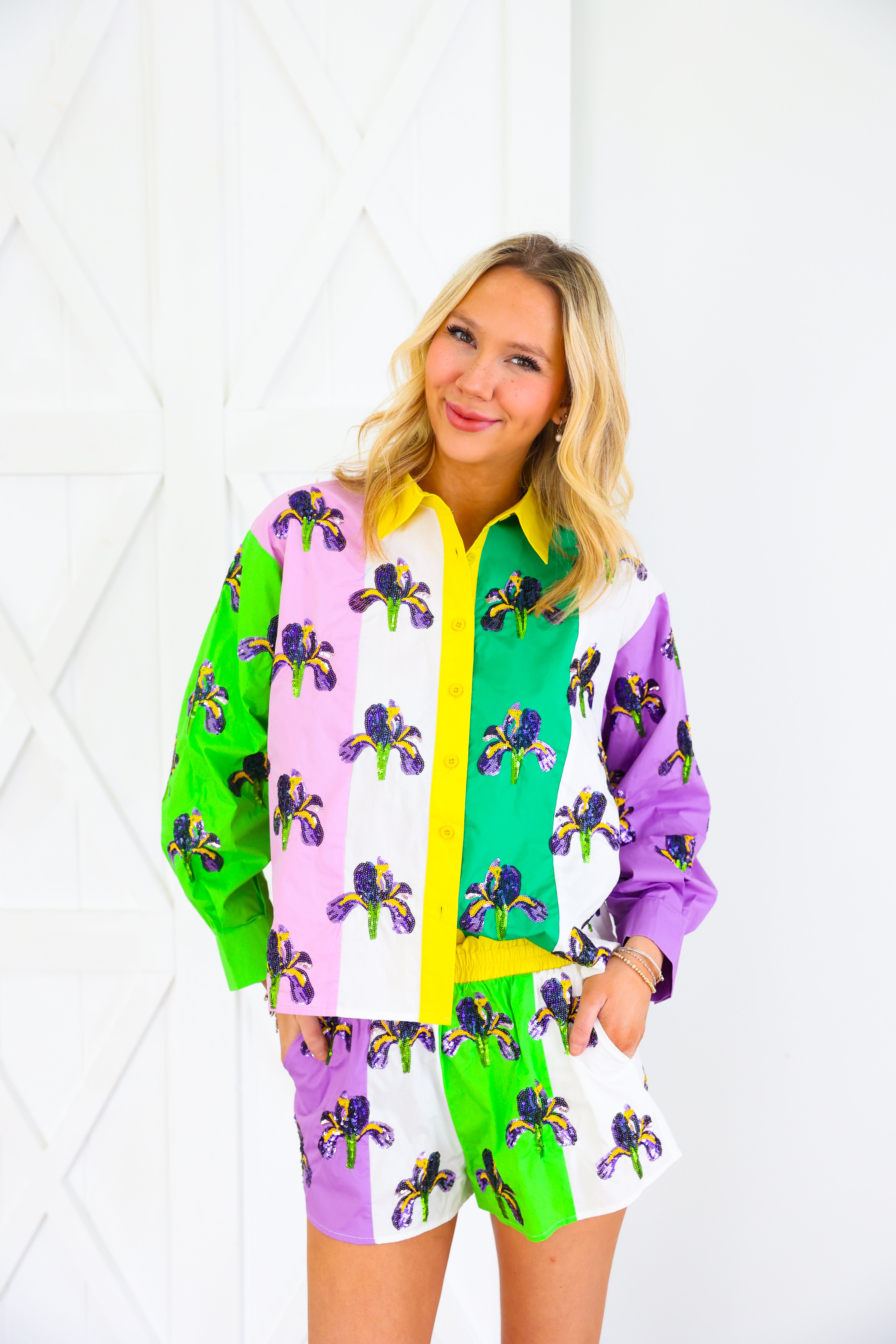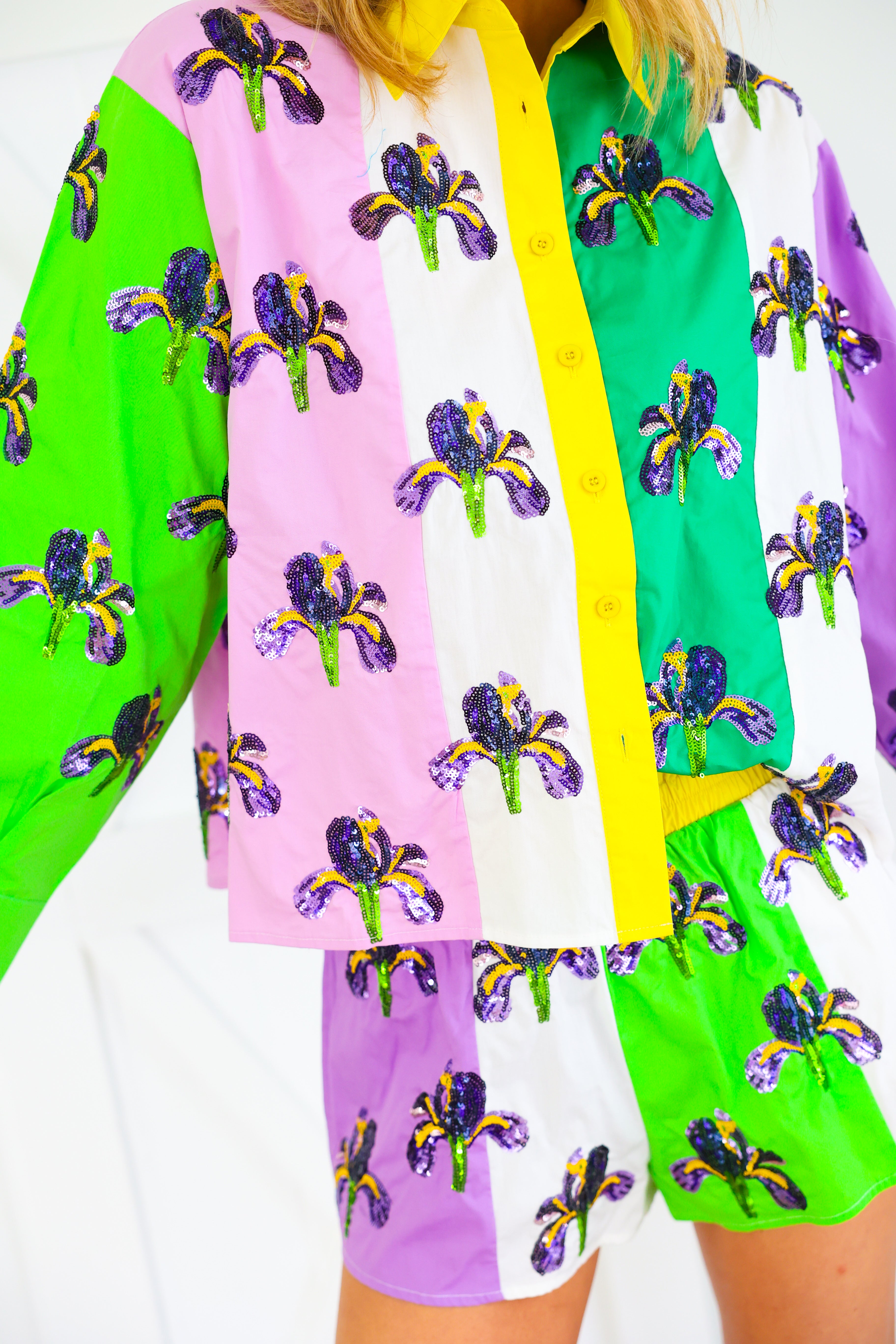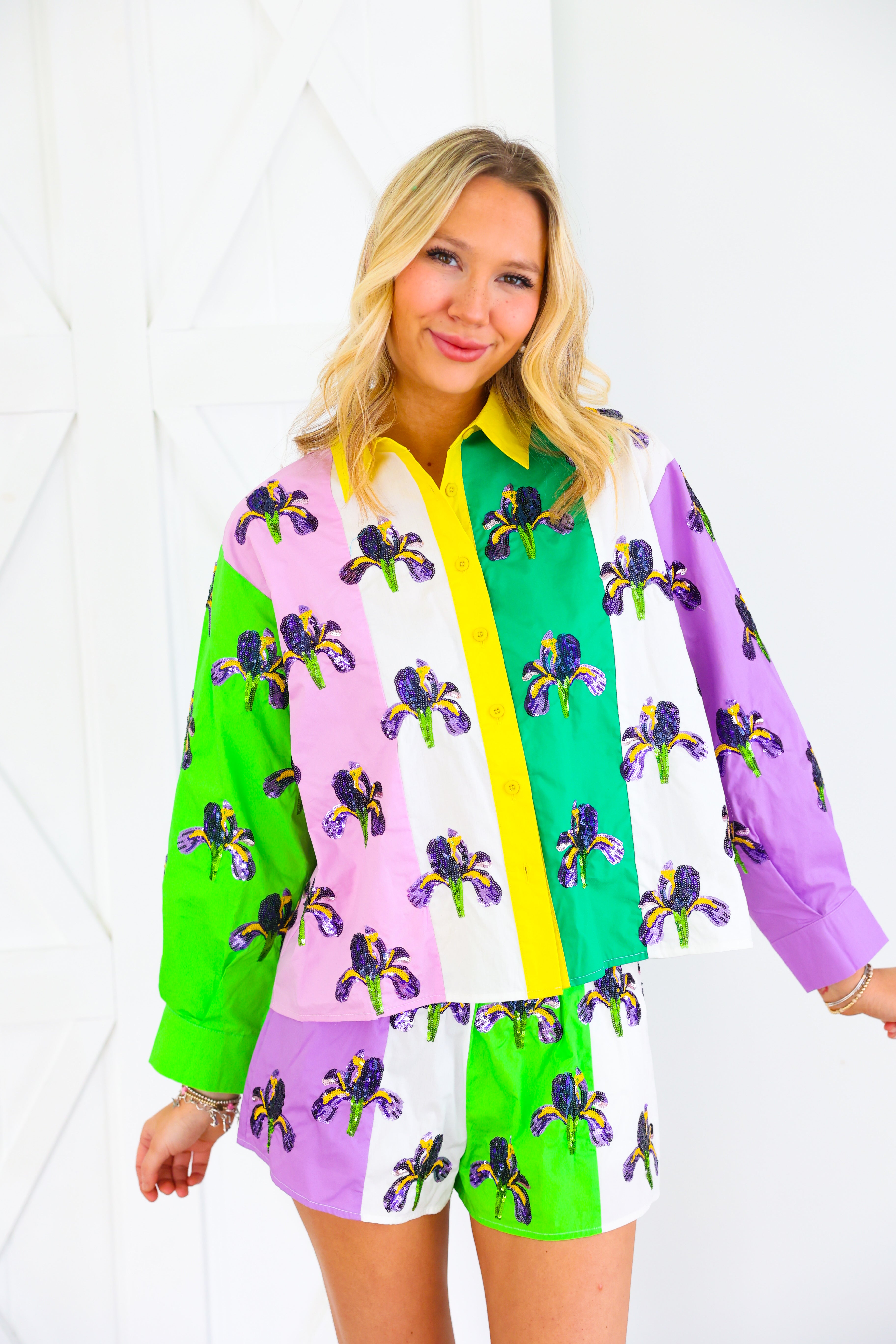 Purple, Green, Yellow & White Colorblock Iris Cotton Button Up Top Queen of Sparkles