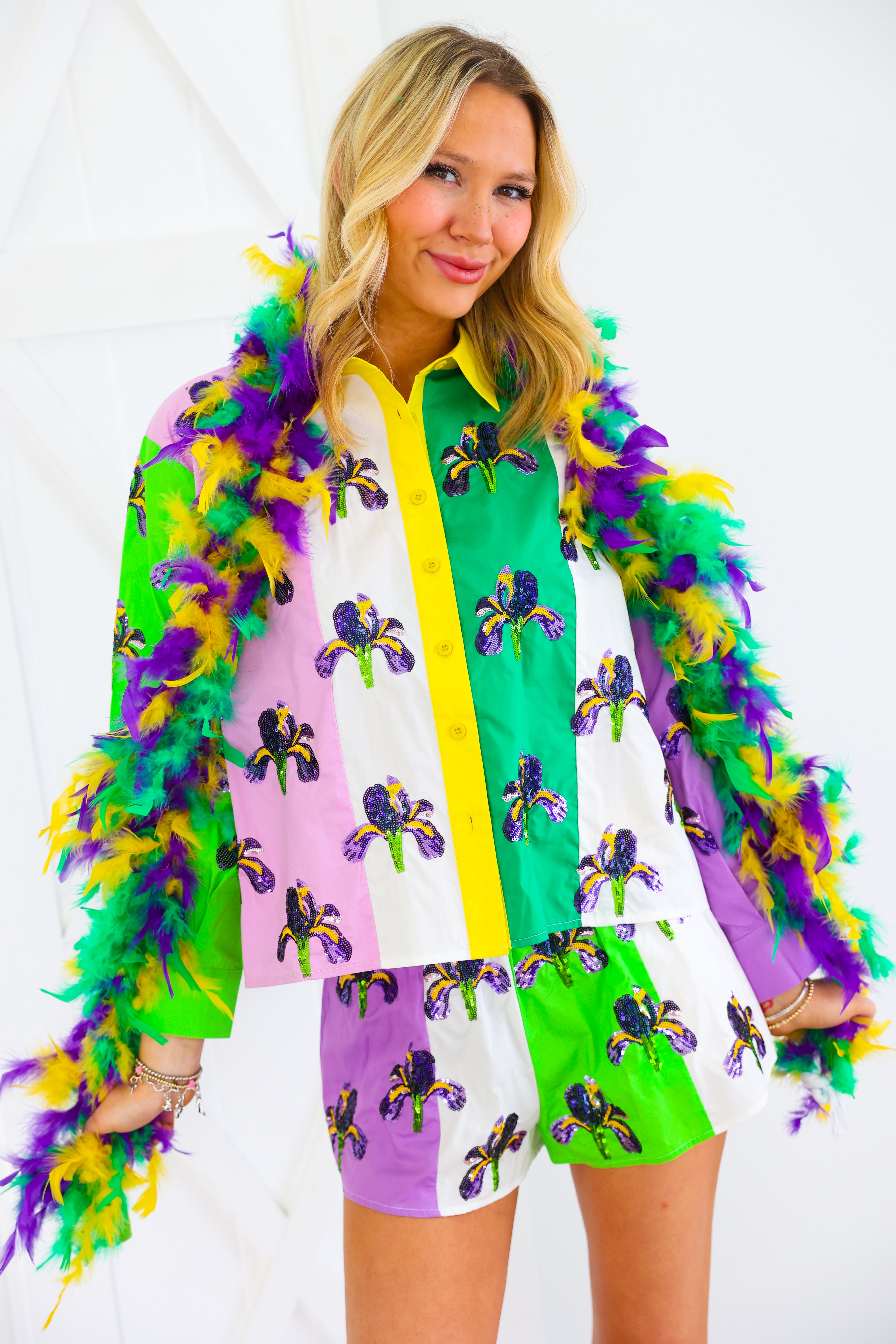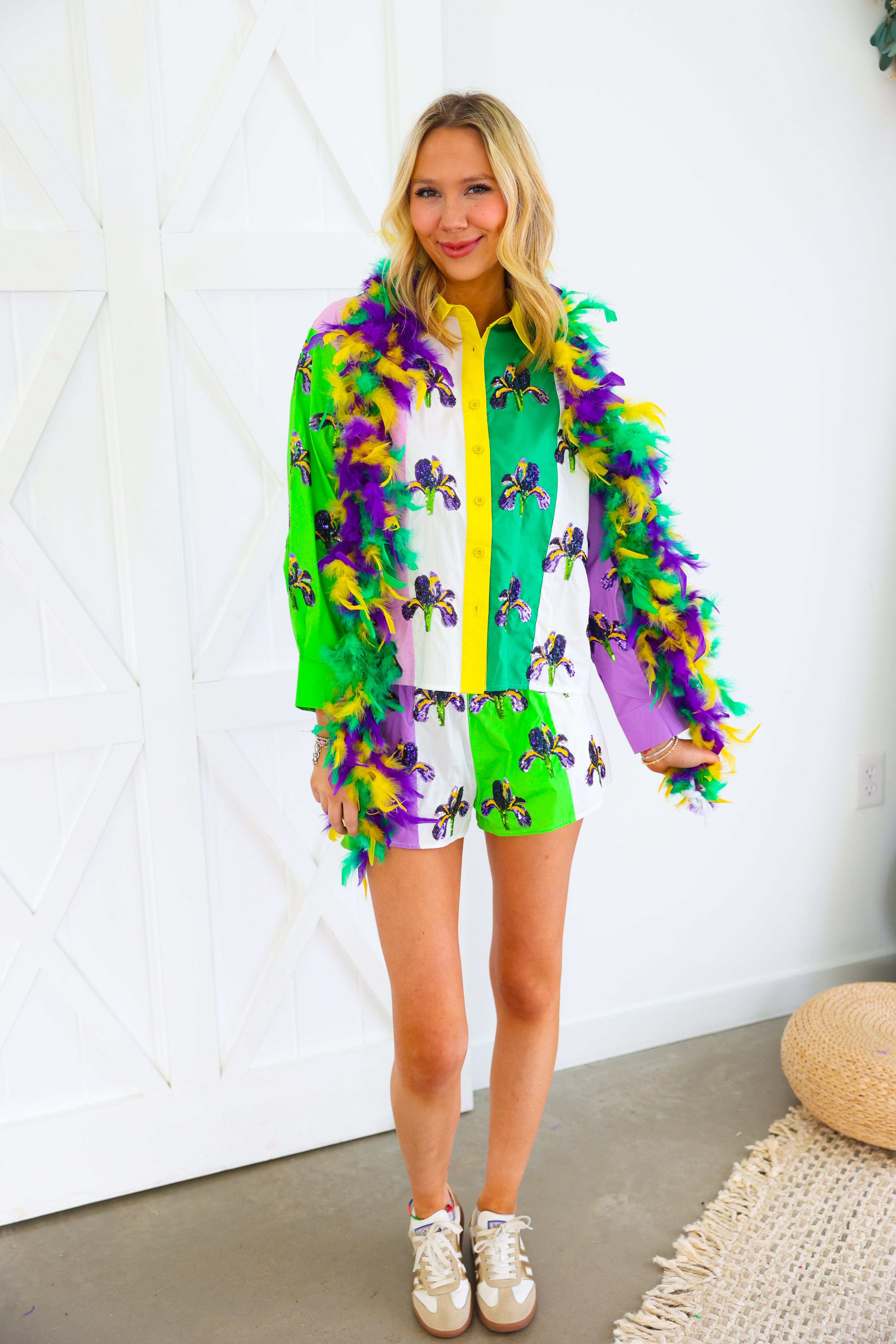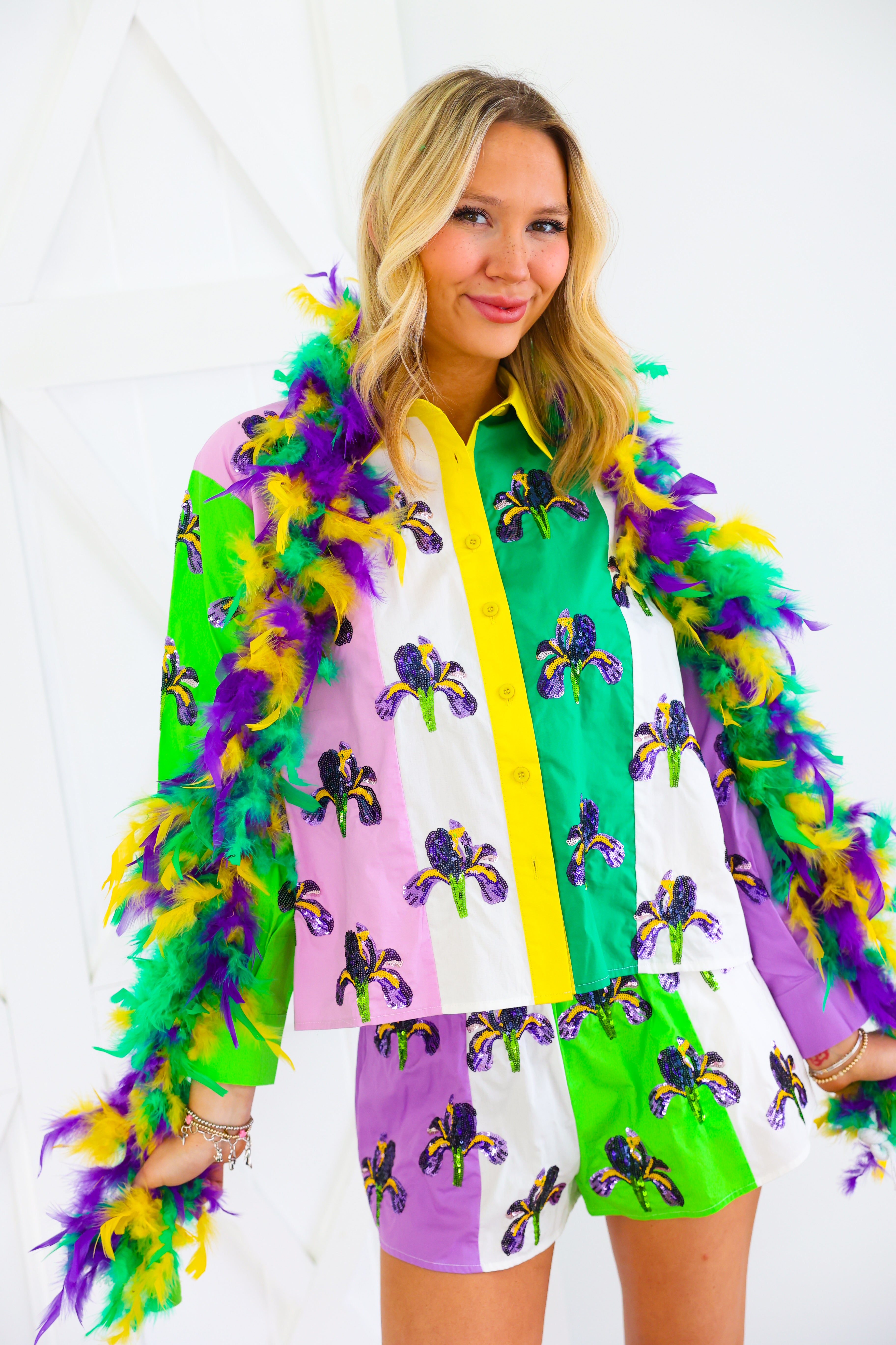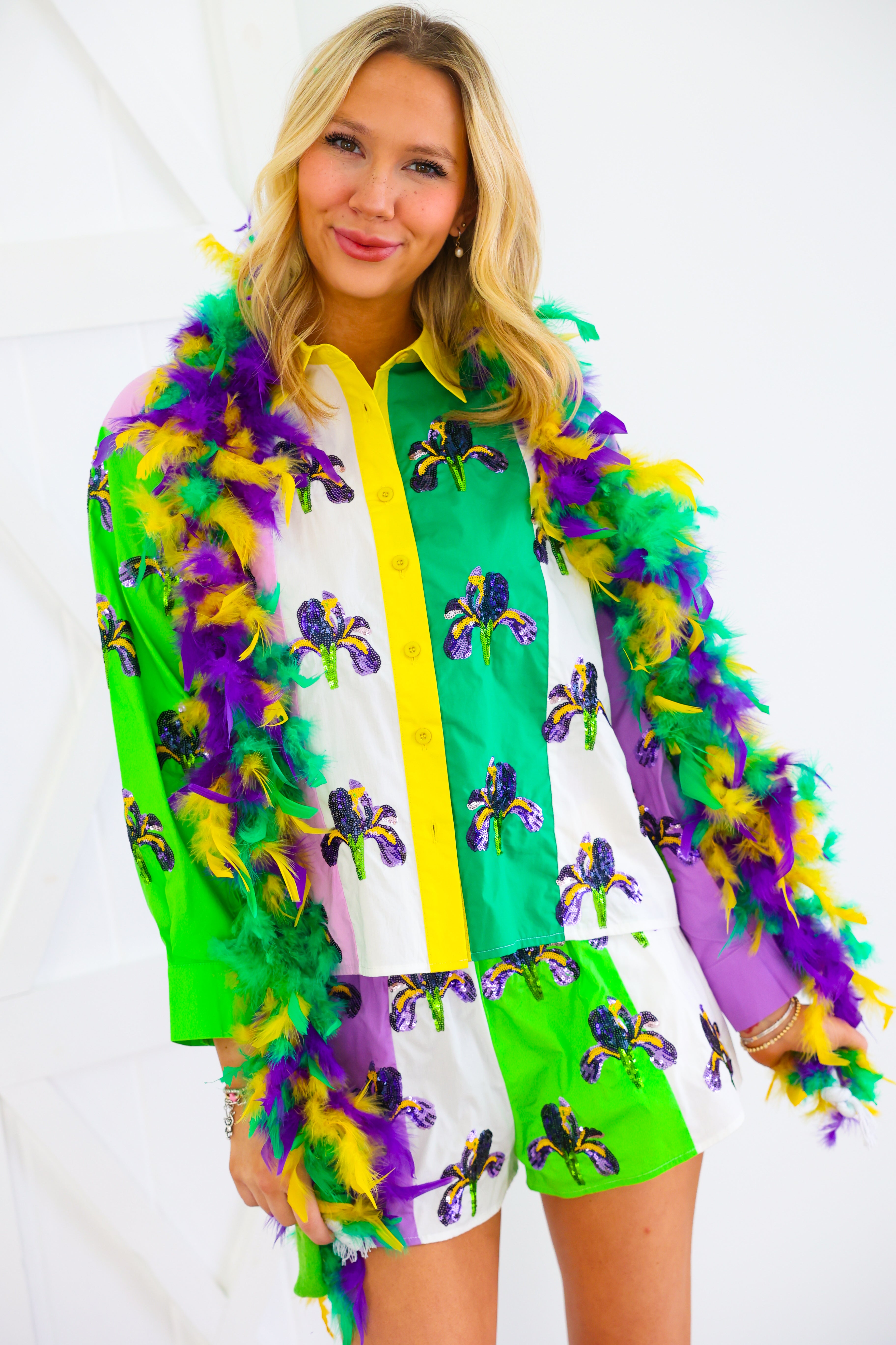Purple, Green, Yellow & White Colorblock Iris Cotton Button Up Top Queen of Sparkles