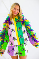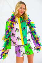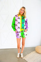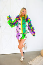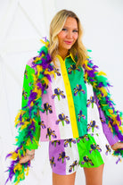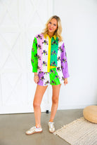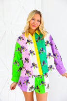 Make a statement with this vibrant colorblock button-up from Queen of Sparkles. Featuring bold purple, green, yellow, and white panels, the Iris top brings playful energy to any wardrobe. Crafted from soft cotton, it offers all-day comfort without sacrificing style. The classic button-up silhouette works seamlessly for casual outings or dressed-up occasions. Perfect for those who love color and aren't afraid to stand out, this piece instantly elevates your everyday look with personality and flair.