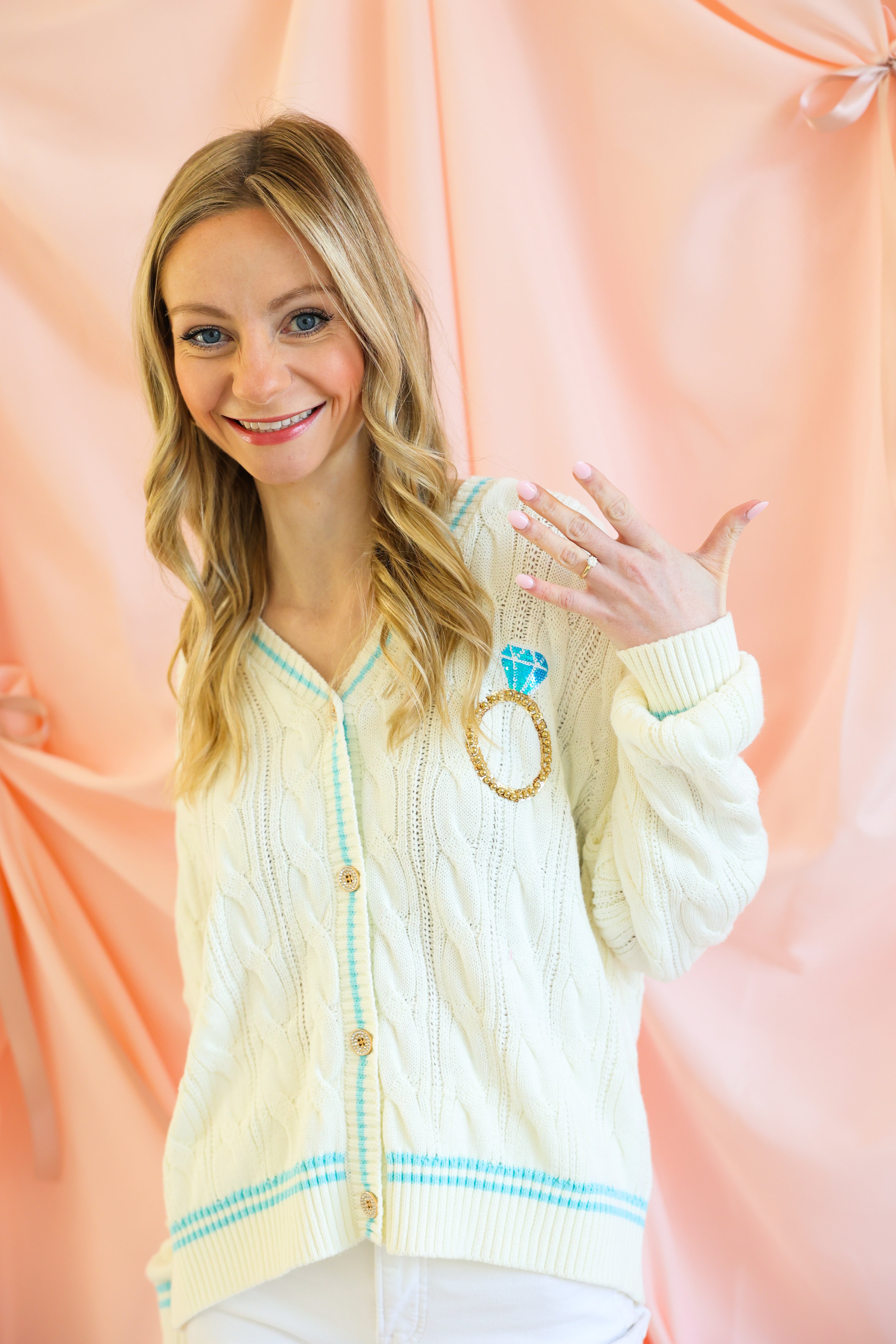 The cozy knit feel pairs beautifully with feminine detailing, making it perfect for bridal showers, bachelorette events, honeymoon travel, or simply embracing your bride era in style. Whether layered over a dress or styled with denim, this cardigan delivers timeless charm with signature Queen of Sparkles flair.