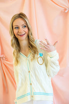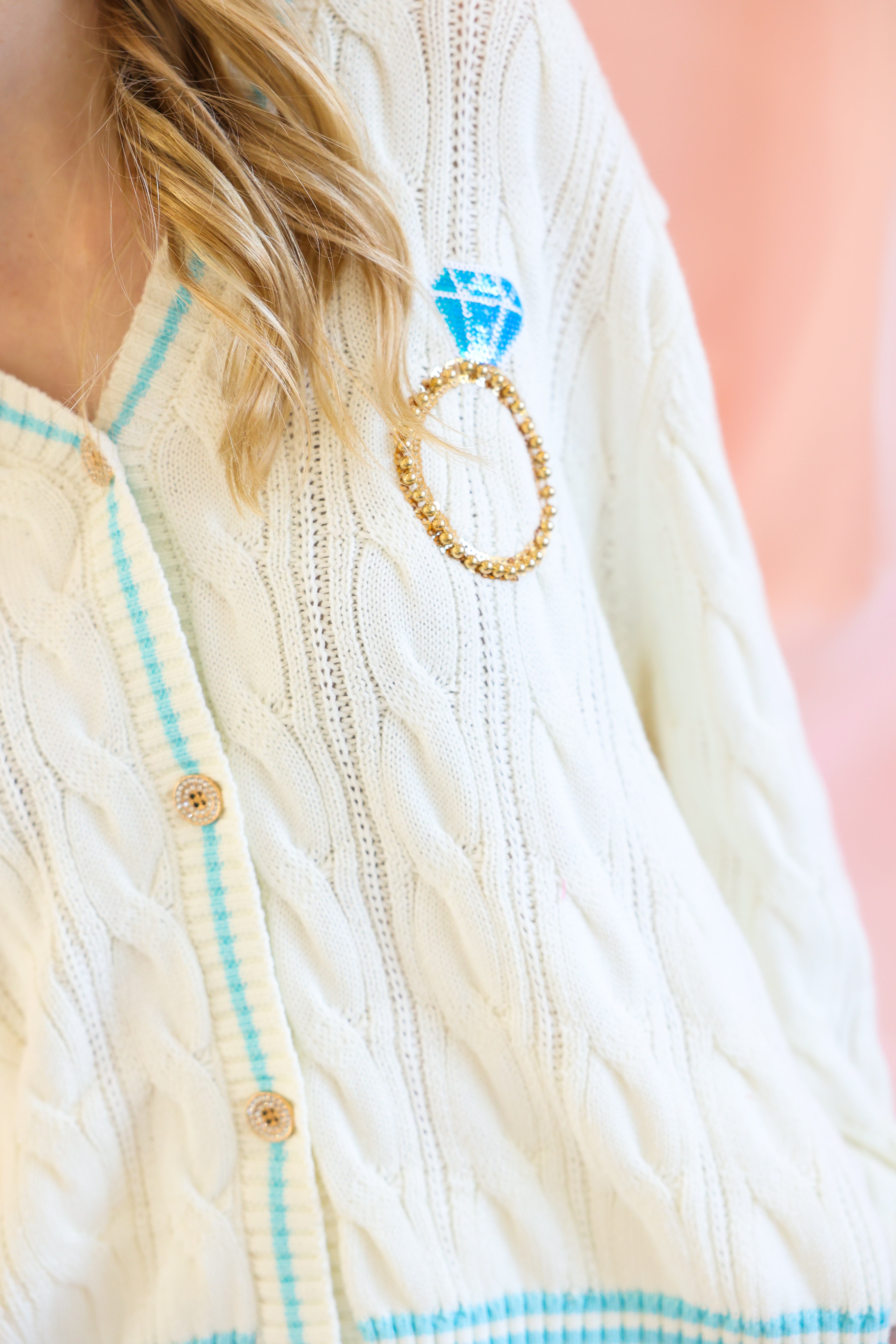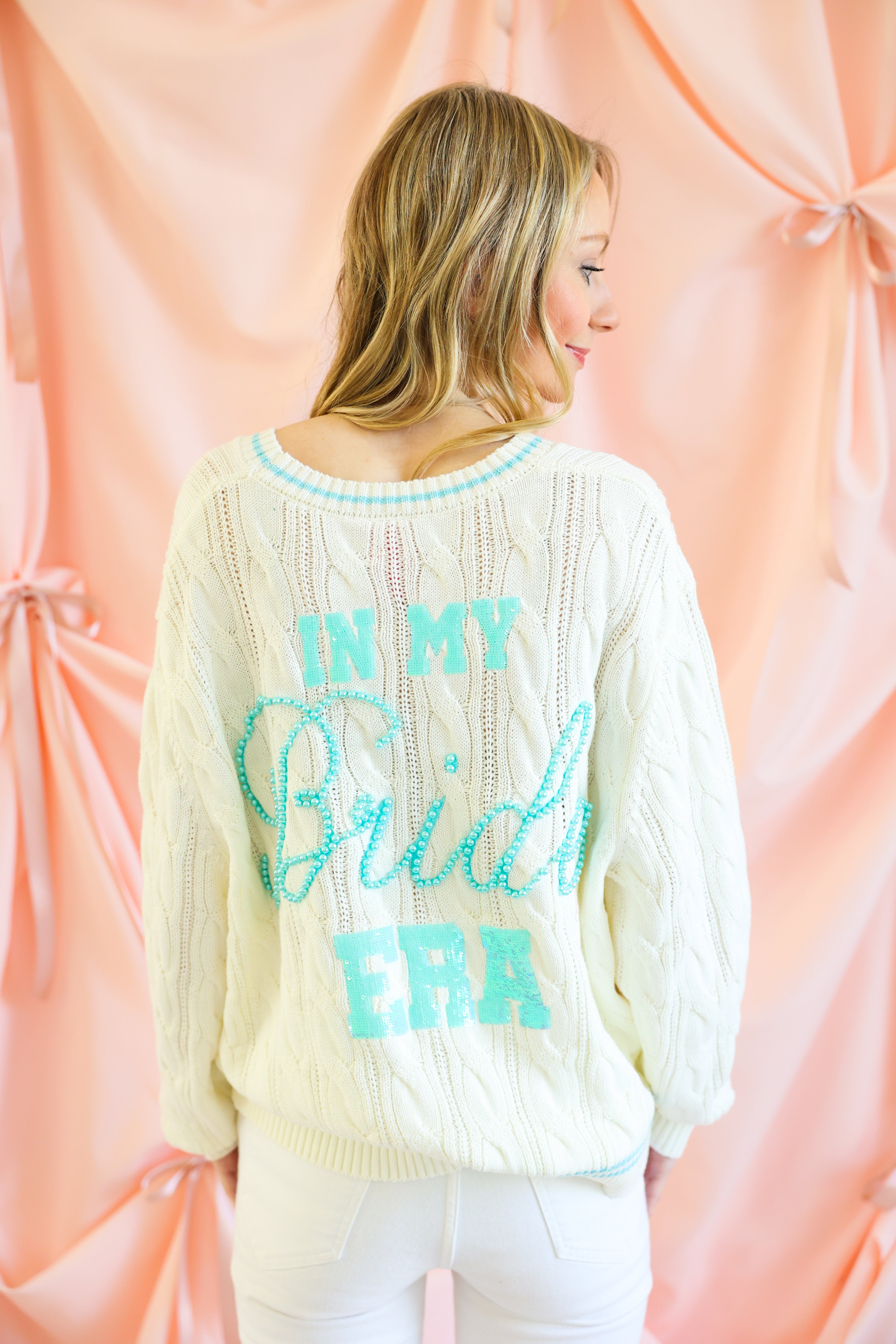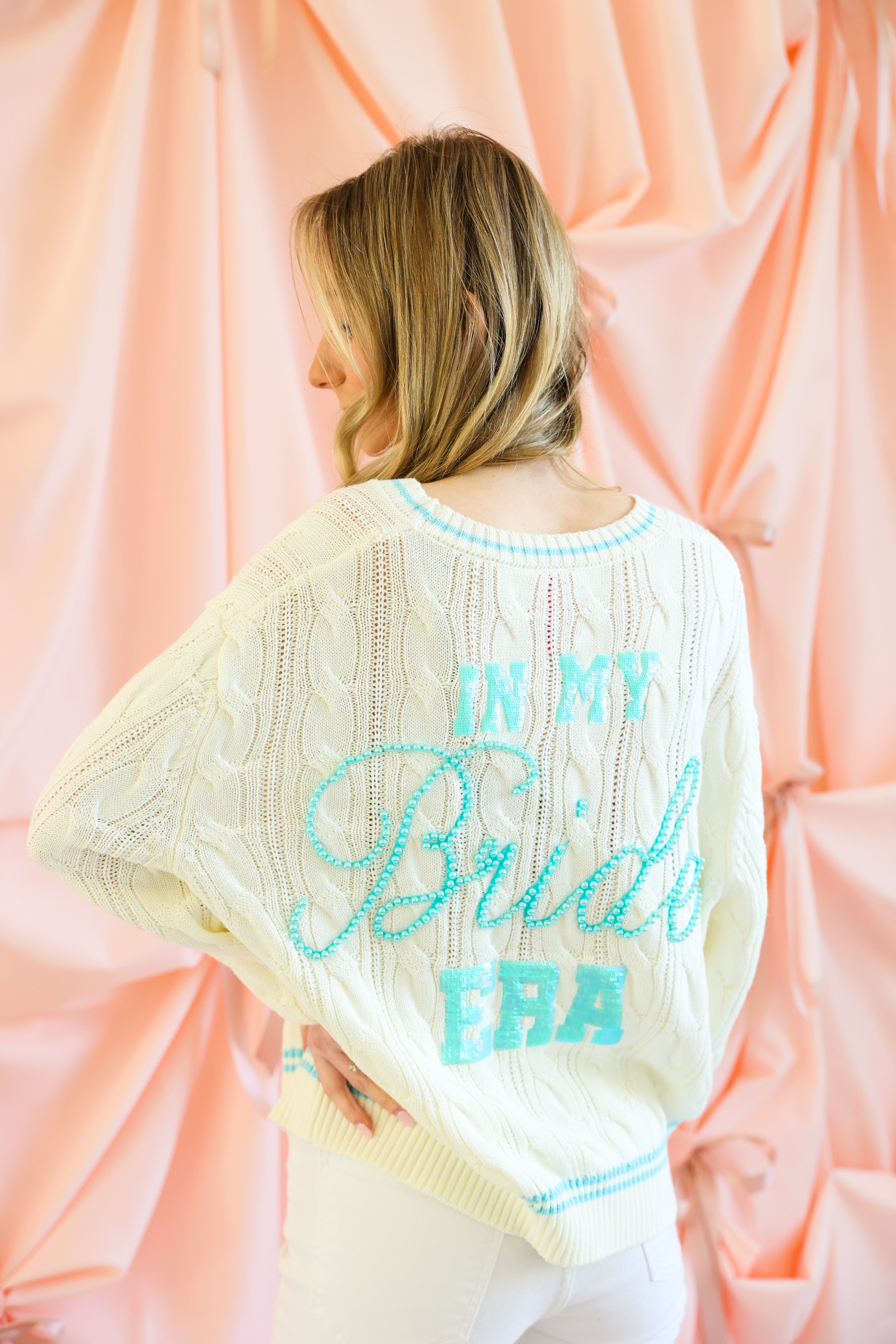 Soft, sweet, and sparkling in all the right ways, this Queen of Sparkles White & Blue “In My Bride Era” Cardigan is the ultimate celebration piece. Designed in a classic cable-knit silhouette, this button-up cardigan is elevated with delicate blue trim and a statement sequin-and-pearl “In My Bride Era” embellishment for a chic bridal moment.