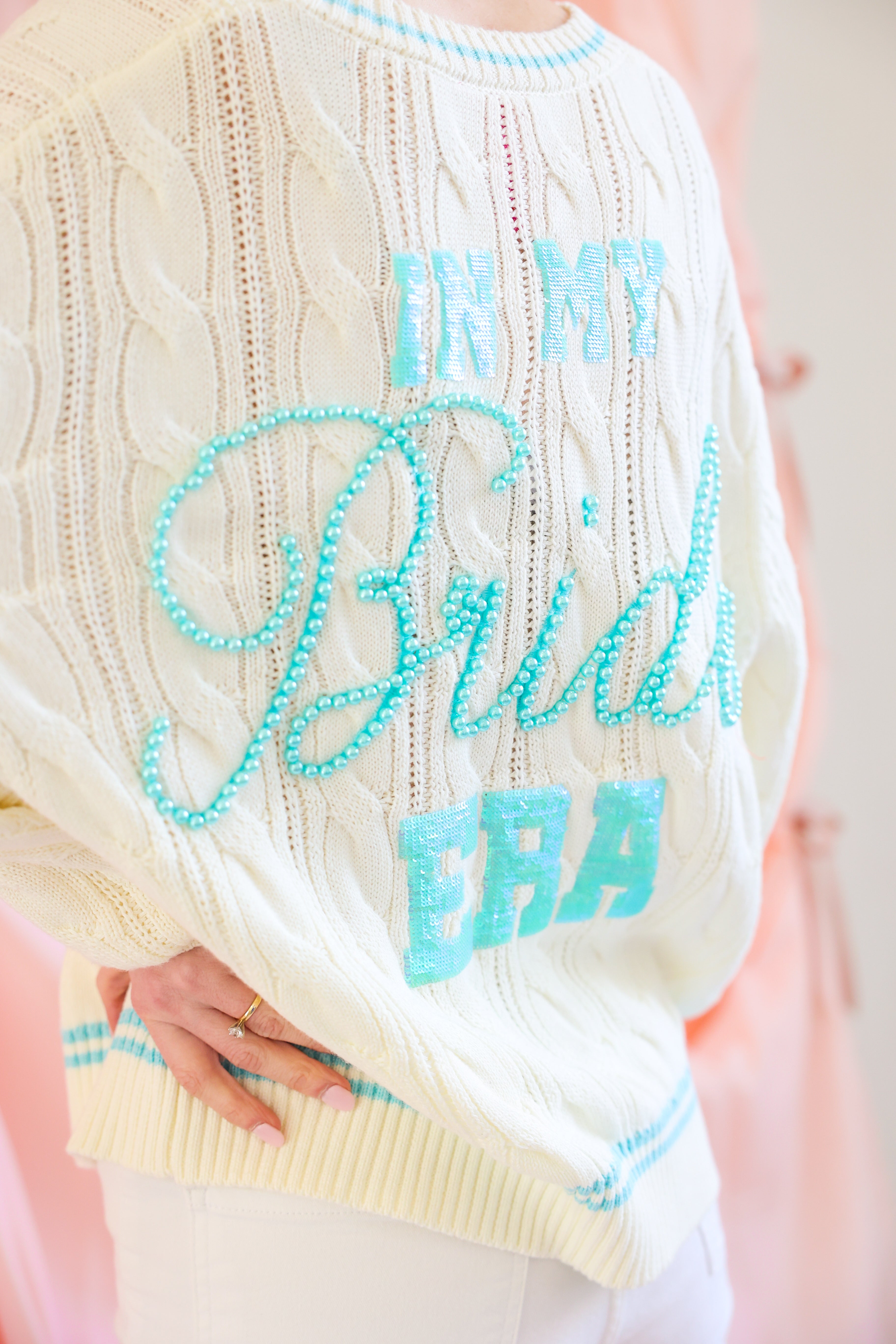 “In My Bride Era” sequin and pearl embellishment