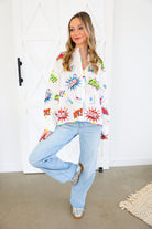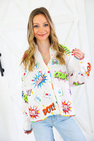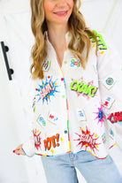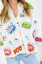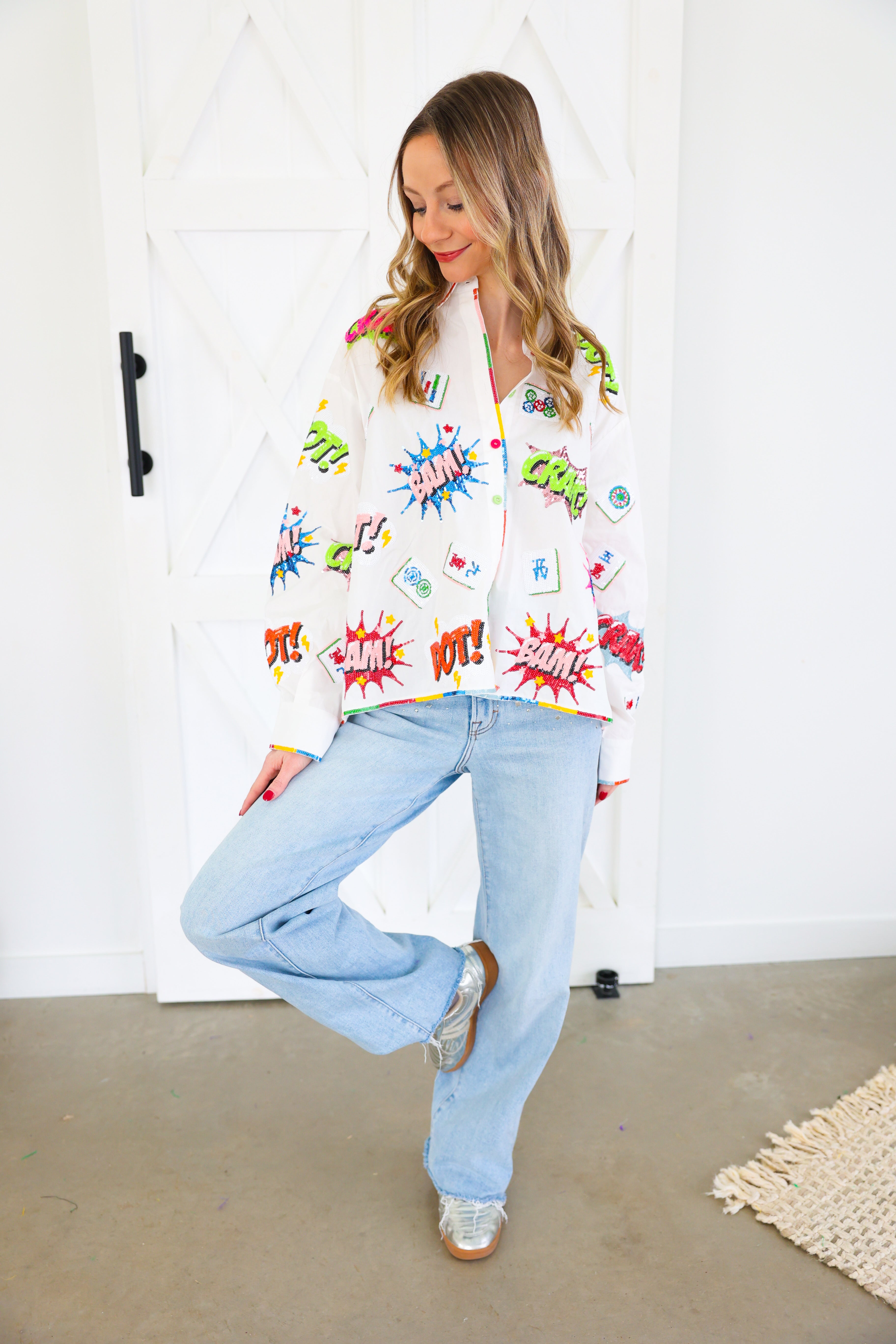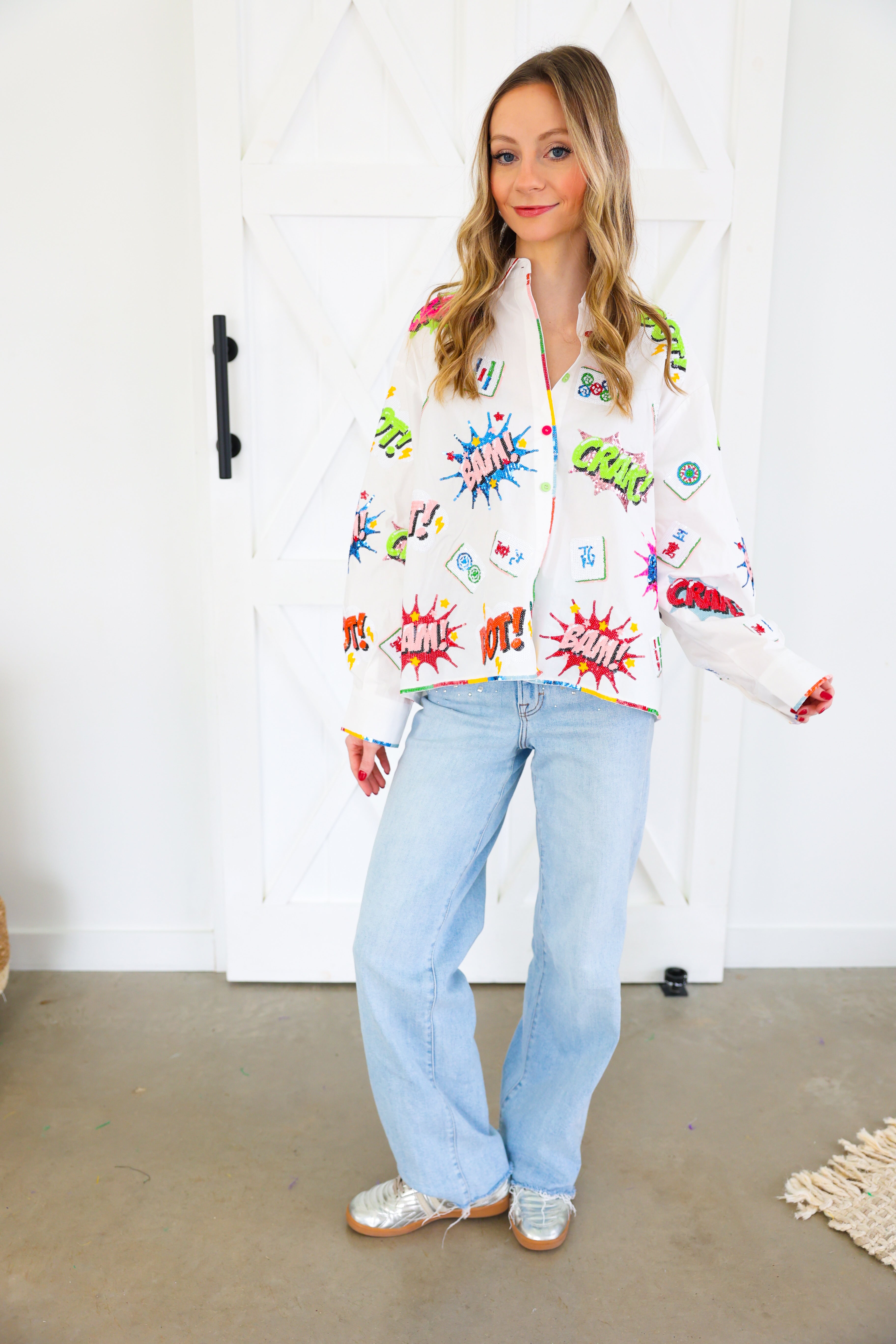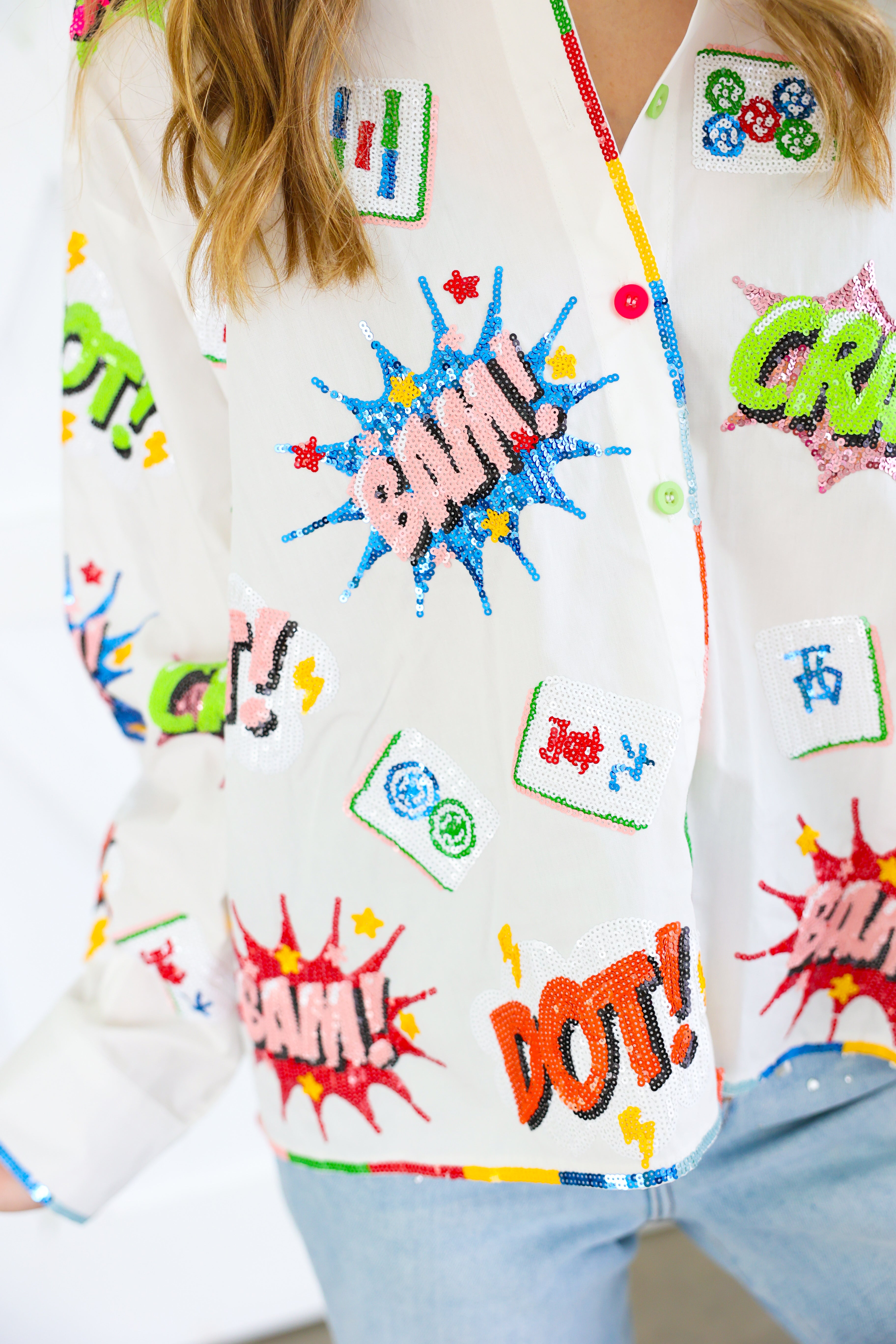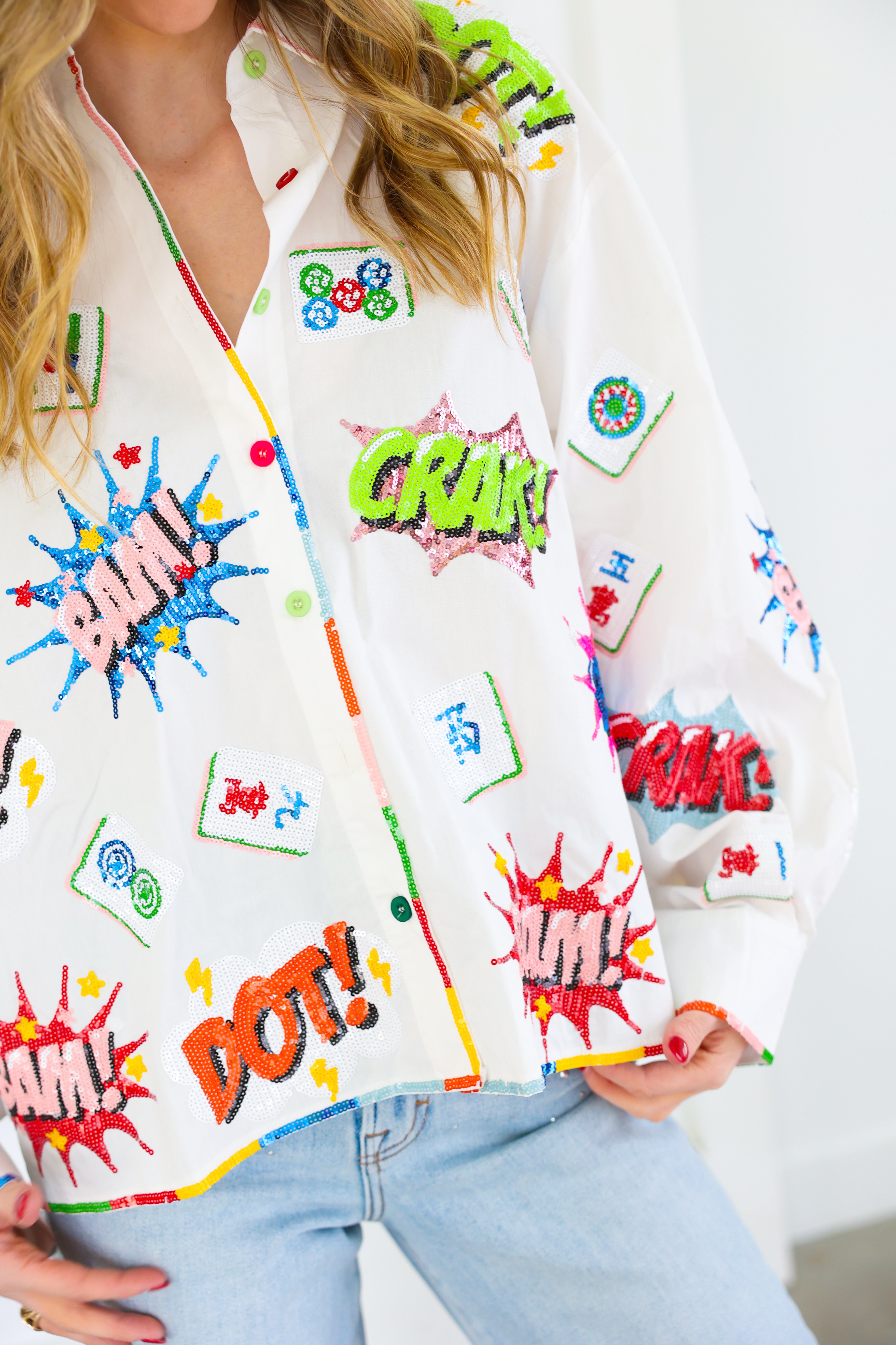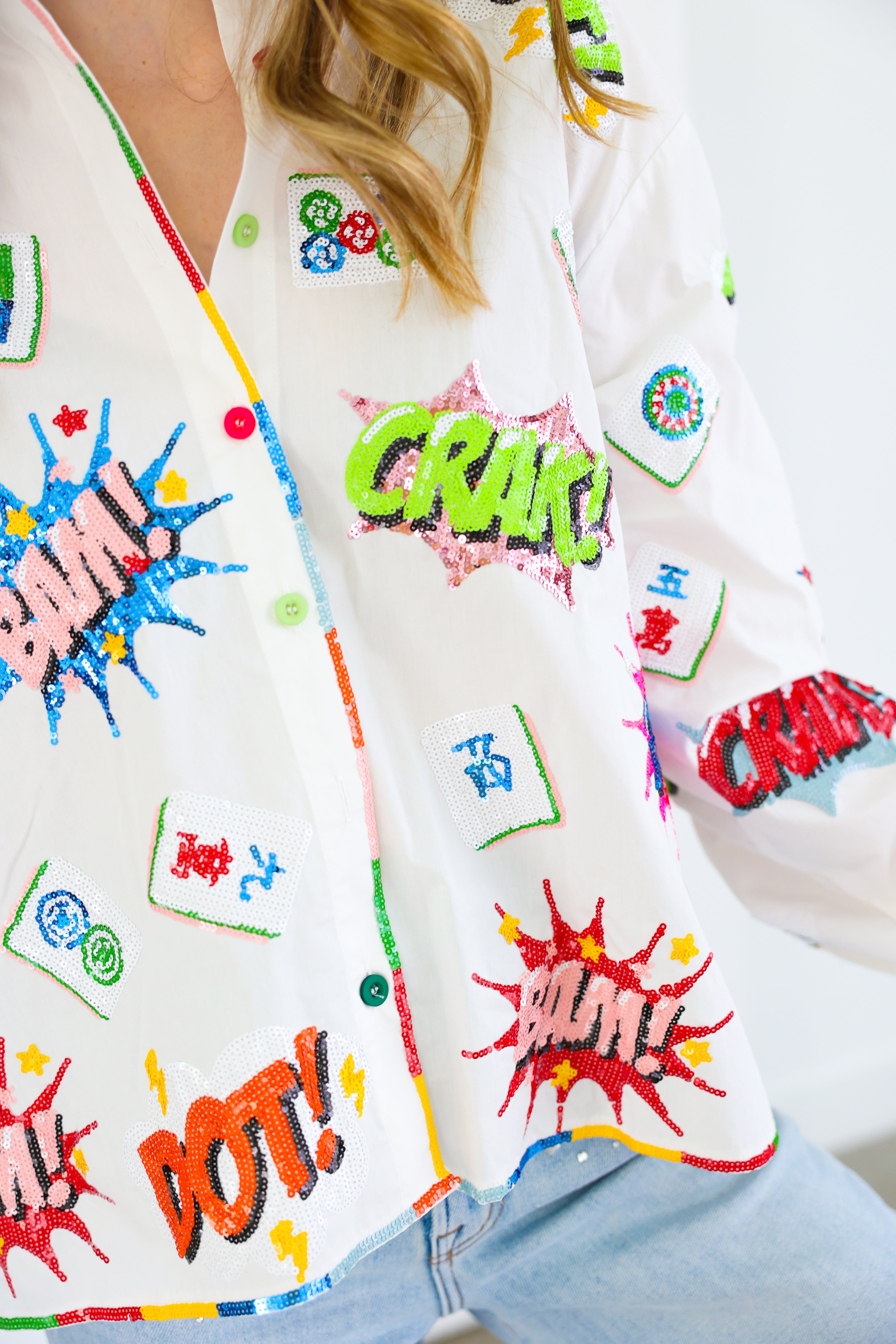 Make your game night fashionably iconic with the Queen of Sparkles White Mahjong Icon Rainbow Trim Collar Top 🀄🌈✨ This playful button-up is covered in bold, sparkly Mahjong-inspired patches and comic-style phrases like DOT!, BAM!, CRAK!—each embellished with Queen of Sparkles’ signature sequins and beadwork. The rainbow trim along the collar, sleeves, and button placket adds a fun pop of color that ties the entire vibrant look together. Pair it with the matching Mahjong shorts for the ultimate statement set!