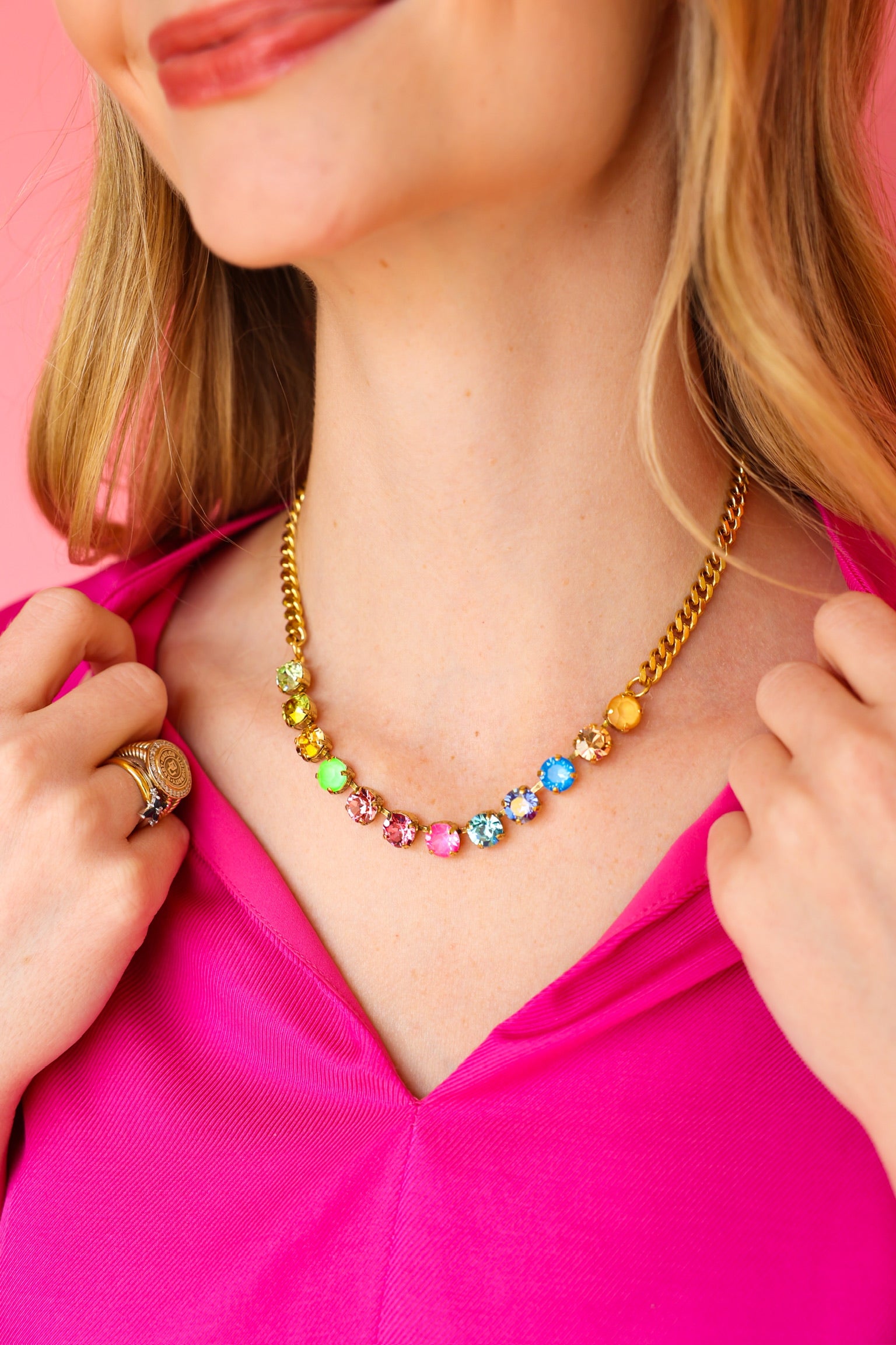 Glimmer and shine in this Mini Oakland Antique Watermelon ! This stunning necklace is gold-plated in brass, and lined with high-quality crystals. Perfect for any occasion, this 13" necklace with a 3" extension has you covered from day to night. Made in Canada for that extra special touch!