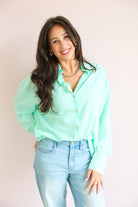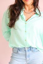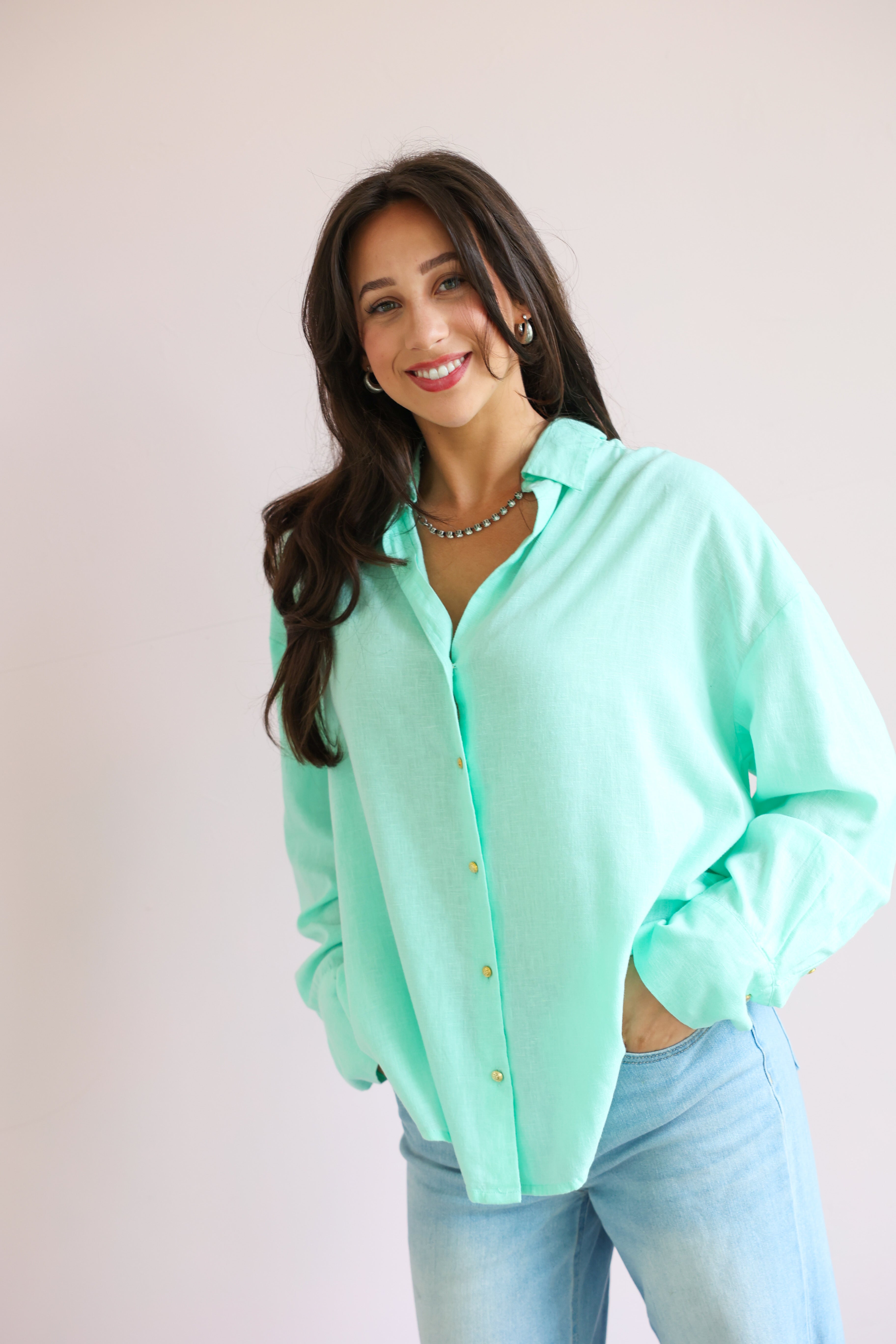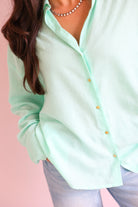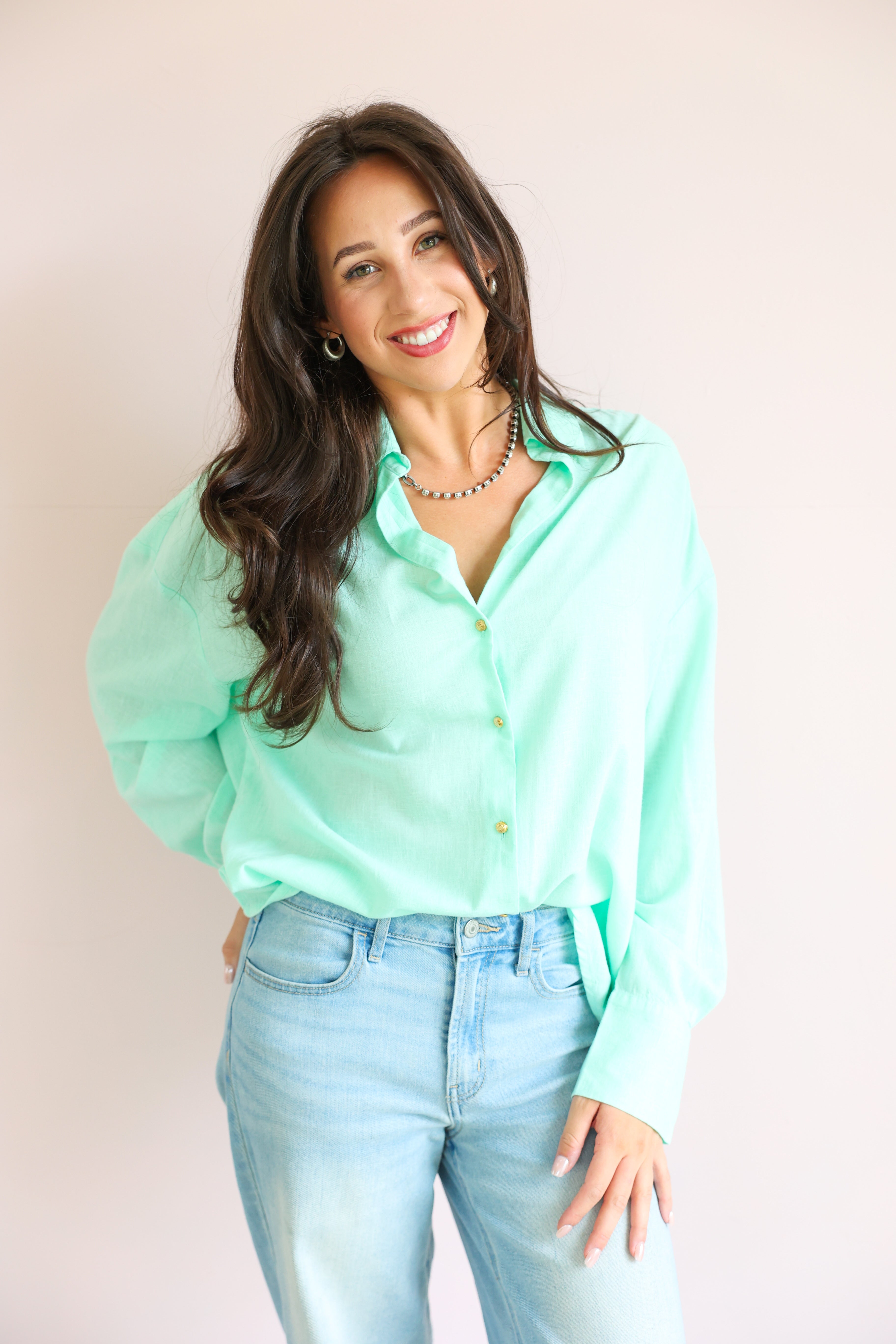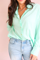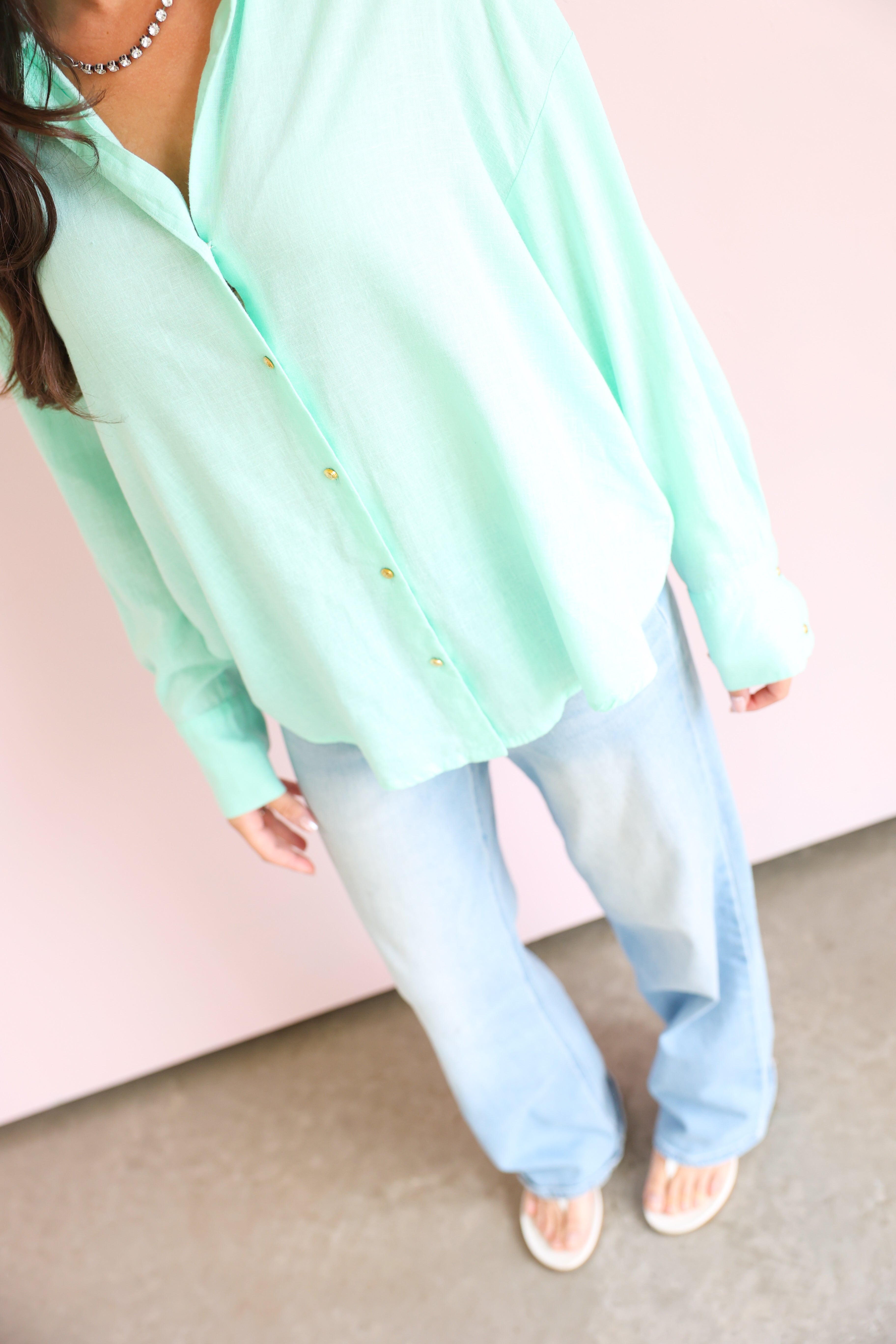 Designed with a classic button-down front and lightweight fabric, this top feels breezy while still looking put together. The soft mint hue adds a subtle, refreshing touch that’s perfect for spring and summer styling.