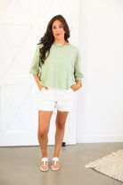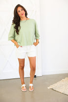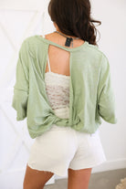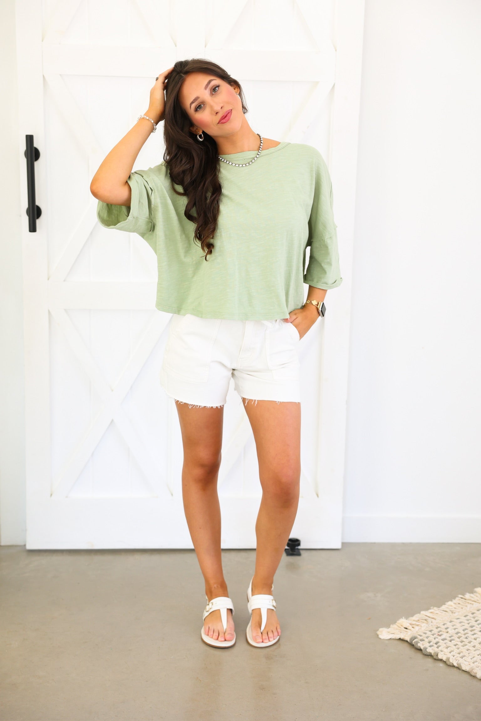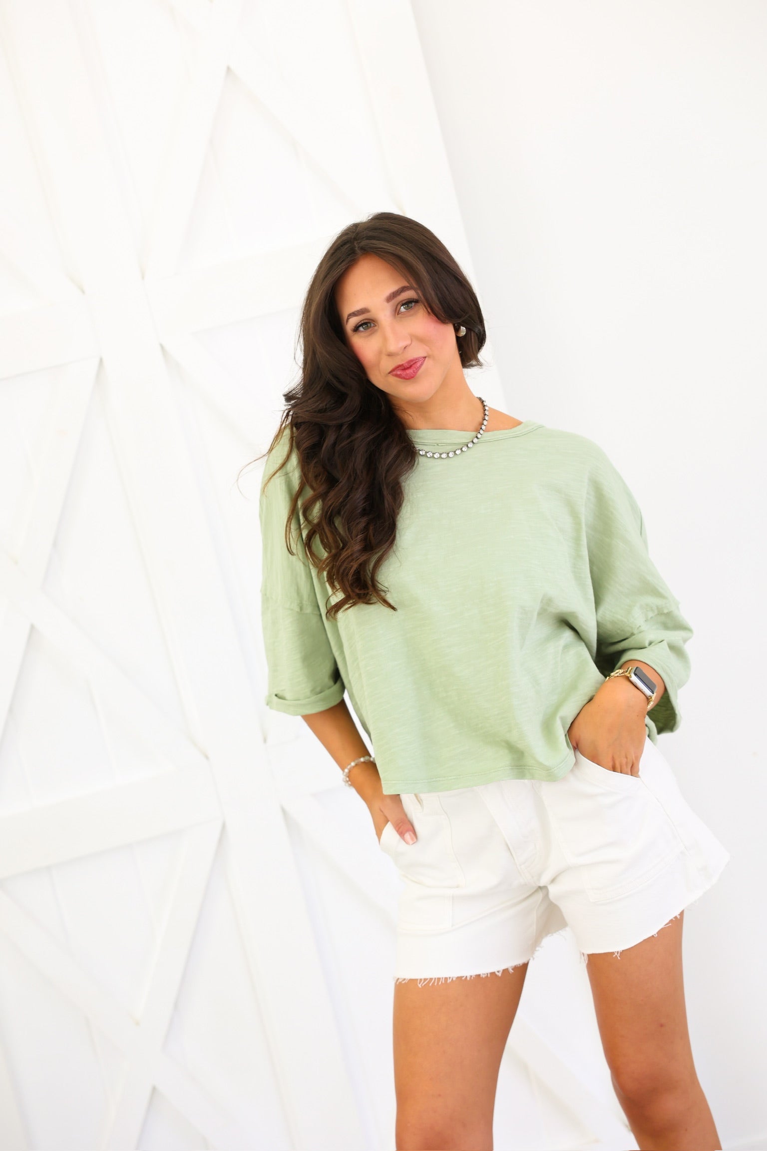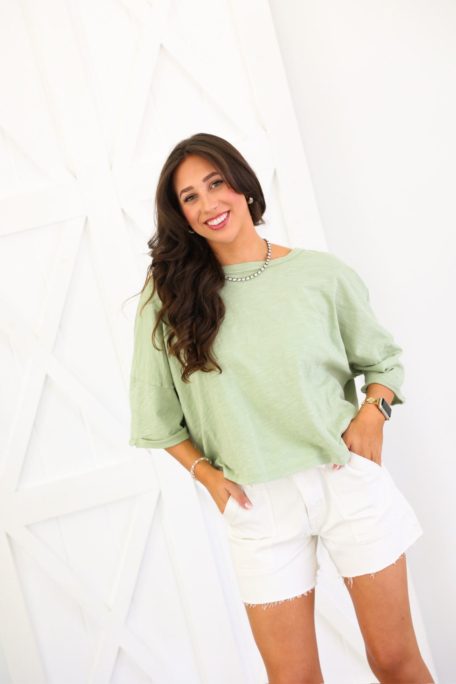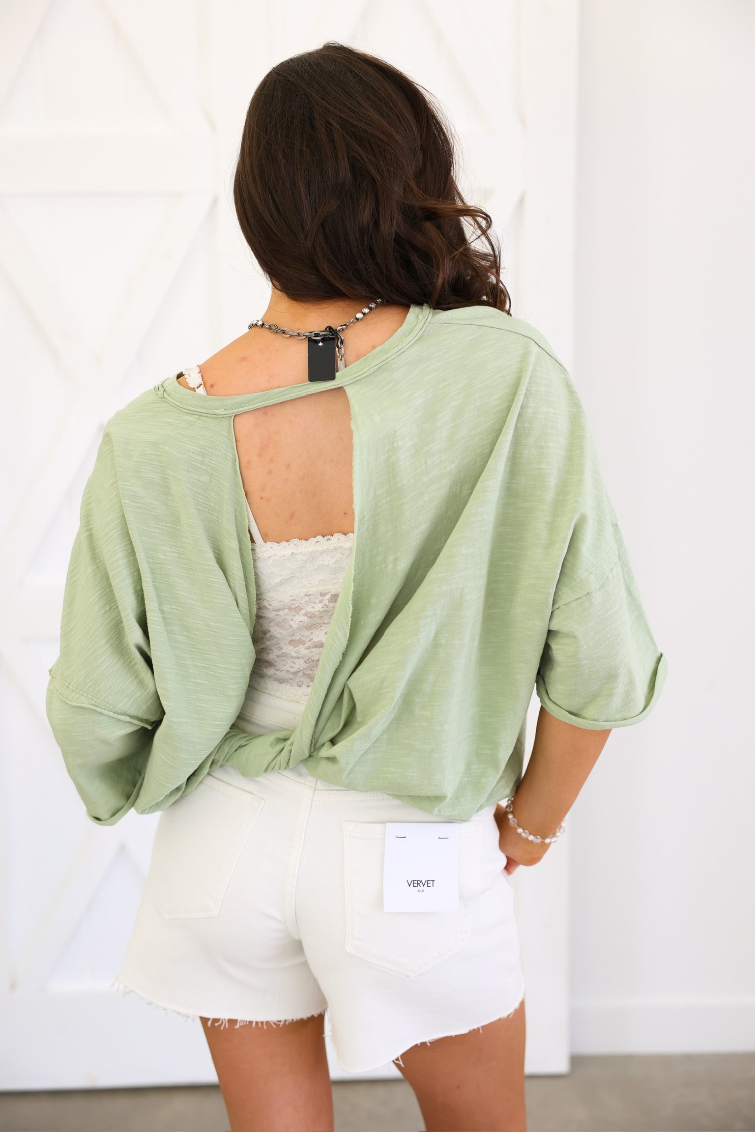 This tee is the perfect mix of laid-back and elevated. Featuring a soft mineral green hue and a subtle twist detail, it adds a fresh, earthy feel to your everyday wardrobe while still keeping things effortlessly polished.