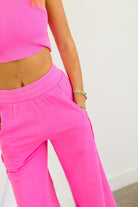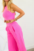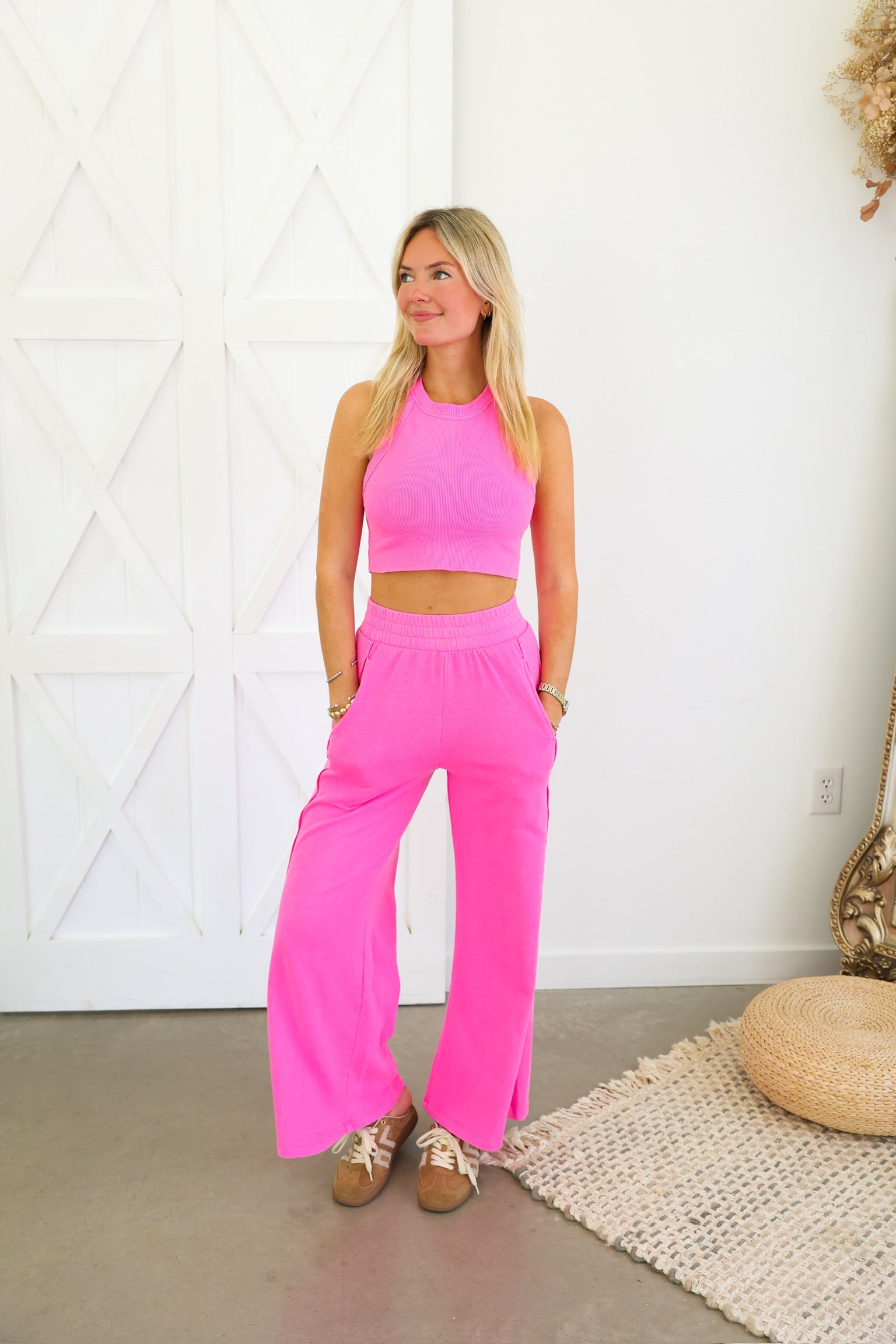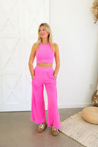 This set is bold, vibrant, and made to stand out. Featuring a striking fuchsia hue, it instantly adds a fun, confident energy to your look. The halter neck crop top creates a sleek, flattering silhouette, while the flowy wide-leg pants bring movement and effortless style.