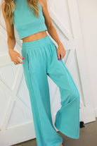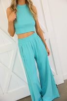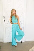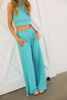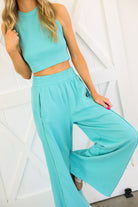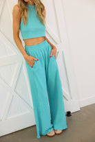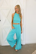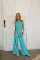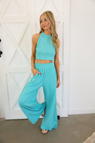 This set is the perfect blend of bold color and effortless style. Featuring a vibrant neon aqua hue, it brings a fresh, eye-catching energy while still feeling sleek and elevated. The halter neck crop top creates a flattering, modern silhouette, paired perfectly with the flowy wide-leg pants.