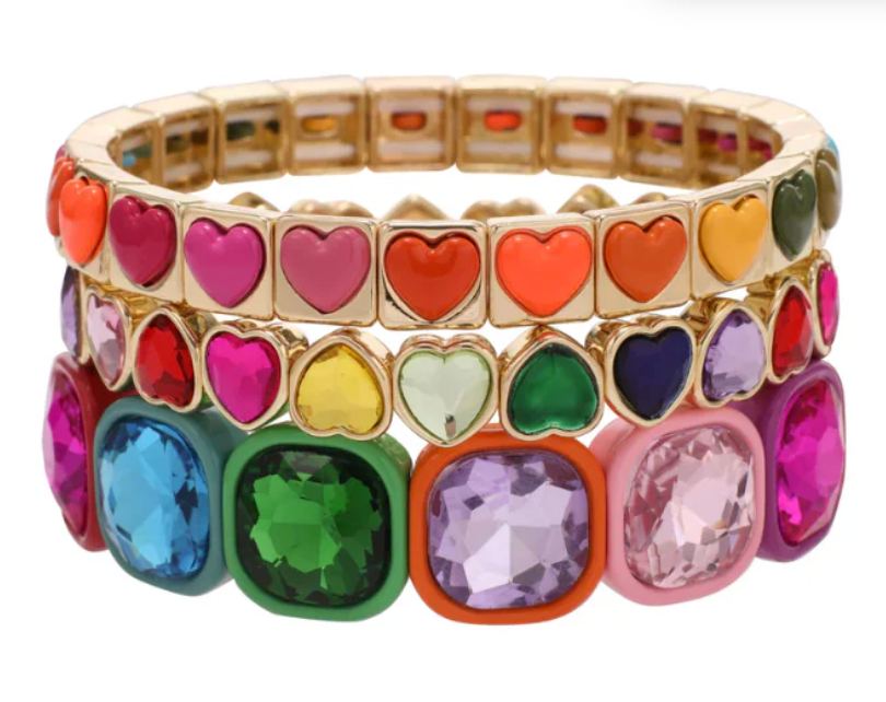A colorful stack of heart-shaped beads designed to add instant joy to any outfit. Perfect for layering or wearing solo for a playful pop of color.