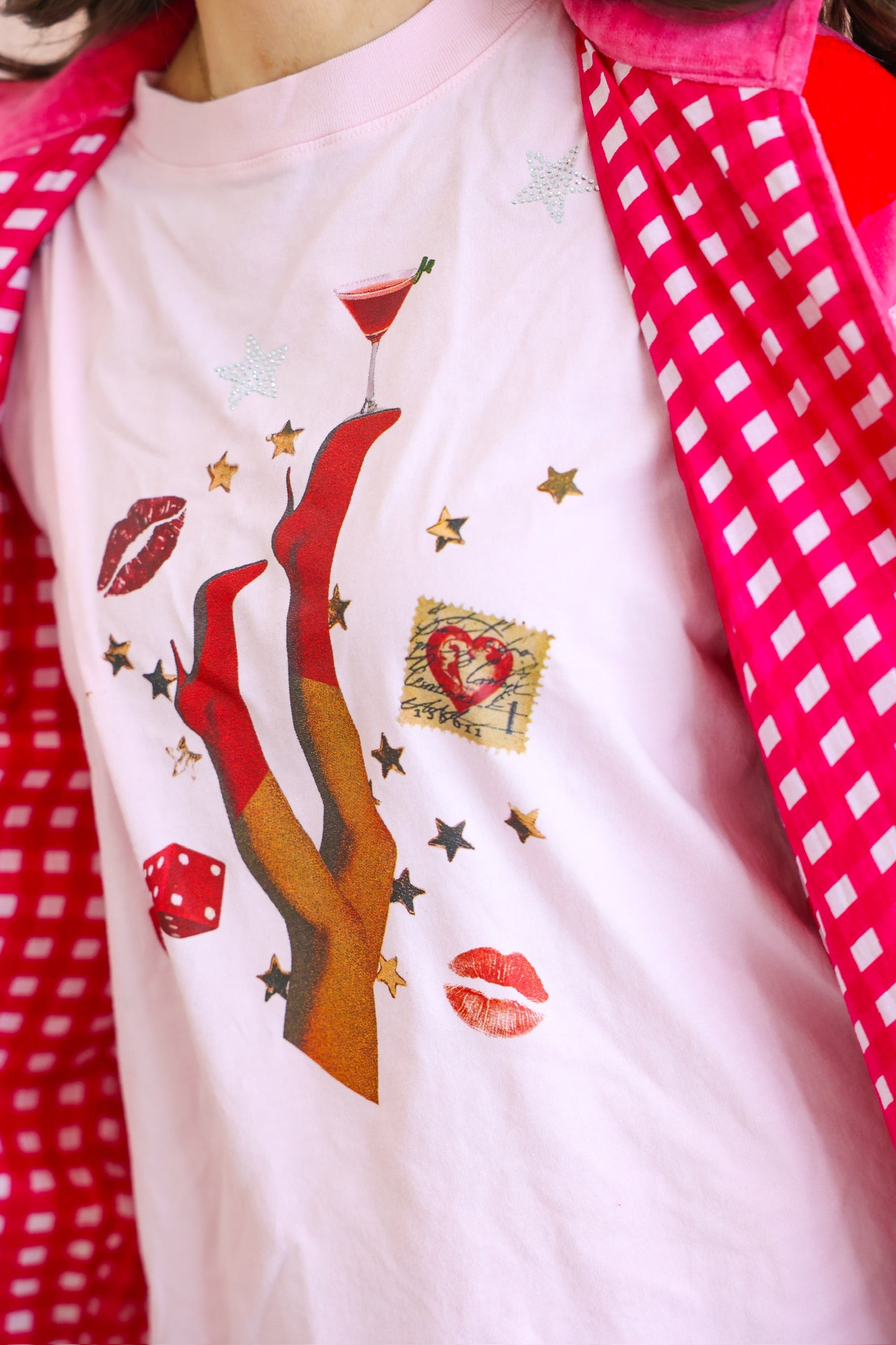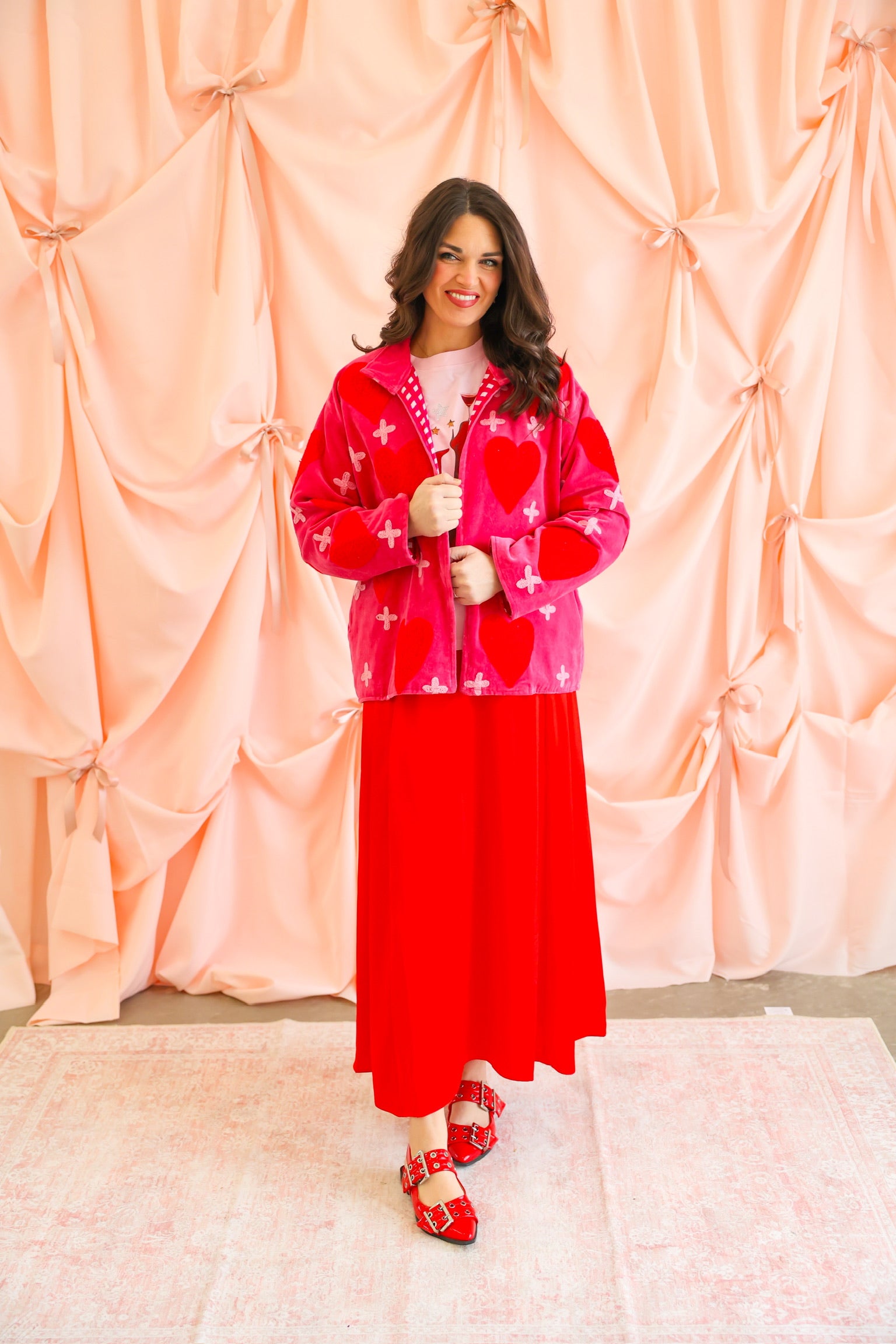 Make a bold statement in this standout velvet jacket by Chap and Graham Designs. Rich in color and symbolism, this eye-catching layer features oversized red heart motifs accented with subtle cross details, all set against a plush pink velvet base. Thoughtful contrast gingham trim at the cuffs and lapel adds a playful, tailored finish, while the relaxed silhouette makes it easy to style over everything from crisp button-downs to casual tees.