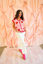 Whether styled for Valentine’s Day, Galentine’s brunch, or just because, this statement vest adds instant personality and sparkle to any outfit.