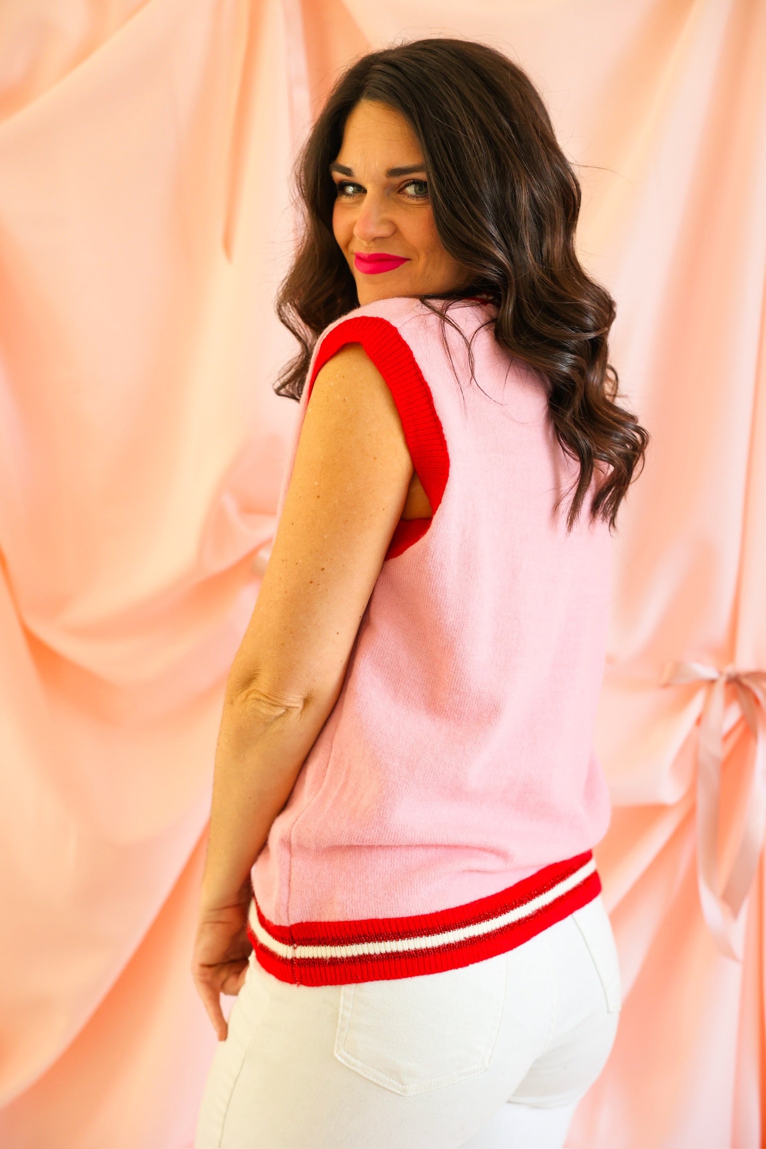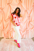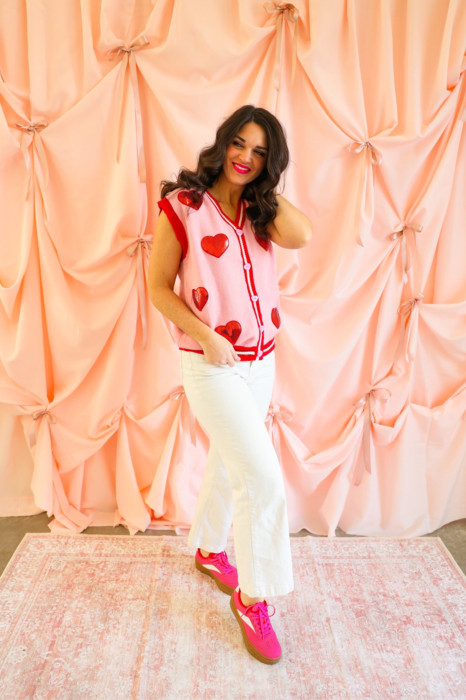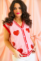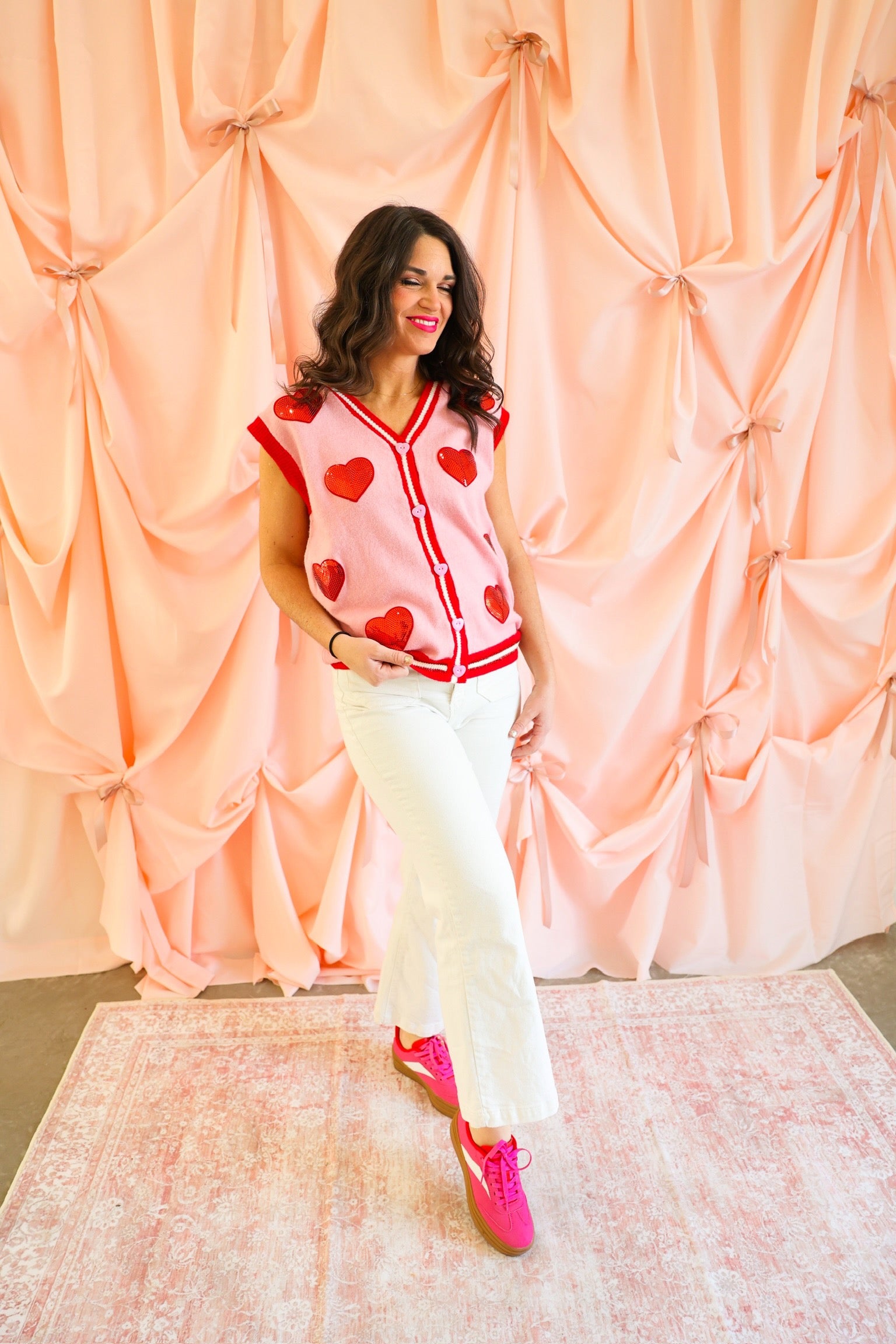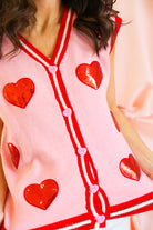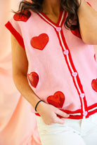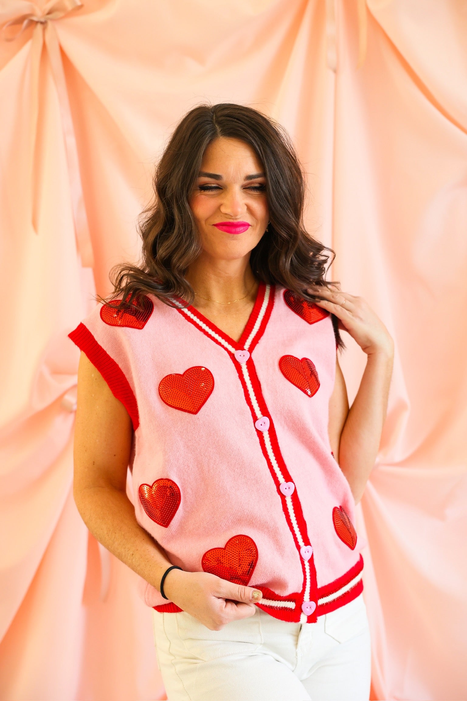 Sweet, sparkly, and impossible to miss 💖 The Sequin Hearts Sweater Vest in Pink brings playful Valentine charm with a vintage-inspired twist. Designed with shimmering red sequin heart appliqués scattered across a soft pink knit, this vest features bold red varsity-style trim and a classic button-front closure for an effortlessly fun look. The relaxed, stretchy fit makes it ideal for layering over blouses, sheer tops, or lightweight knits.