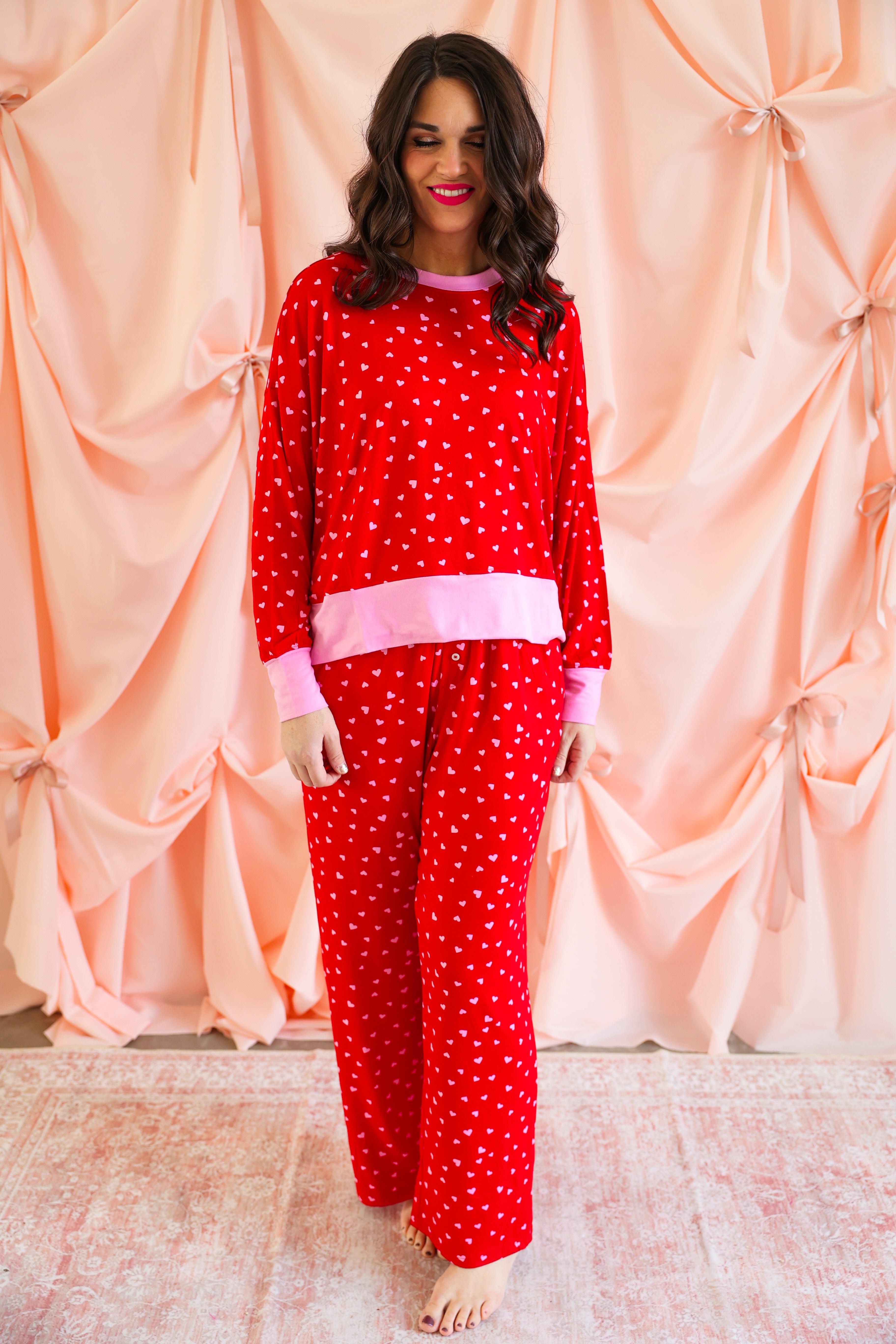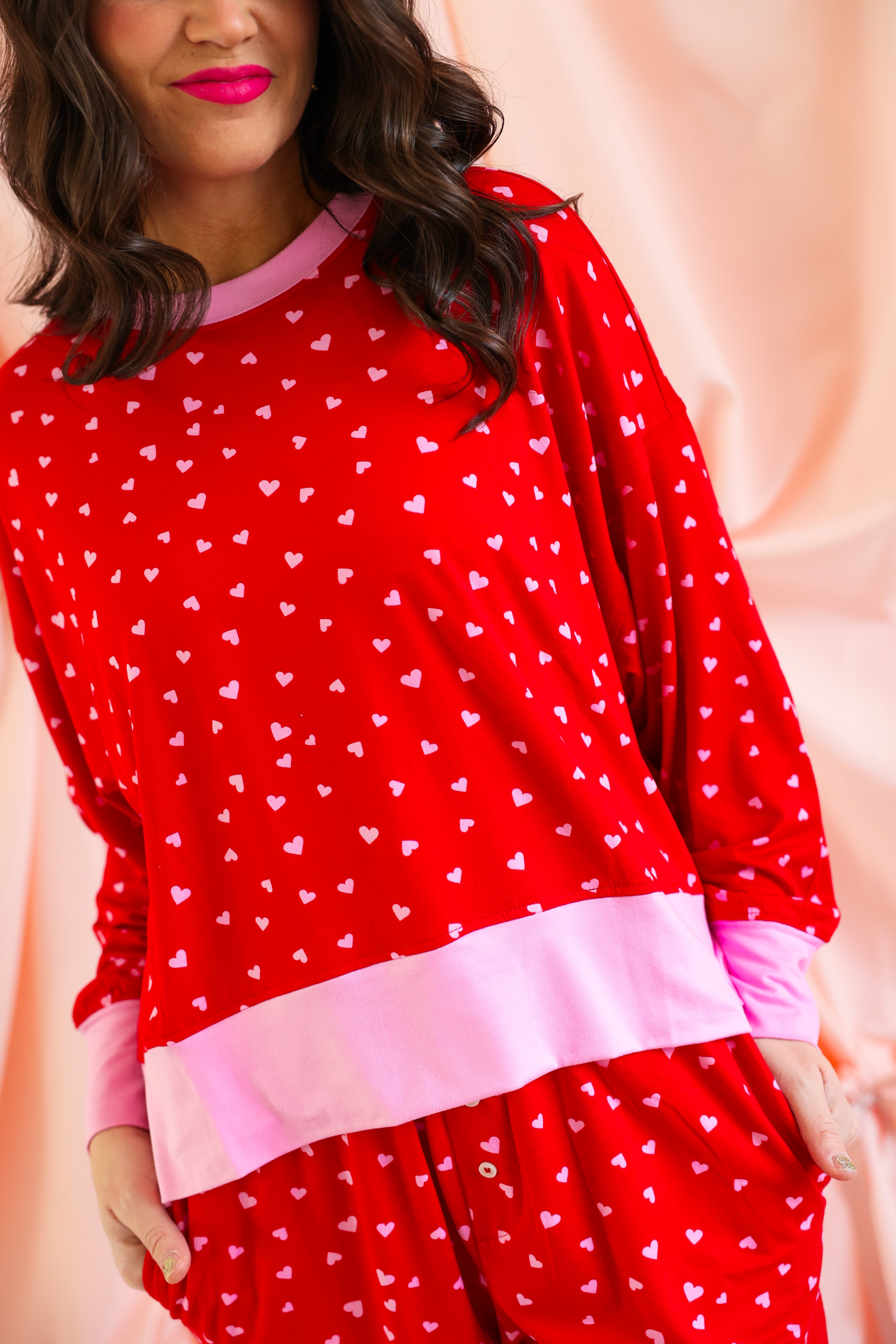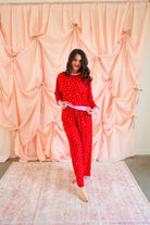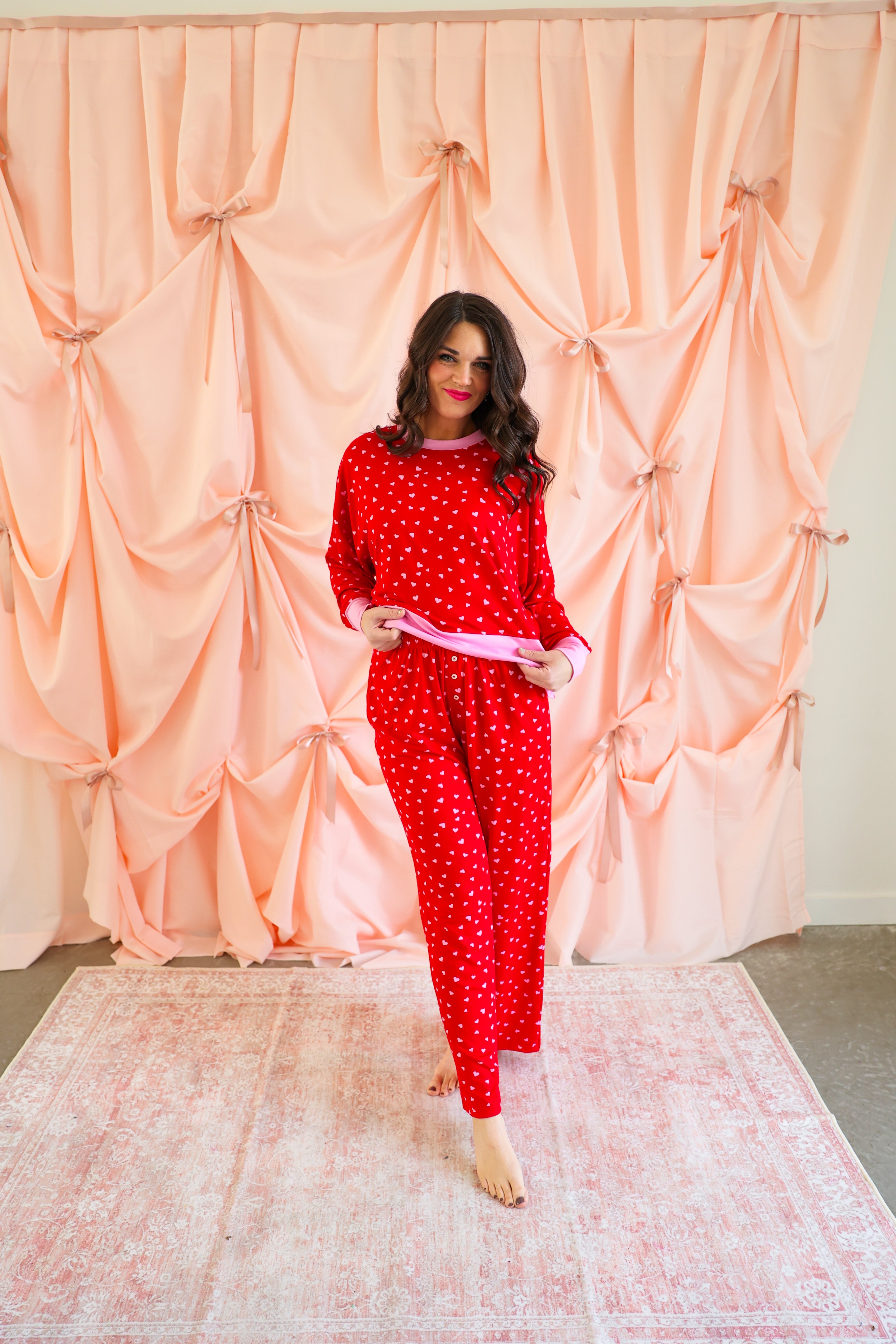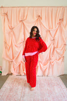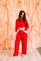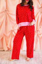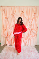Effortlessly cozy with a playful, festive touch, the Mini Hearts Ultra-Soft Jersey Knit PJ Set is made for lounging in comfort and style ❤️✨ This relaxed-fit set features a long-sleeve pullover top paired with wide-leg pants, all crafted from ultra-soft jersey knit fabric that feels dreamy against the skin. Scattered with tiny white hearts on a vibrant red base and finished with contrasting light pink trim, this set blends sweet detail with everyday wearability.