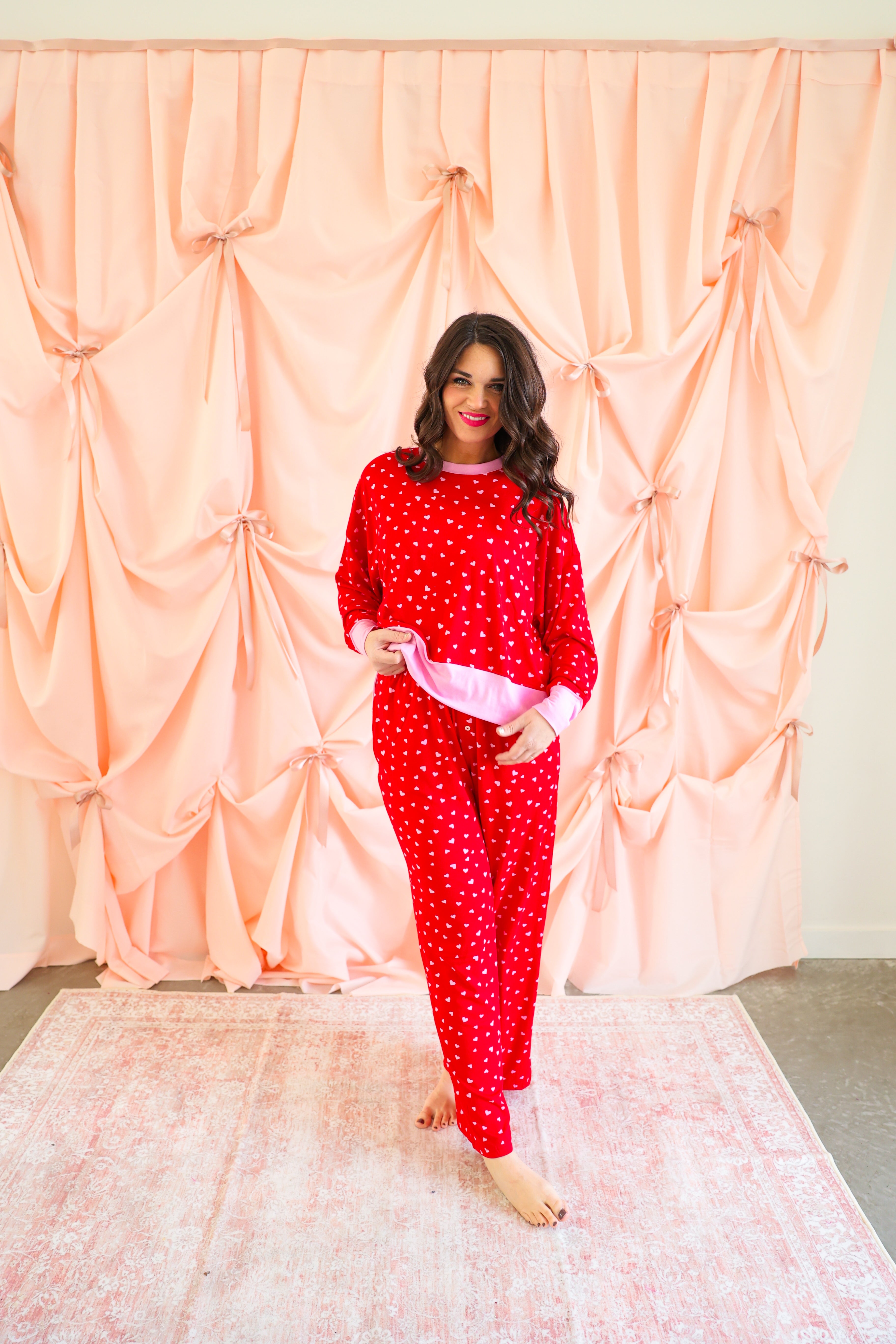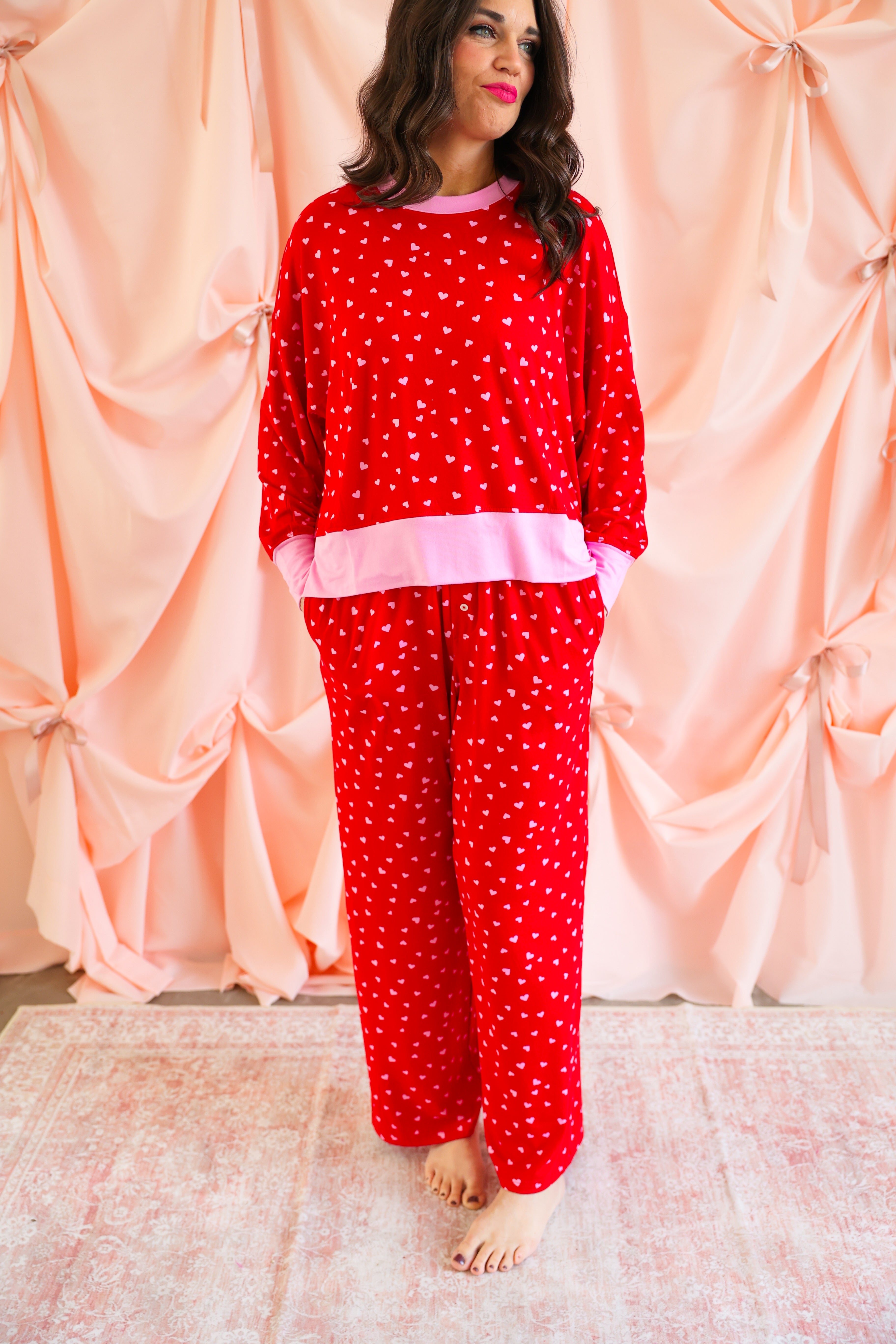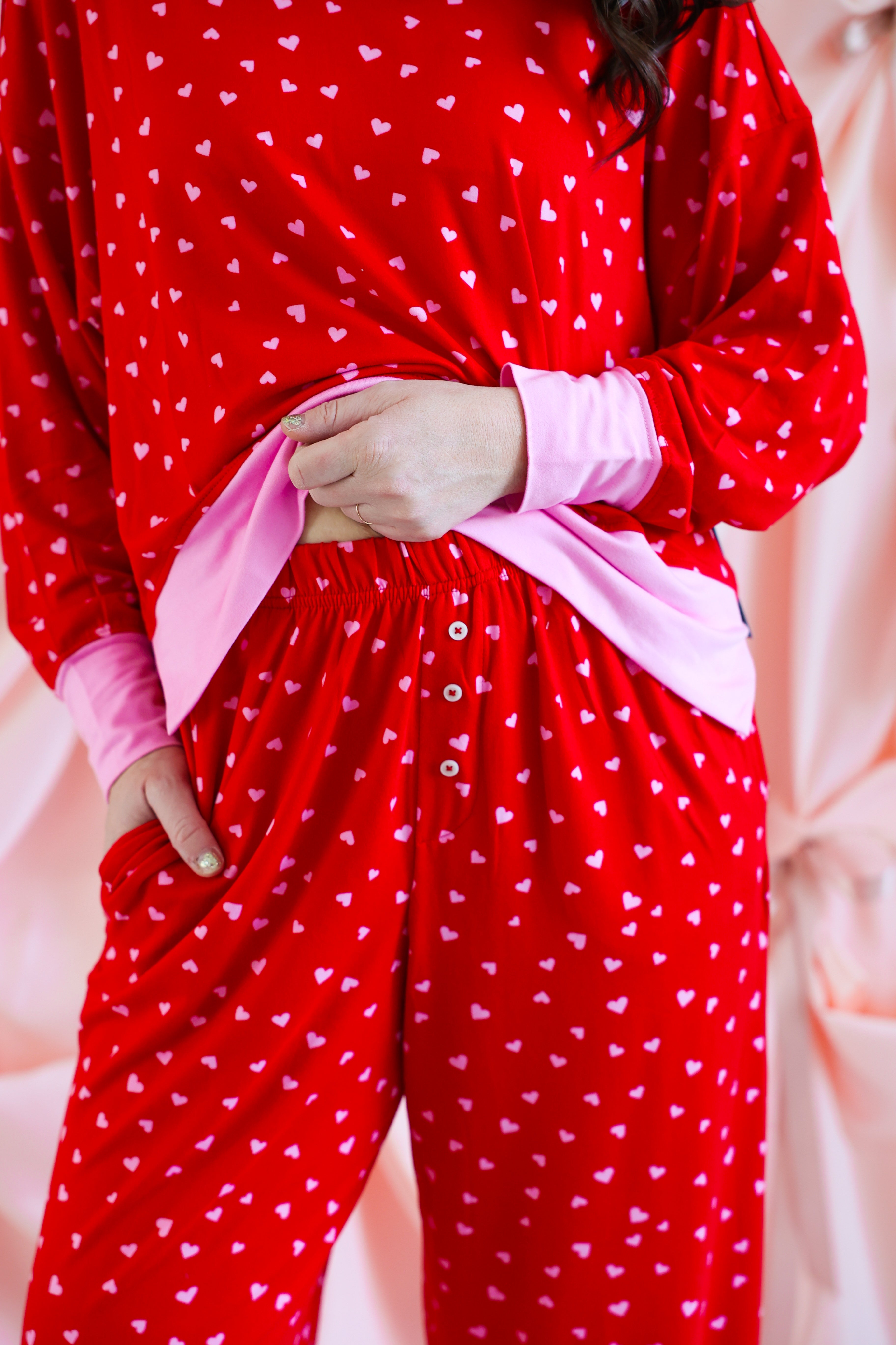 Effortlessly cozy with a playful, festive touch, the Mini Hearts Ultra-Soft Jersey Knit PJ Set is made for lounging in comfort and style ❤️✨ This relaxed-fit set features a long-sleeve pullover top paired with wide-leg pants, all crafted from ultra-soft jersey knit fabric that feels dreamy against the skin. Scattered with tiny white hearts on a vibrant red base and finished with contrasting light pink trim, this set blends sweet detail with everyday wearability.