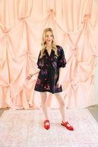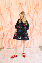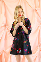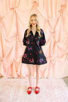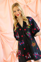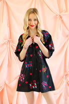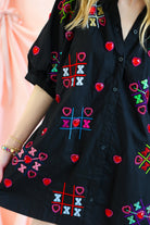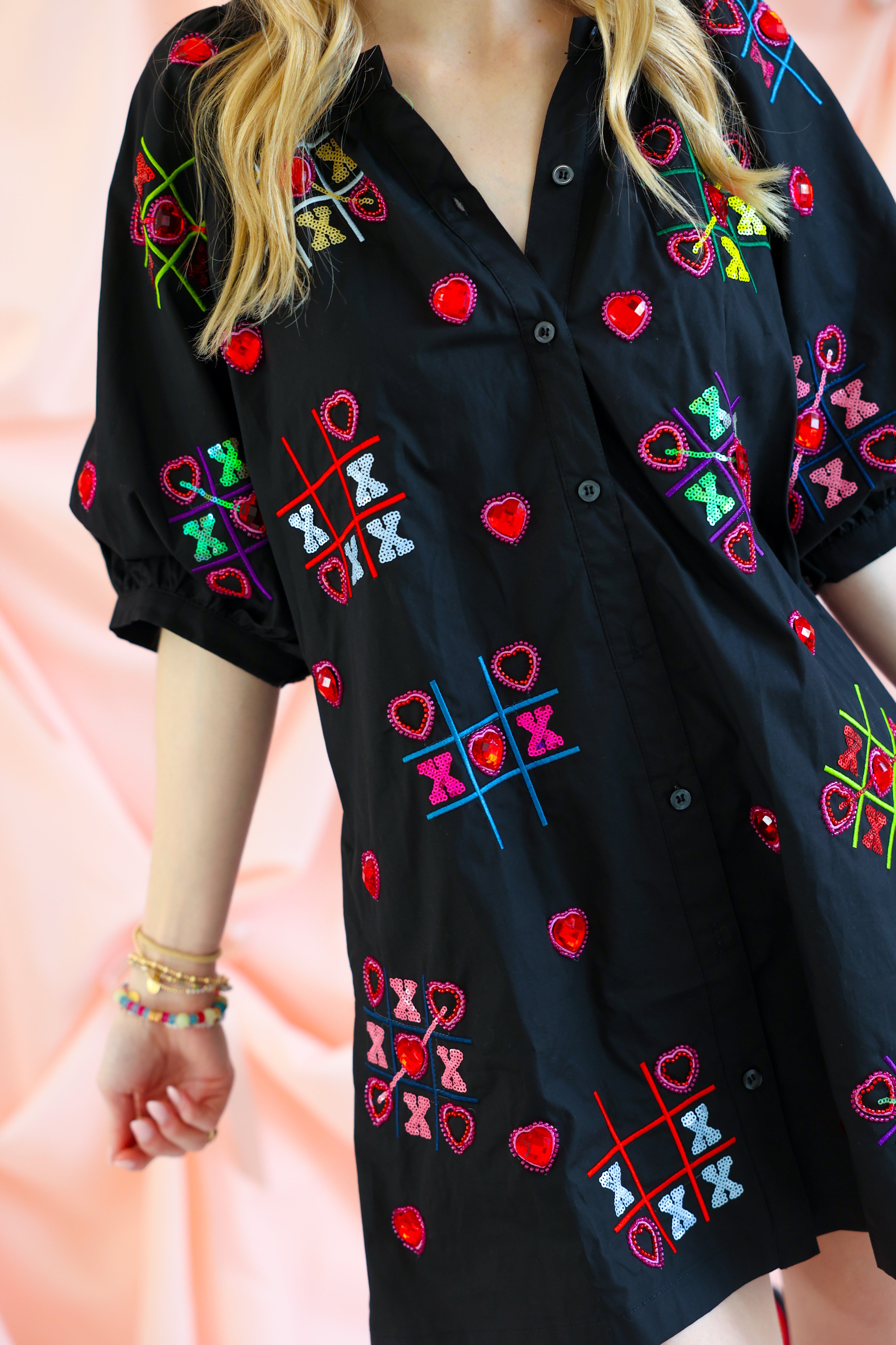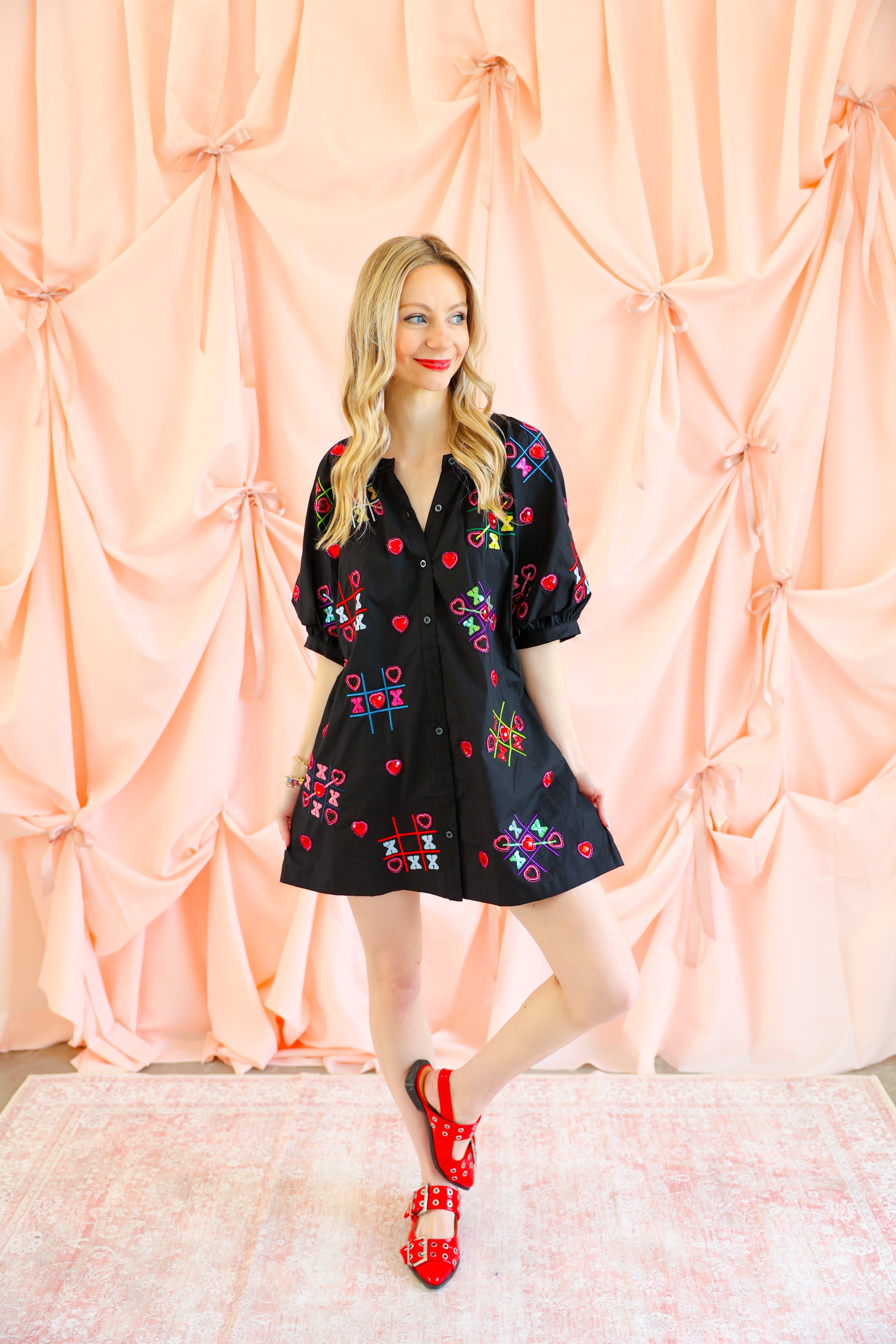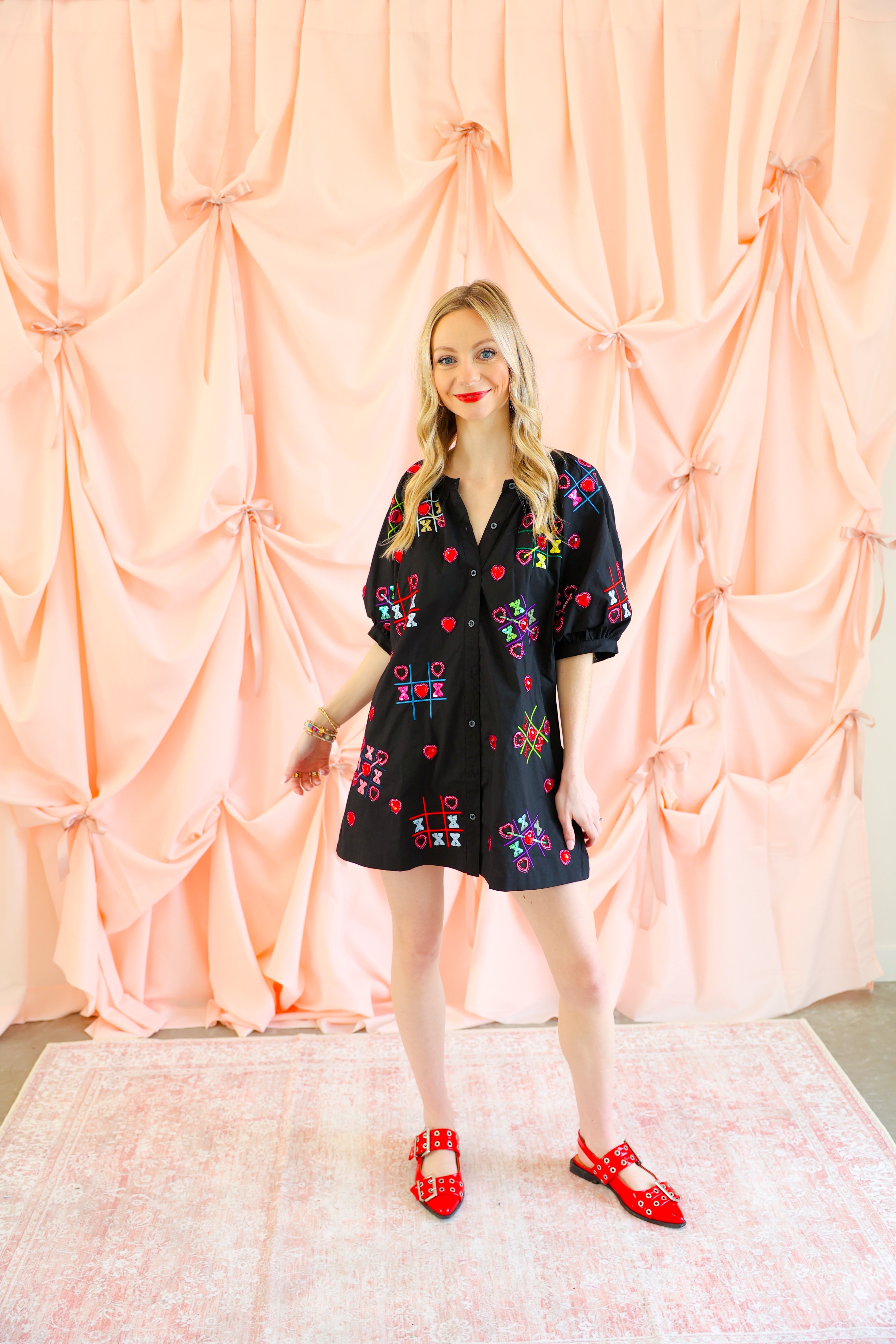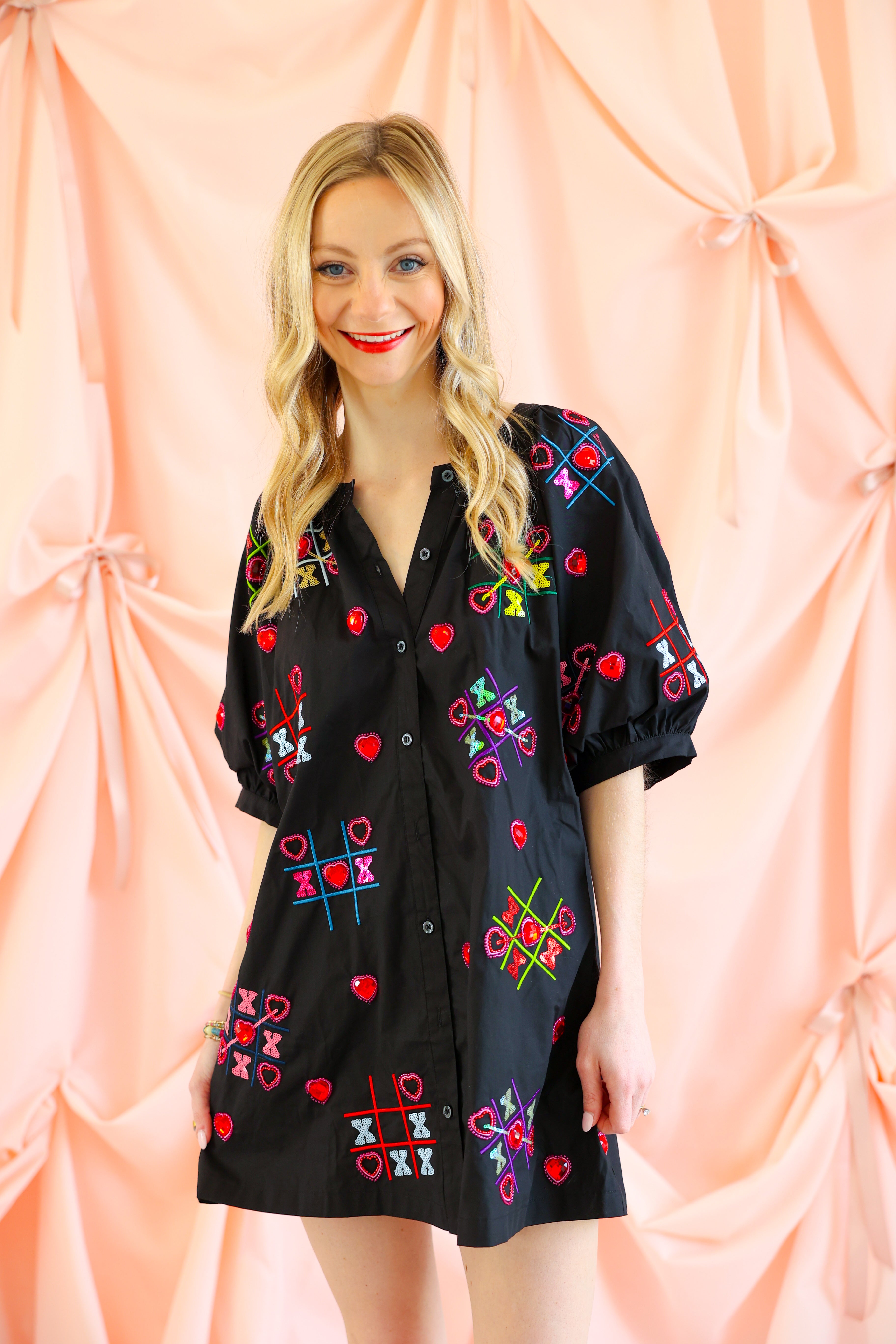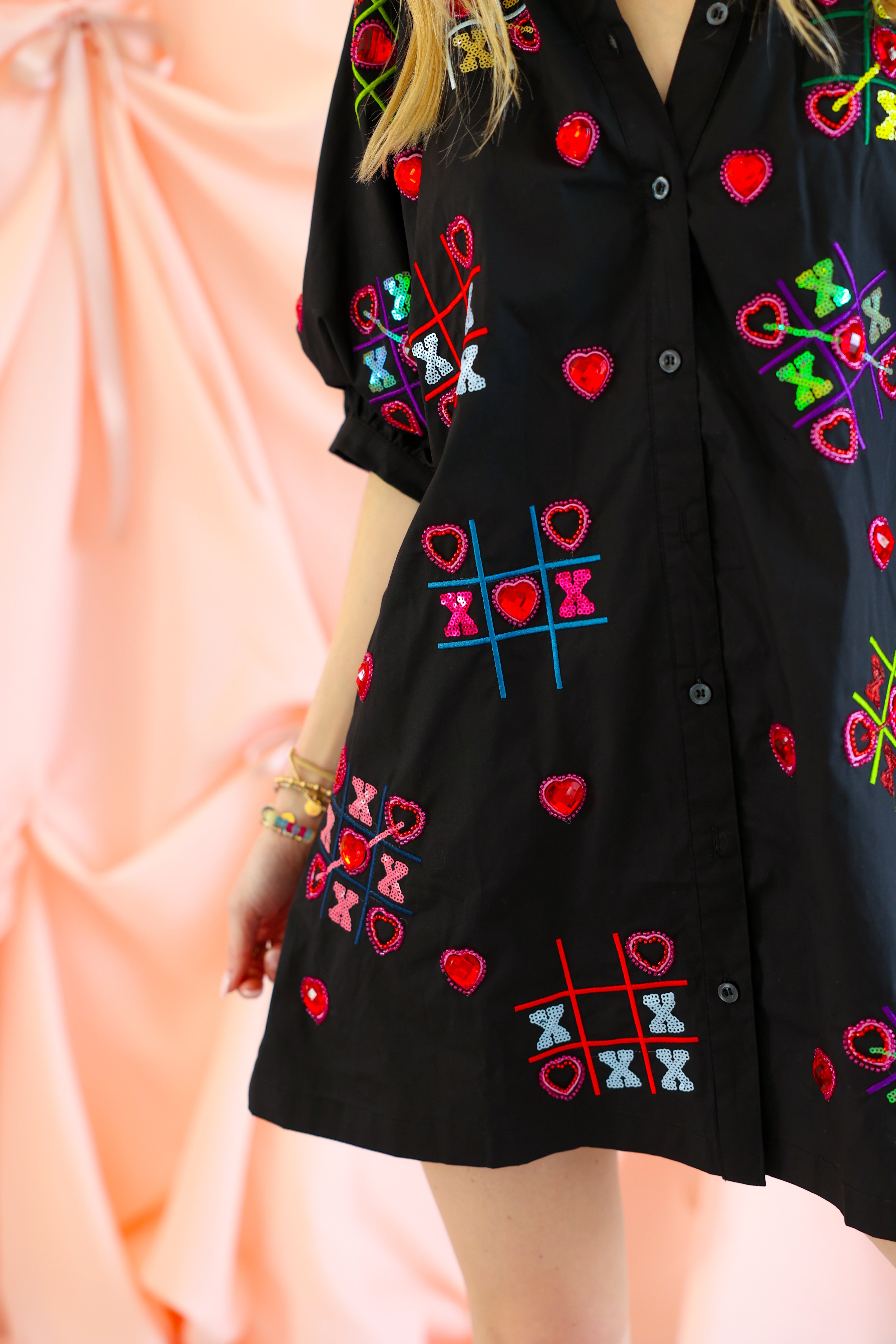Game on—Valentine’s style. This Queen of Sparkles Black XOXO Tic Tac Toe Cotton Button Up Dress is a fun, flirty statement piece featuring an allover embroidered XOXO tic-tac-toe motif accented with subtle sparkle. Hearts, X’s, and O’s come together across a classic black backdrop for a look that is playful yet polished.