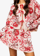 Fall head-over-heels for this dreamy statement sweater that blends romance with playful sparkle. The Pale Pink & Red Heart Lock & Key Tie-Up Sweater features an all-over whimsical heart, lock, and key motif with bold red contrast detailing for the ultimate love-struck look. Finished with three front tie closures, this piece gives effortless charm with a flirty, feminine twist.