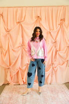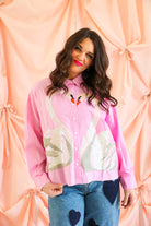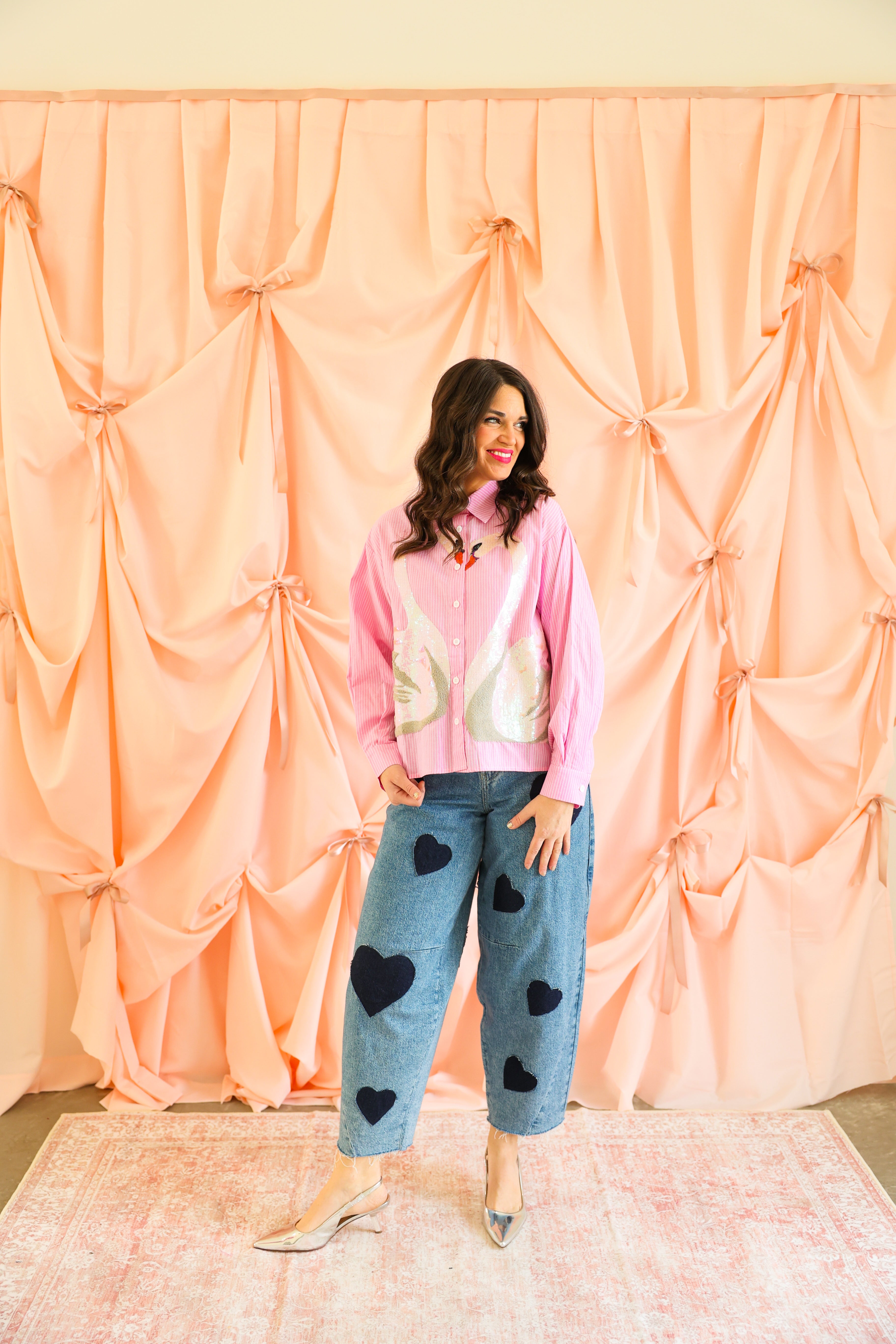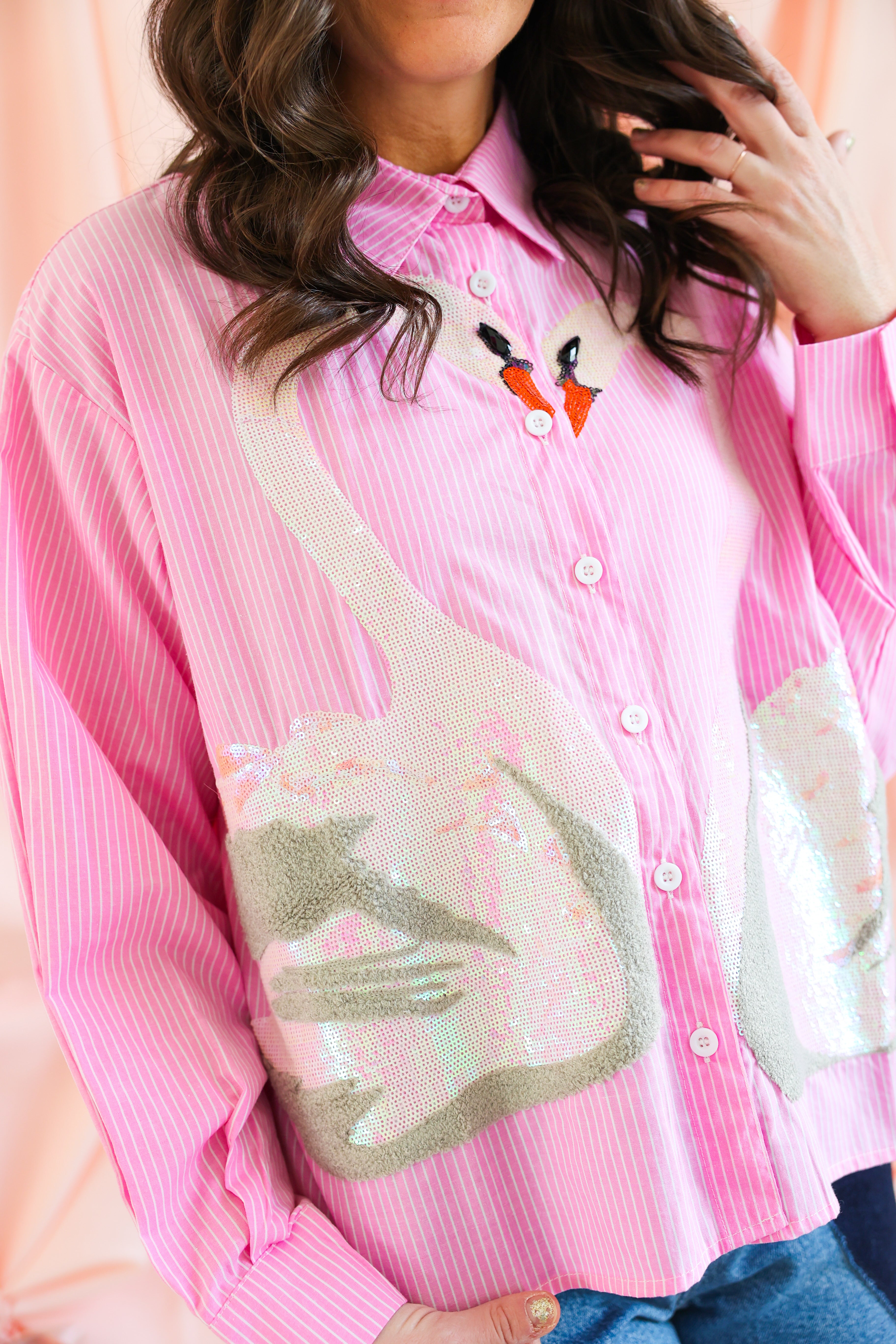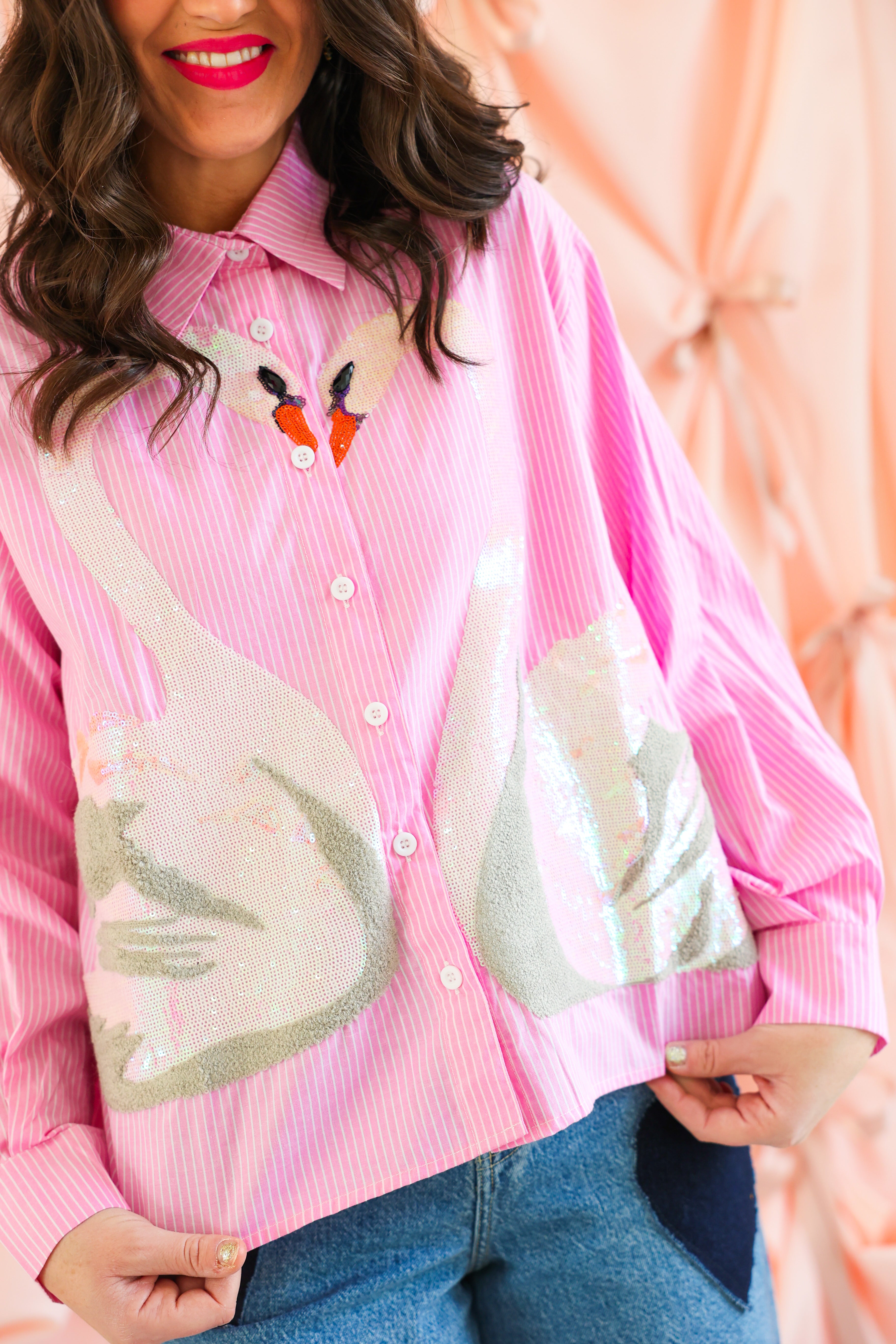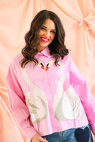 Whimsical, elegant, and full of sparkle 🦢✨ This Queen of Sparkles button-up top features a soft pink pinstripe base adorned with stunning sequin swan appliqués that create a romantic heart-shaped design at the front. Finished with delicate sequin accents at the neckline and classic button-front styling, this piece is equal parts playful and elevated.