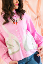 Queen of Sparkles Pink Striped Sequin Swan Button-Up Top
