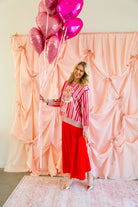 Sweet, sparkly, and unapologetically bold — the Pink Striped “XOXO Queen” Heart Cake Sweater is a total showstopper. Designed with vibrant vertical pink and red stripes, this sweater features a dazzling beaded heart cake graphic front and center, complete with pearl-like embellishments, bows, and glittery details that scream Queen energy.