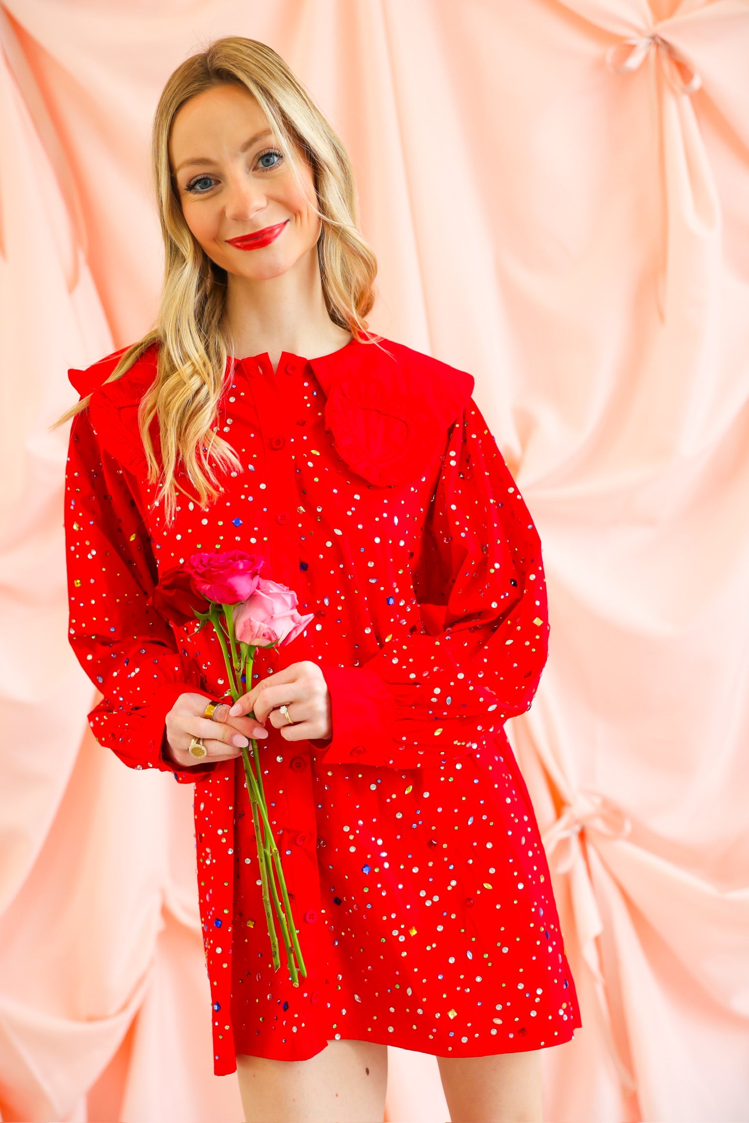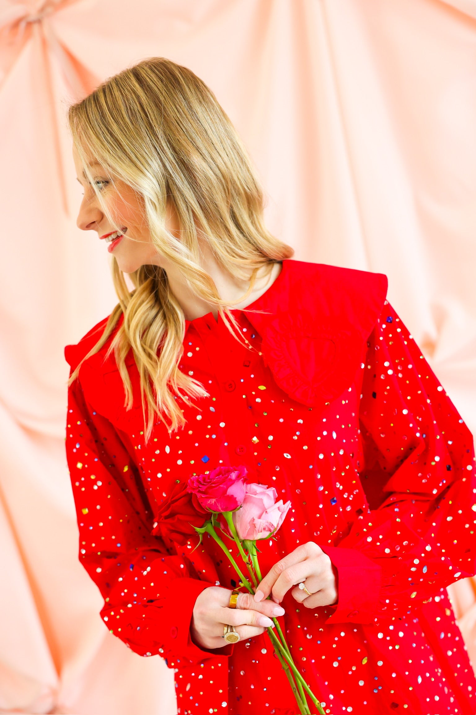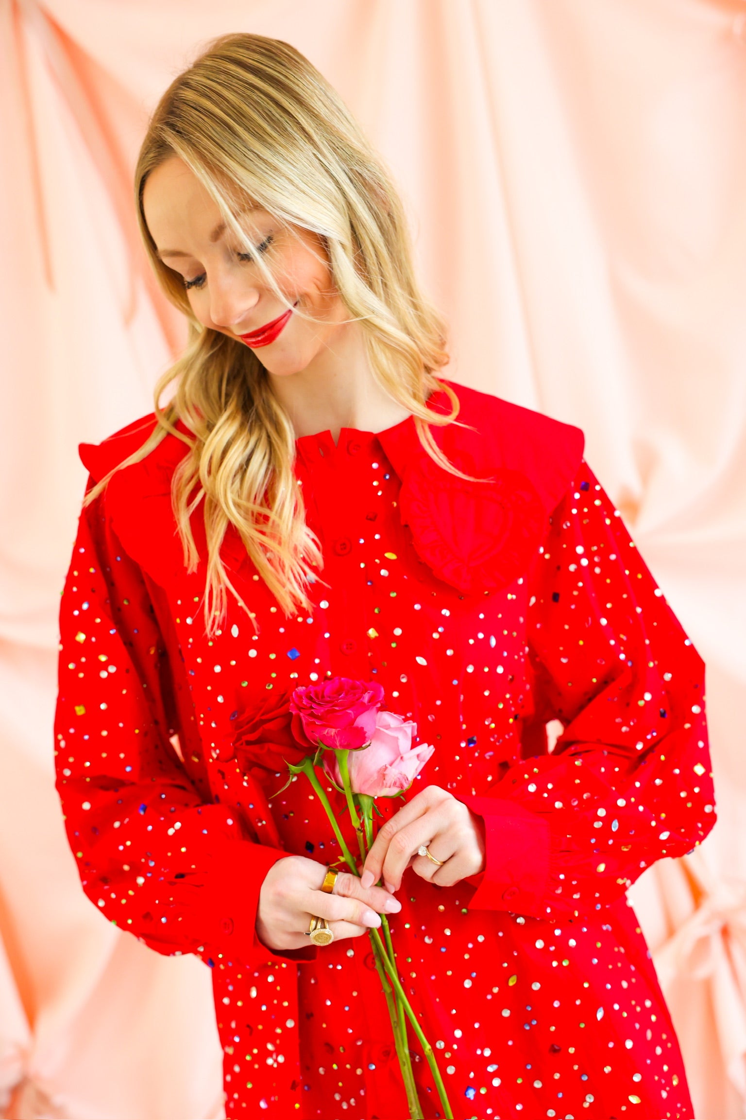Make a bold, romantic statement in this standout button-up dress from Queen of Sparkles. Designed in a vibrant red cotton base, this dress is elevated with shimmering rhinestone accents scattered throughout for the perfect touch of sparkle. The oversized ruffle heart collar steals the show, adding playful drama and signature Queen of Sparkles charm.