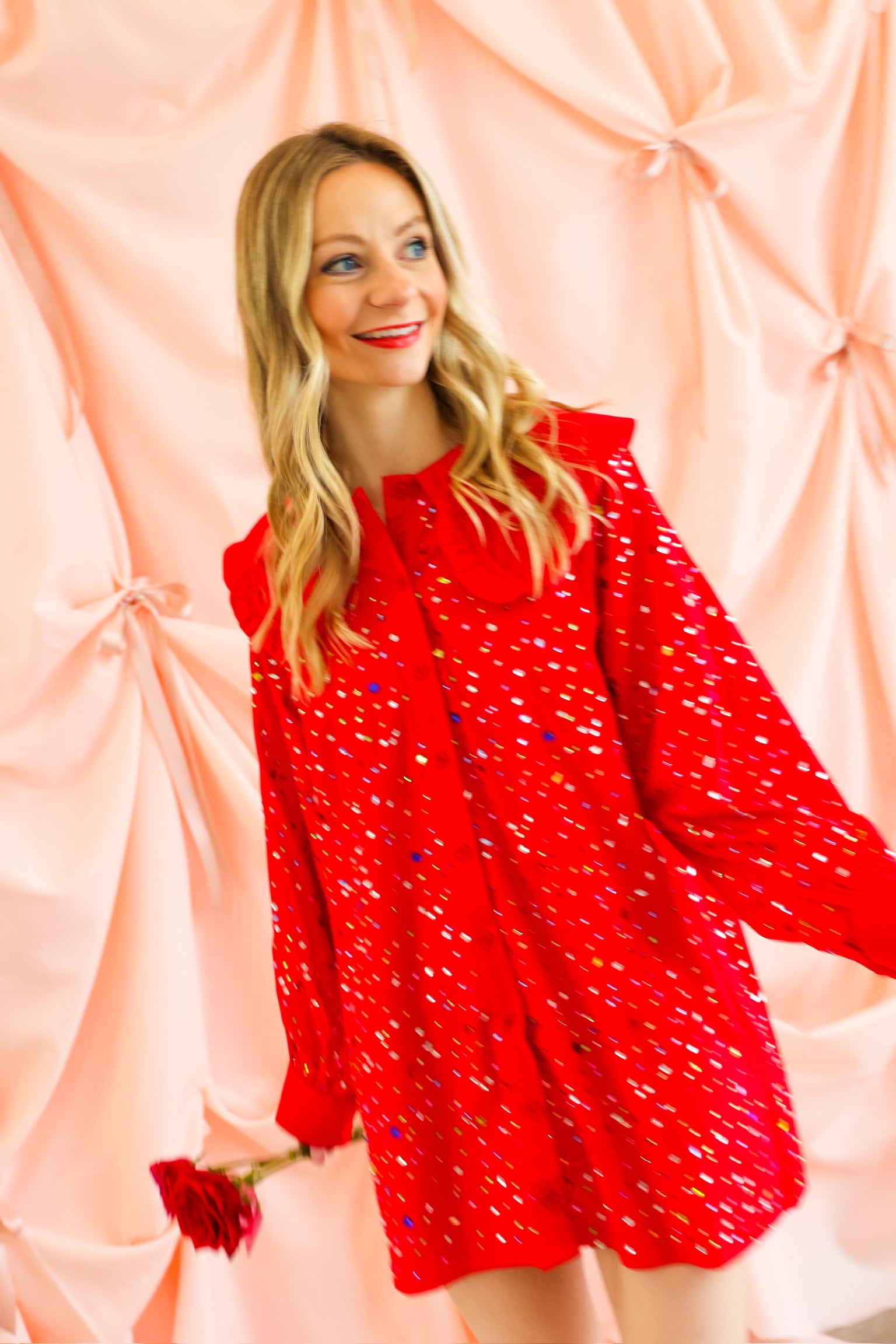 The relaxed, button-front silhouette makes it easy to wear as a dress or style open as a layering piece, while the long sleeves and soft cotton fabric keep it comfortable and breathable. From Valentine’s events to themed parties or anytime you want all eyes on you, this piece delivers sparkle with personality.