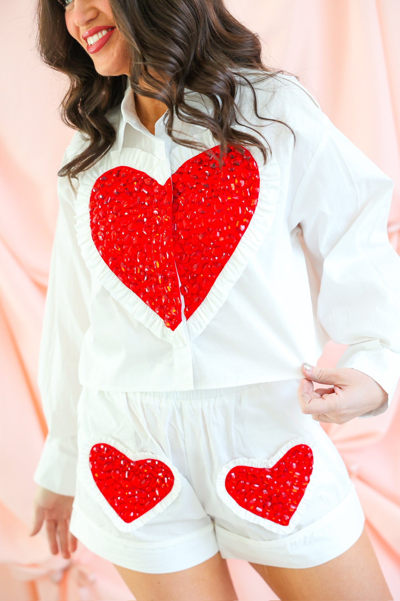 Perfect for Valentine’s celebrations, themed events, or adding a bold pop of sparkle to your everyday look, these shorts pair effortlessly with the matching button-up top or a simple tee for a fun, fashion-forward outfit.