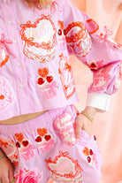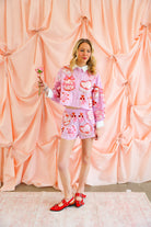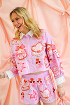 Sweeten up your Valentine wardrobe with the Queen of Sparkles Pink Cakes & Pastries Cotton Shorts—the playful companion to the matching button-up top. Featuring the same whimsical embroidered cakes, pastries, bows, and heart details, these shorts bring a fun, festive feel while staying polished and wearable. Designed in a soft pink cotton base, they’re equal parts comfy and statement-making.