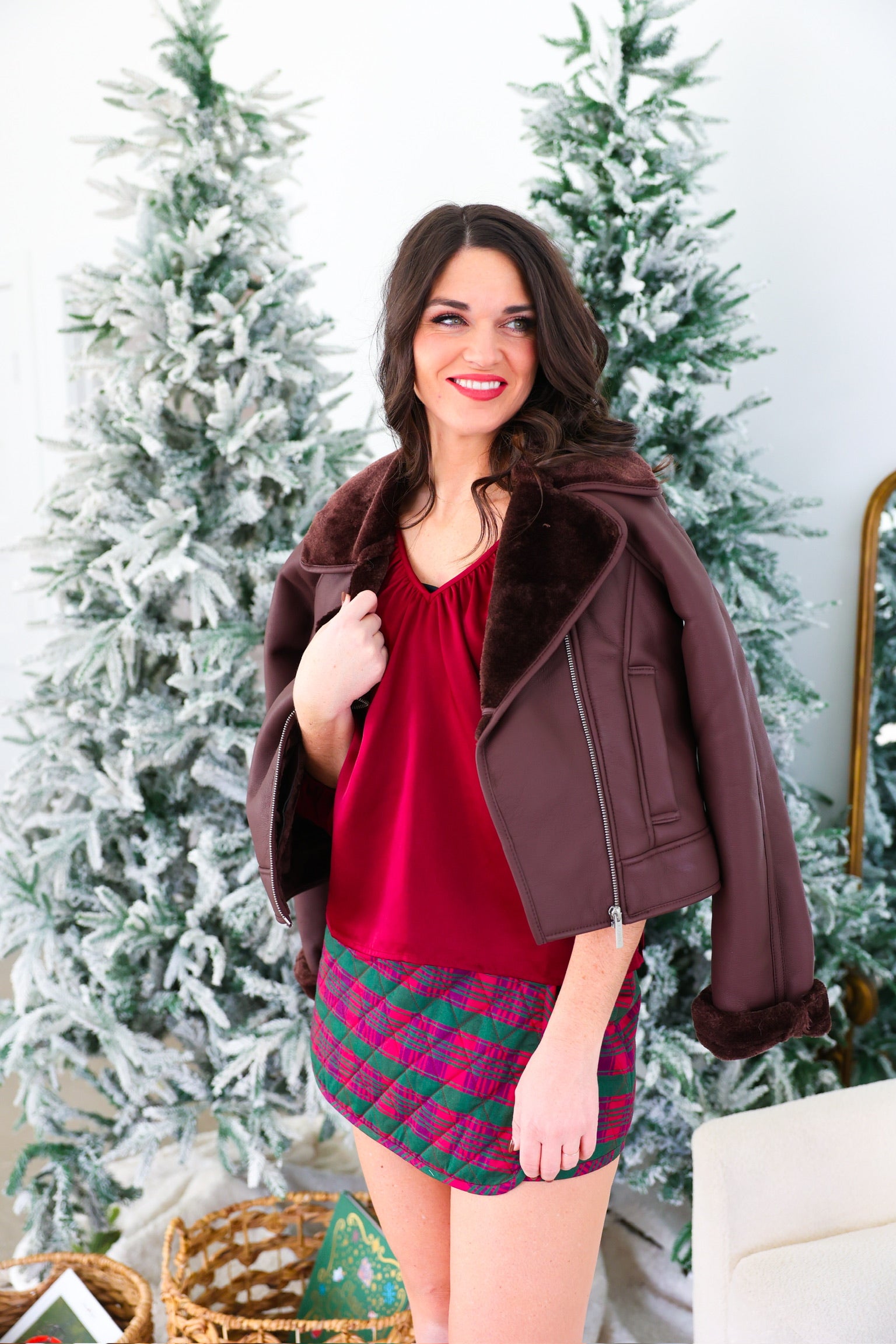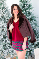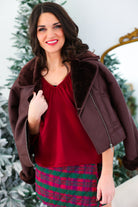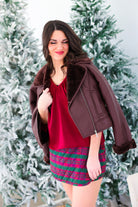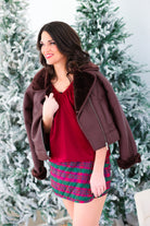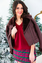This faux leather jacket is fully lined with plush sherpa that peeks out at the collar and cuffs, giving it a cozy contrast you’ll want to live in all season. With a notched collar, zip-front closure, and structured silhouette, it balances laid-back comfort with a touch of refinement.