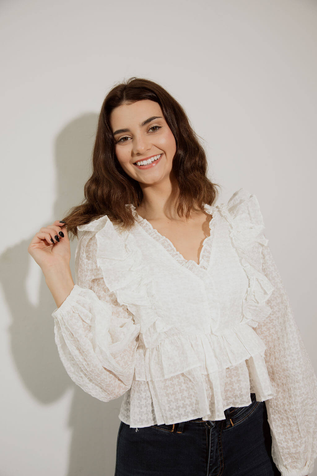 This frilly, lightweight blouse is a simple, classy piece that can be paired with any sort of skirt or bottoms! Just the right amount of boldness mixed with daintiness!