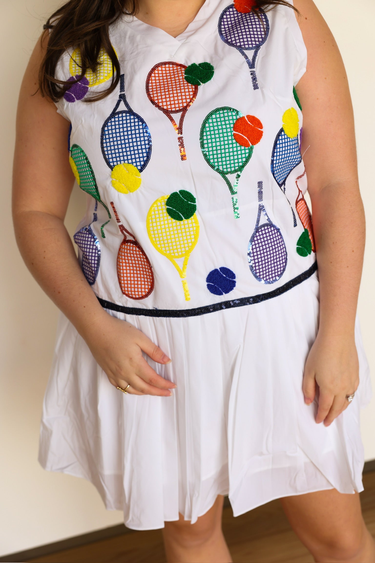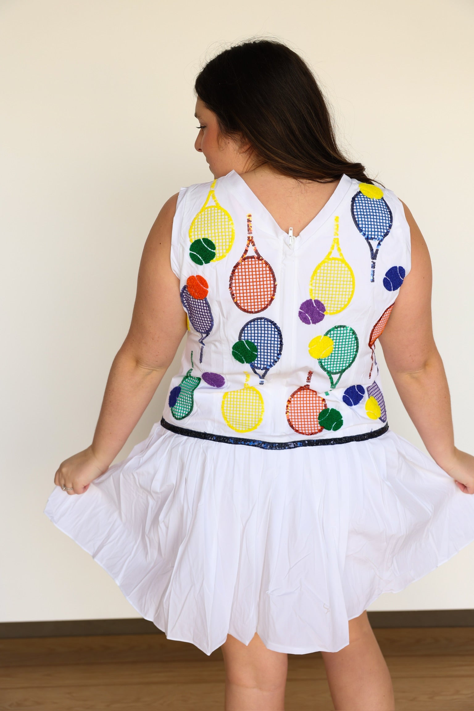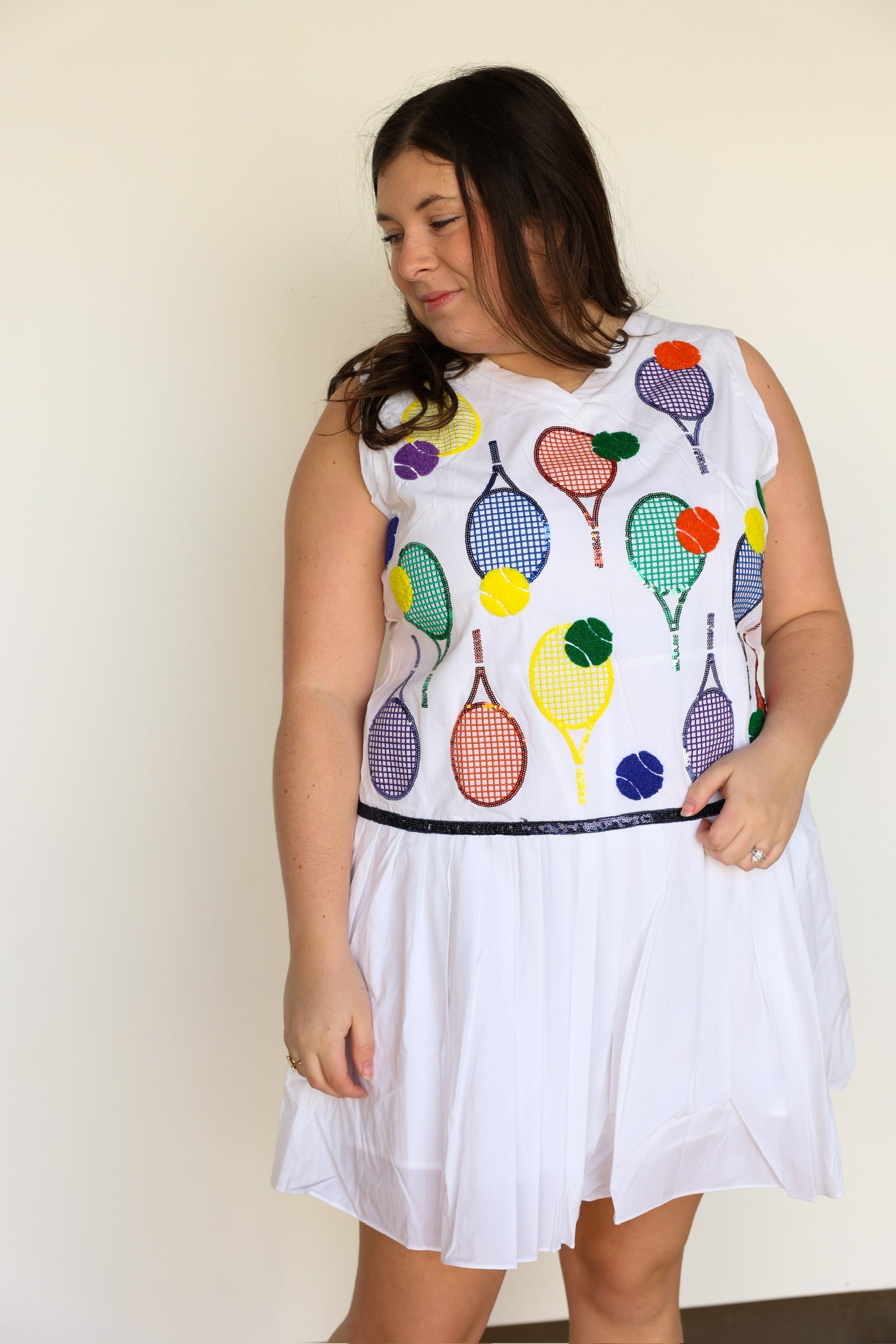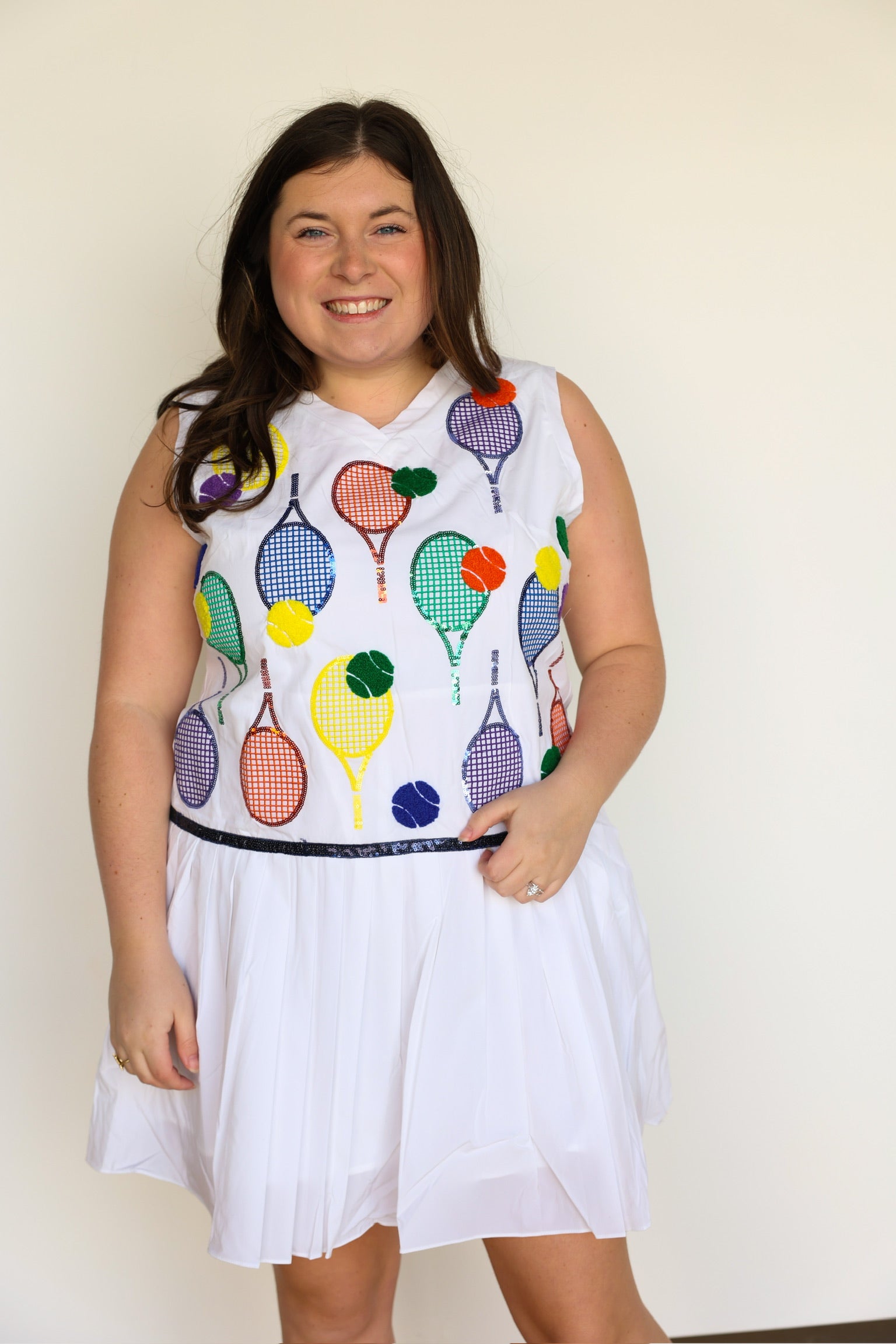 Add a touch of sparkle to your athletic wardrobe with our White Classic Color Tennis Rackets Pleat Athletic Dress. The pleated skirt and sequin tennis balls and rackets icons make this dress both functional and fashionable. With a true fit, you'll feel comfortable and confident on the court!