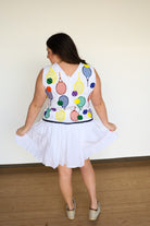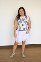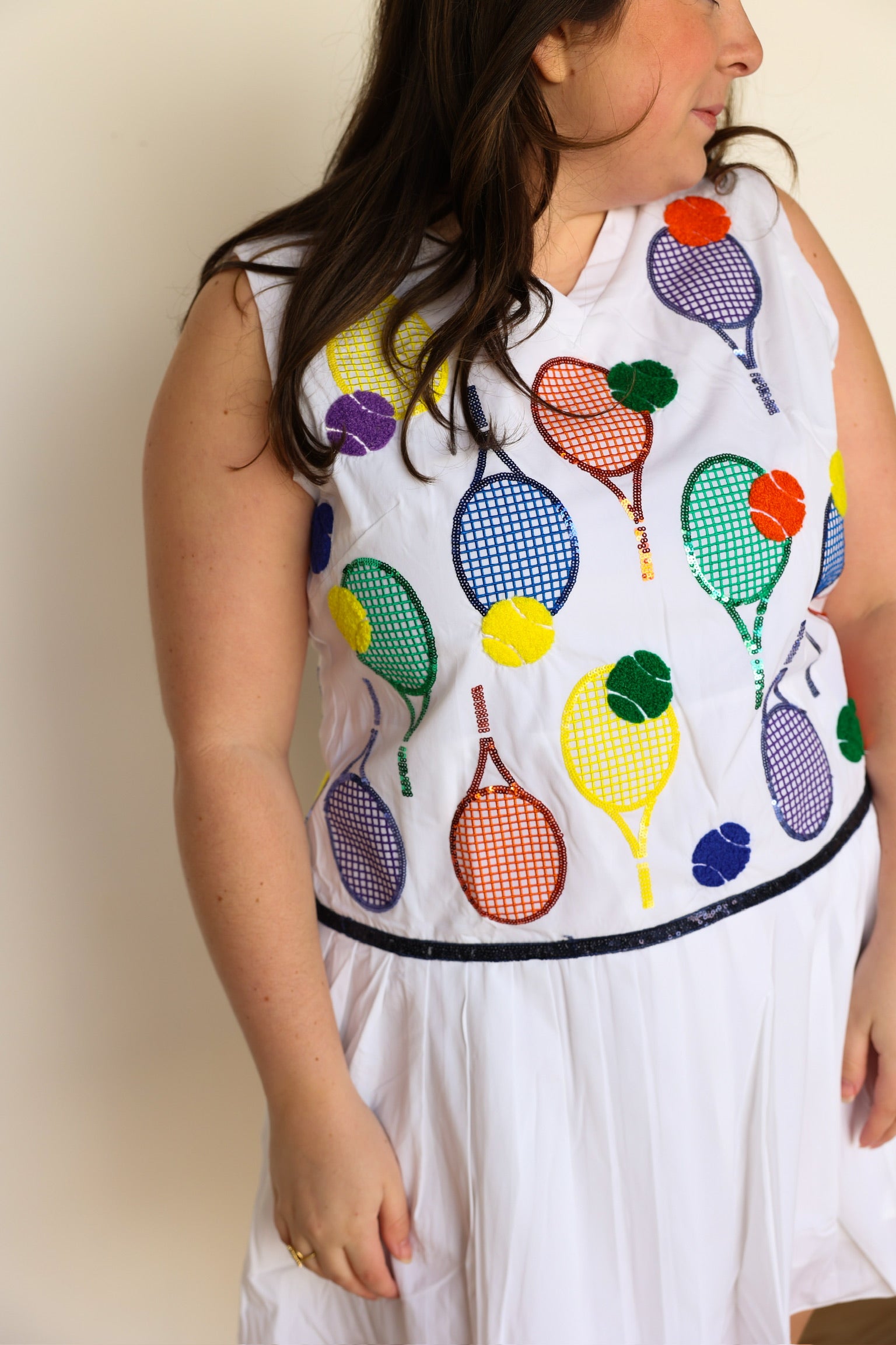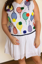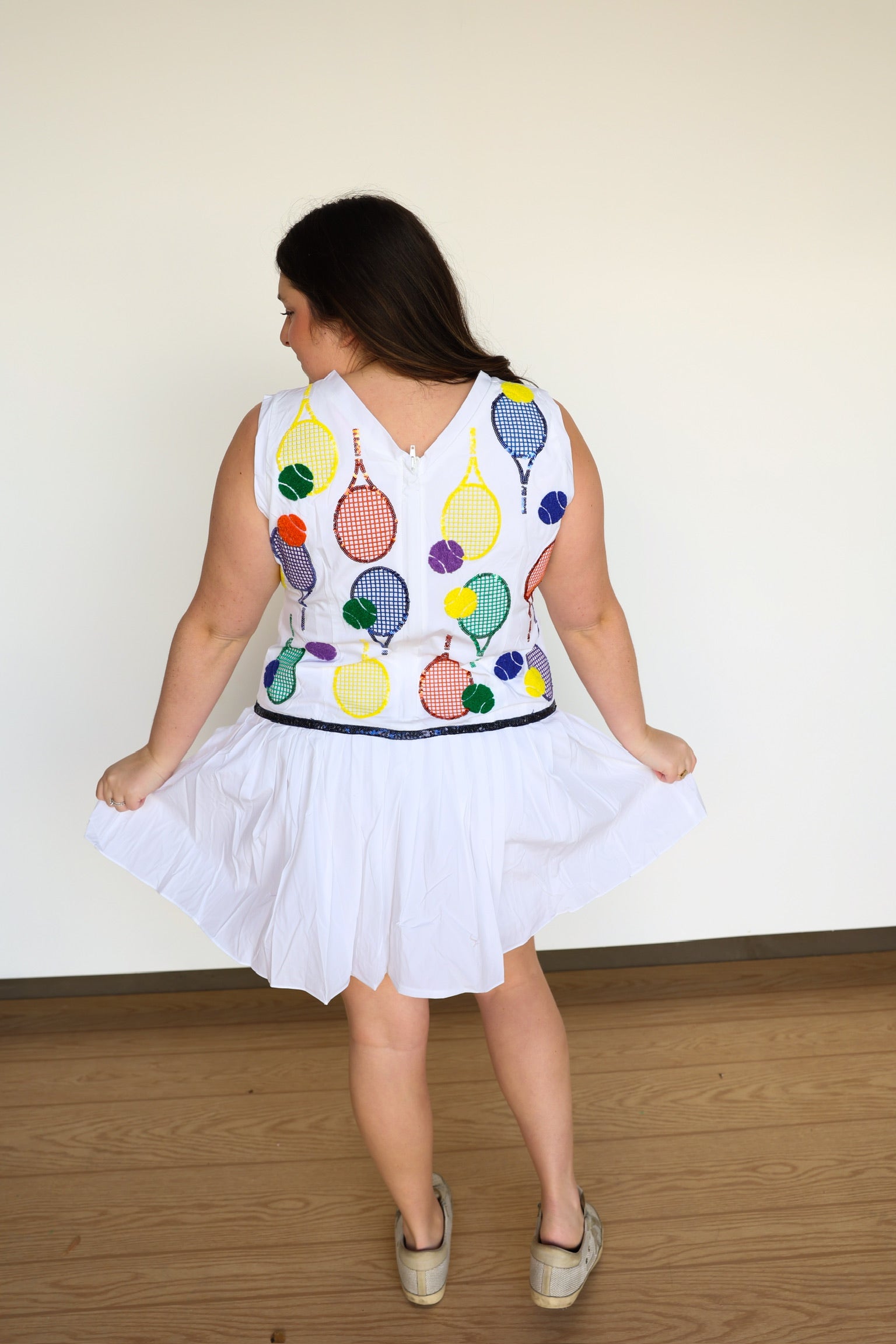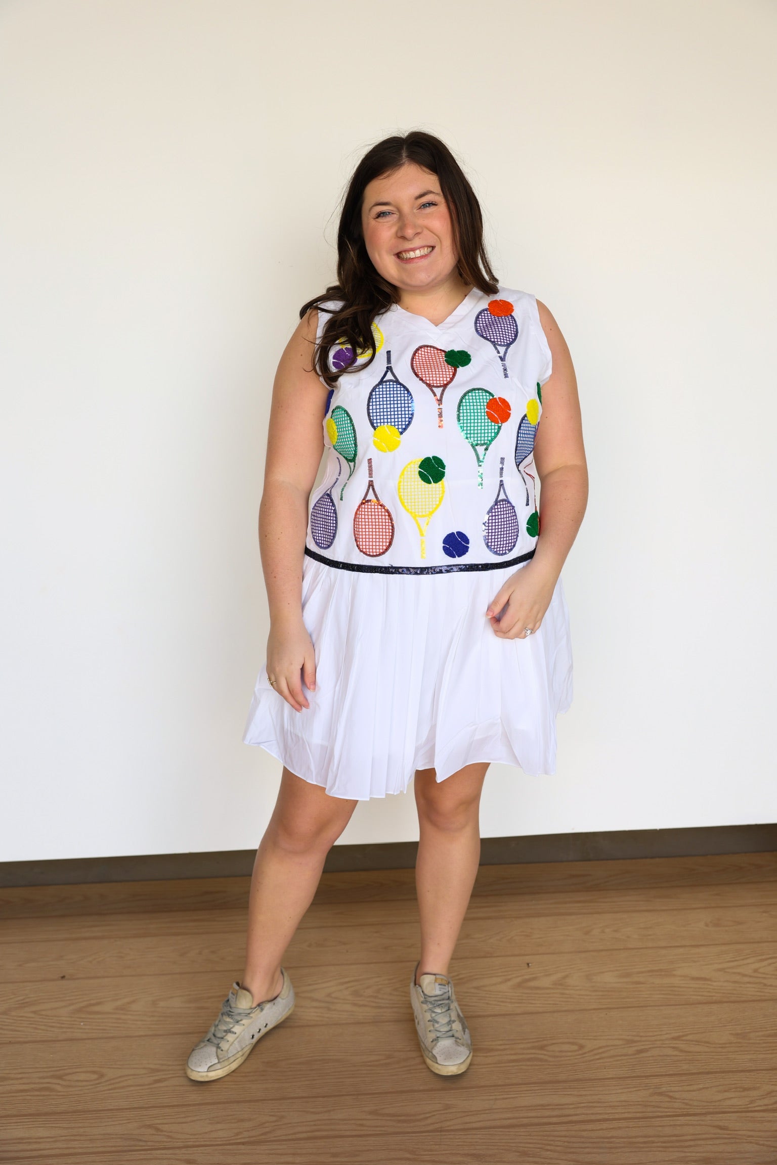 Add a touch of sparkle to your athletic wardrobe with our White Classic Color Tennis Rackets Pleat Athletic Dress. The pleated skirt and sequin tennis balls and rackets icons make this dress both functional and fashionable. With a true fit, you'll feel comfortable and confident on the court!