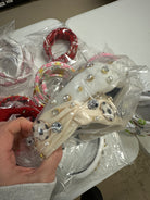 This headband is a must-have for any soccer enthusiast or soccer mom! Featuring adorable soccer ball beads, a soccer cleat icon, and sparkling rhinestone gems, this beige headband adds a touch of style to any outfit. Perfect for soccer events or everyday wear.
