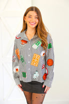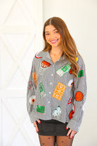 Elevate your casual wardrobe with the Black Stripe Basketball Icon Button Up Top from Queen of Sparkles. This versatile piece features a sleek black and stripe design accented with a striking basketball icon, perfect for those who love sporty-chic aesthetics. The classic button-up silhouette offers effortless styling options—dress it up for a night out or keep it relaxed for everyday wear. Quality construction ensures durability while the thoughtful design details showcase your passion for the game. Whether layered or worn solo, this top delivers the perfect balance of comfort, style, and personality that makes you feel confident and put-together.