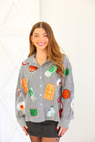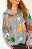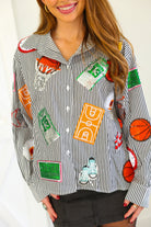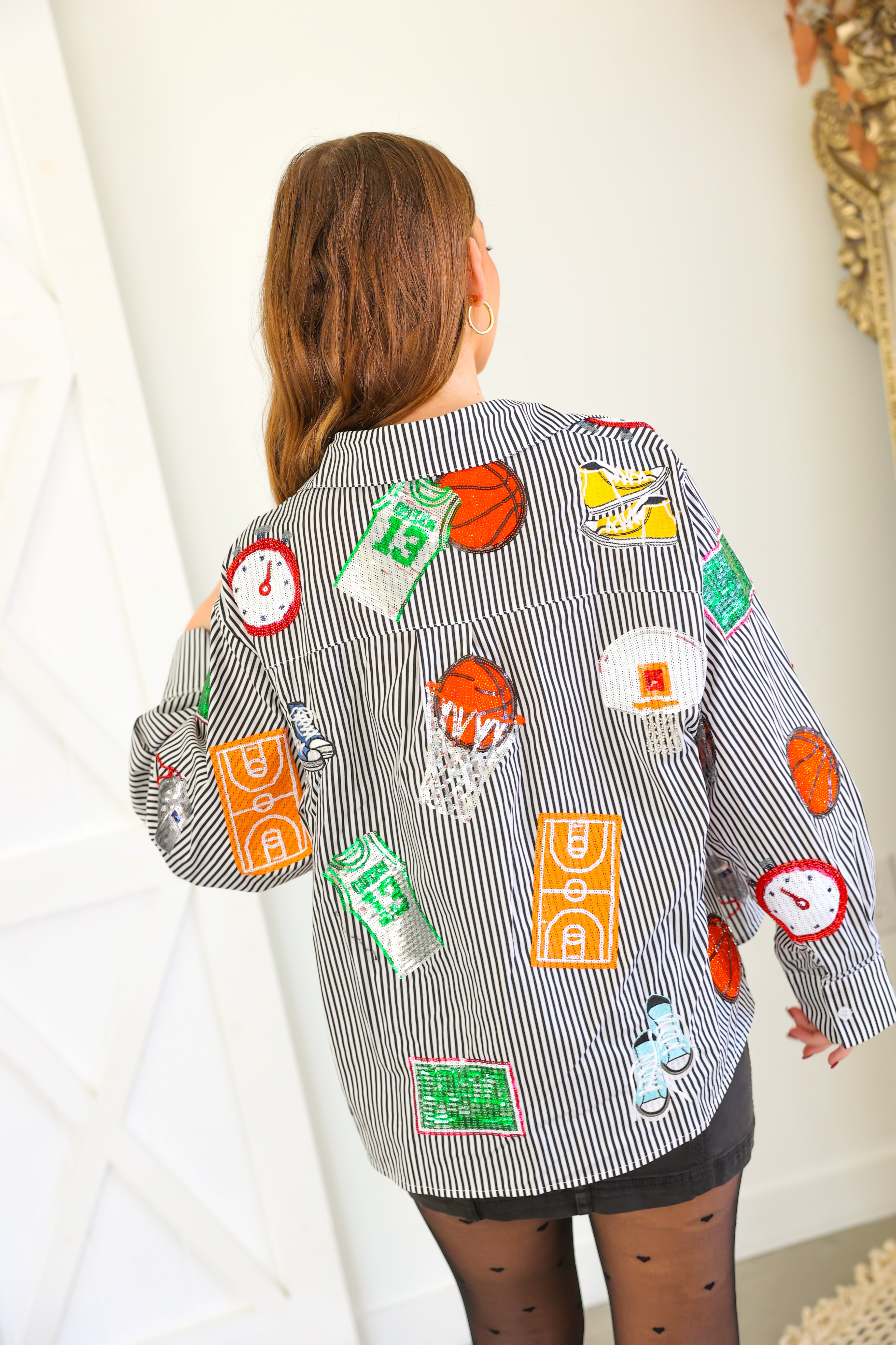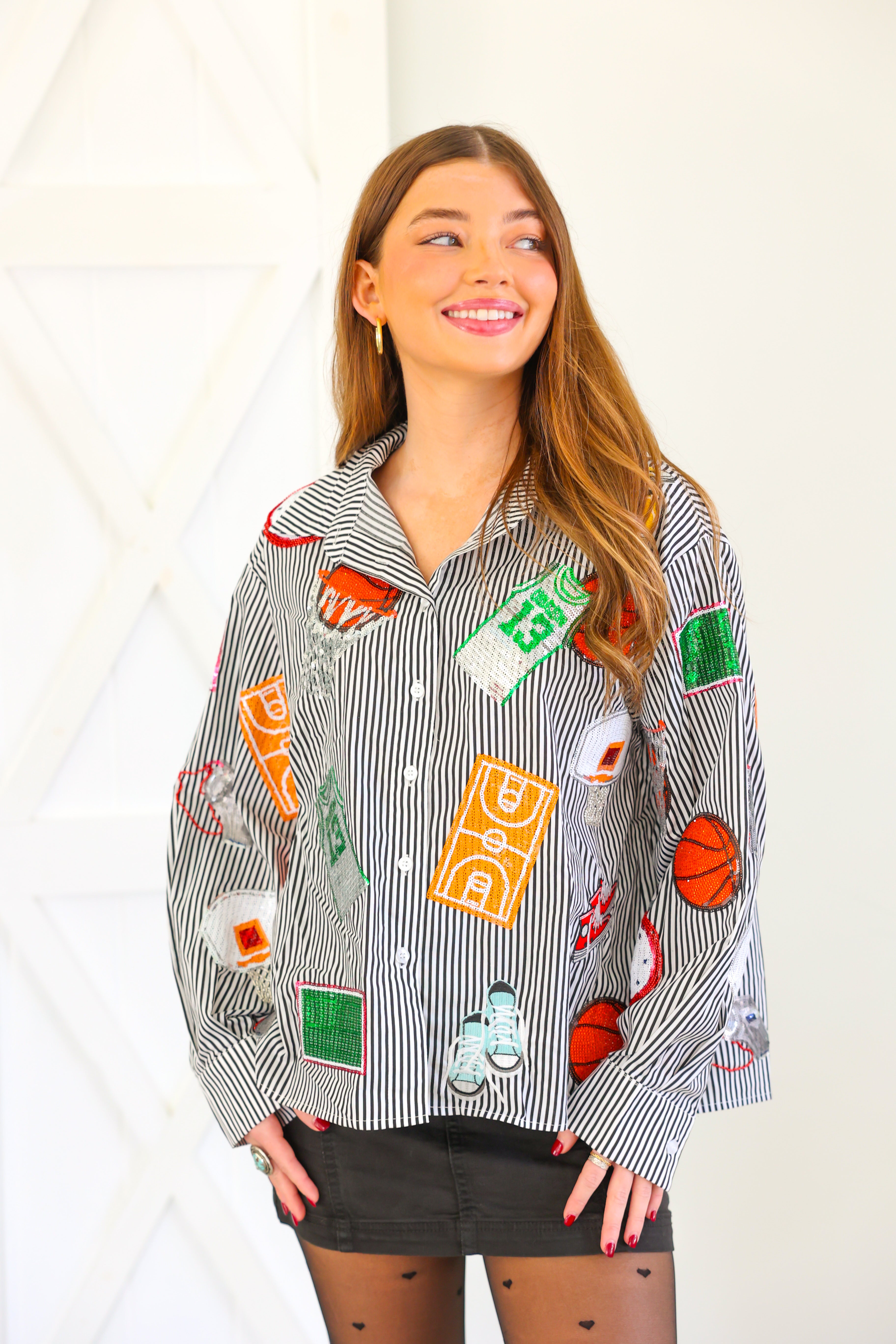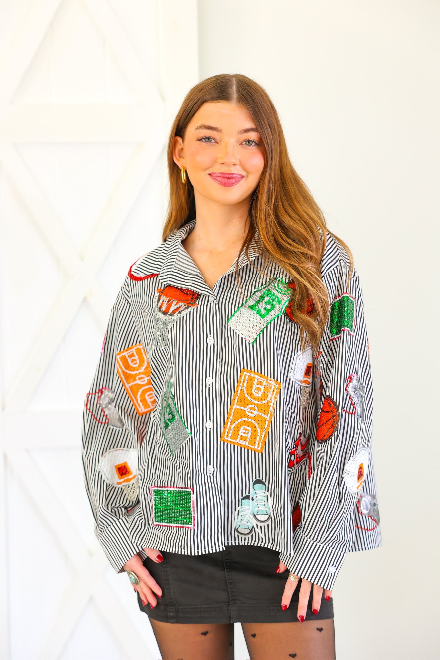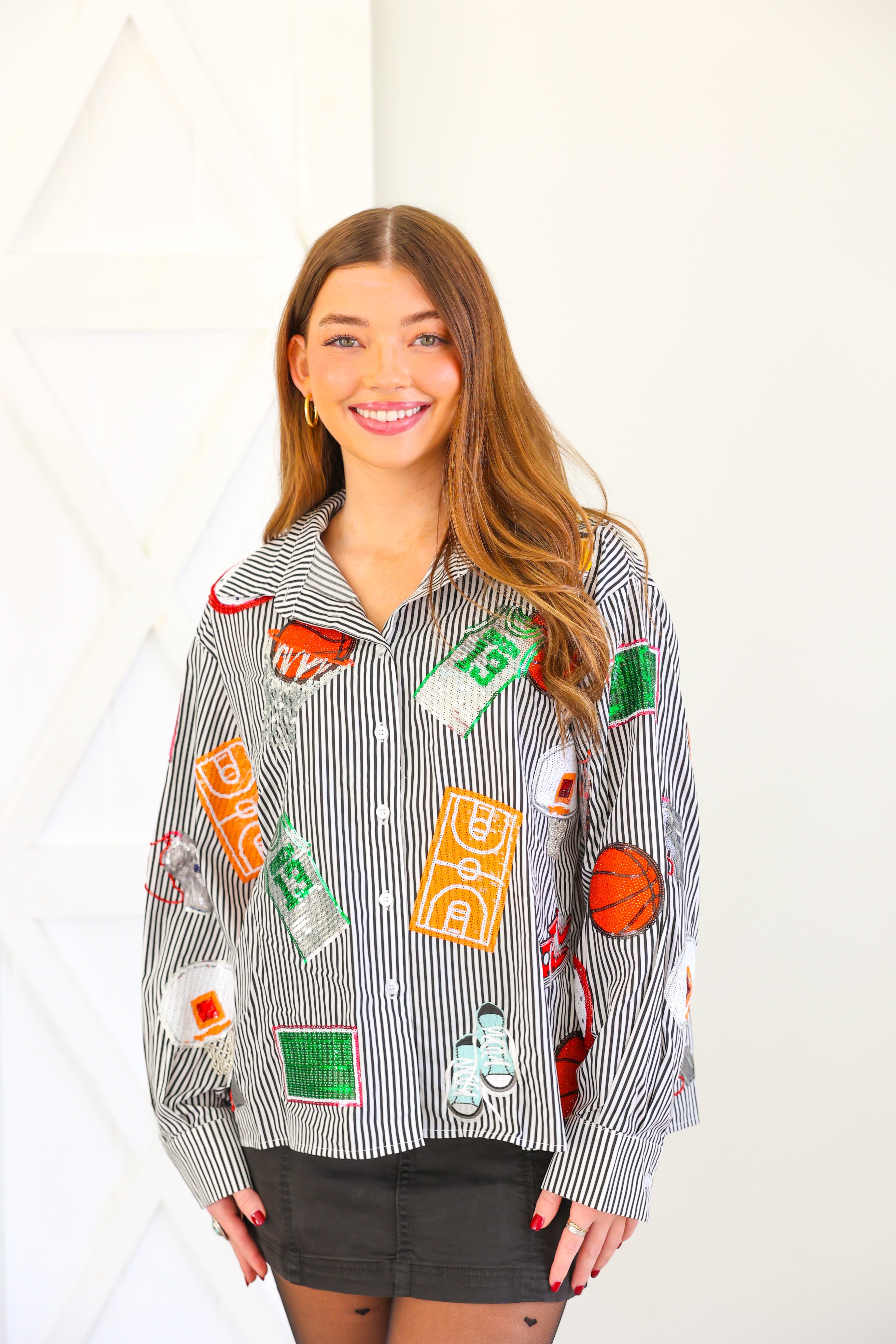 Black Stripe Basketball Icon Button Up Top Queen of Sparkles