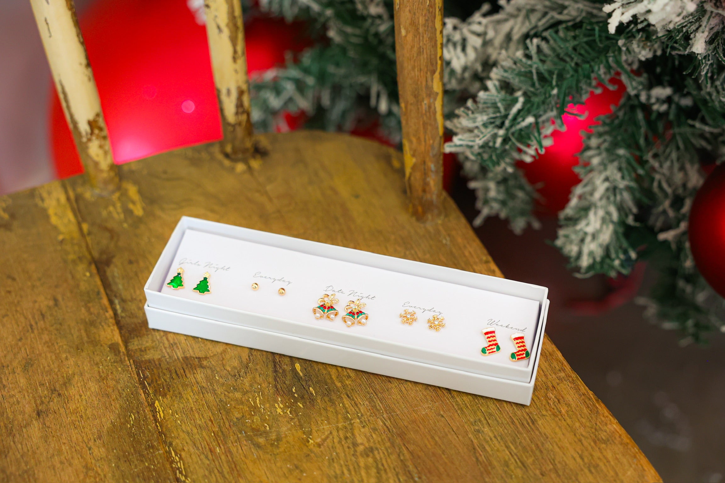 Tree, Gold Ball Studs, Bells, Snowflake & Stocking Earring Set