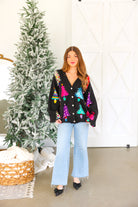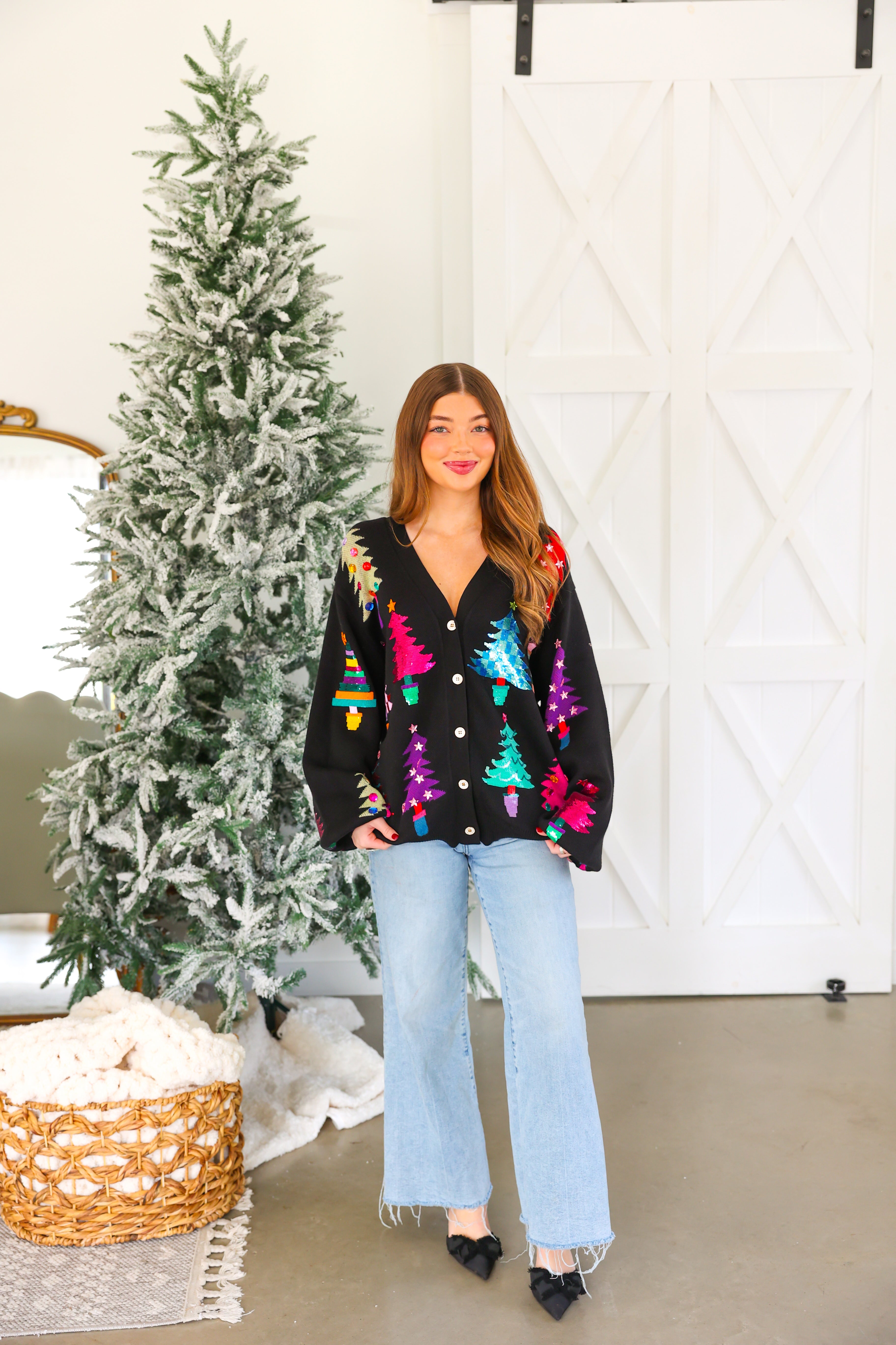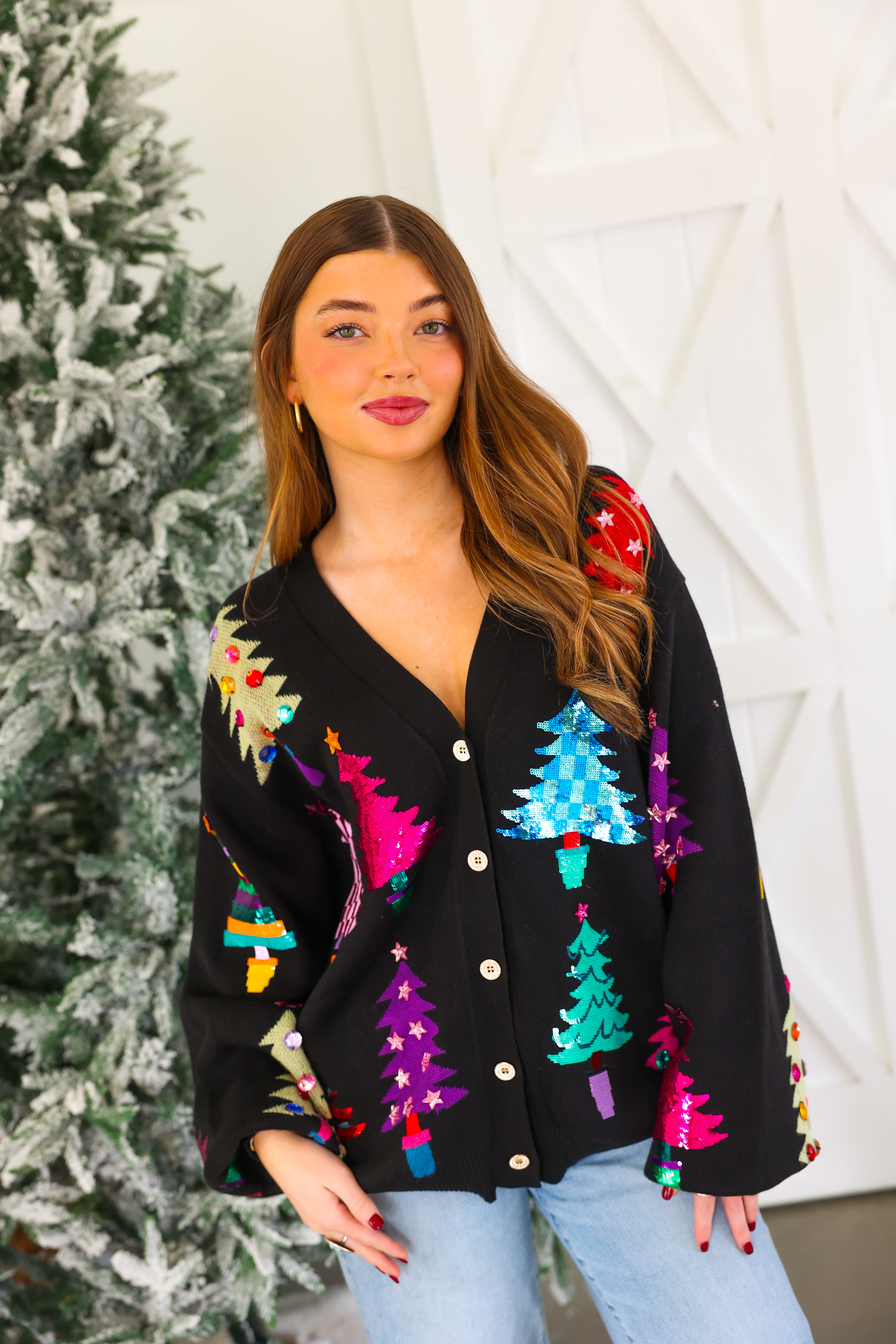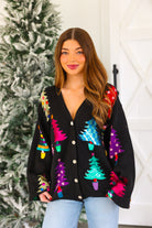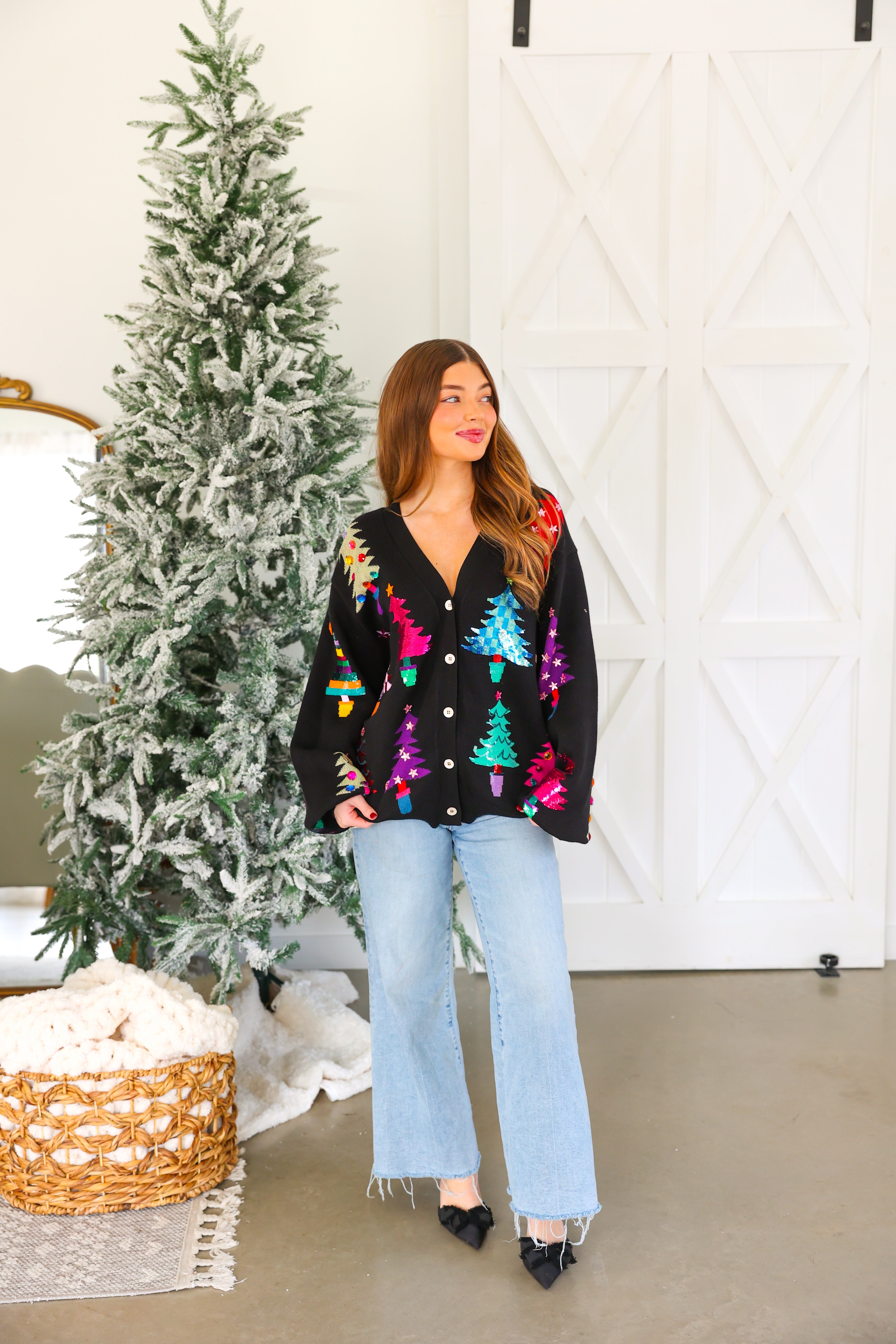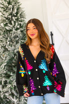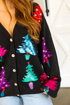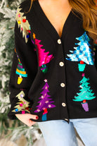 'Tis the season to sparkle with our Black Colorblock Trees Cardigan! This cozy black cardigan features colorful sequin Christmas tree designs, making it the perfect addition to your holiday wardrobe. With a comfy fit, you'll want to wear this all season long!