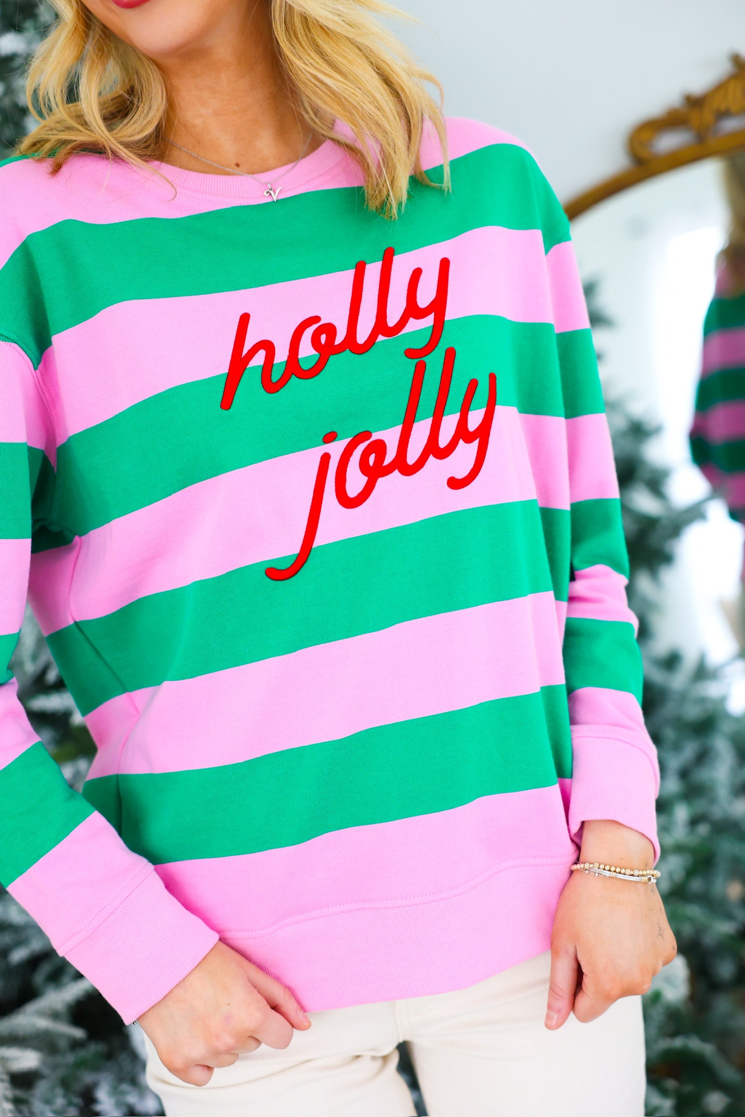Get in the spirit with the “Holly Jolly” Striped Classic Sweatshirt – your new festive favorite. Featuring bold green and pink stripes and playful embroidered lettering, this cozy pullover is the perfect pop of color for your holiday wardrobe. Made from a soft cotton blend, it’s great for lounging, gifting, or twinning with your bestie. Pair it with jeans, joggers, or anything merry and bright!