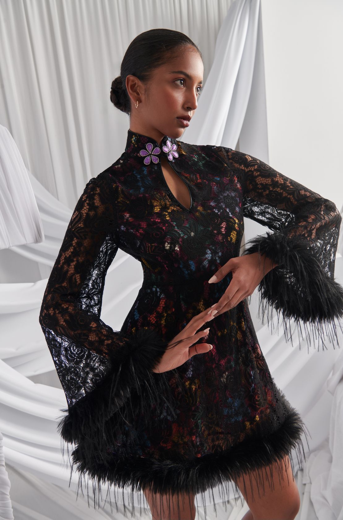 The Lys Dress is a seductive mini crafted in black lace with subtle multicolor accents. Featuring a high collar with floral appliqué, flared sleeves, and feather-trimmed cuffs and hemline, it balances drama and elegance. A statement piece that channels vintage glamour with a modern twist.
