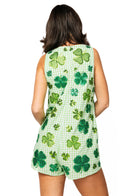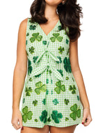 This playful romper brings festive charm and standout sparkle together in the most fun way. Featuring a classic green-and-white plaid print accented with rhinestone shamrocks, this one-piece look is equal parts spirited and stylish — perfect for celebrating with confidence.