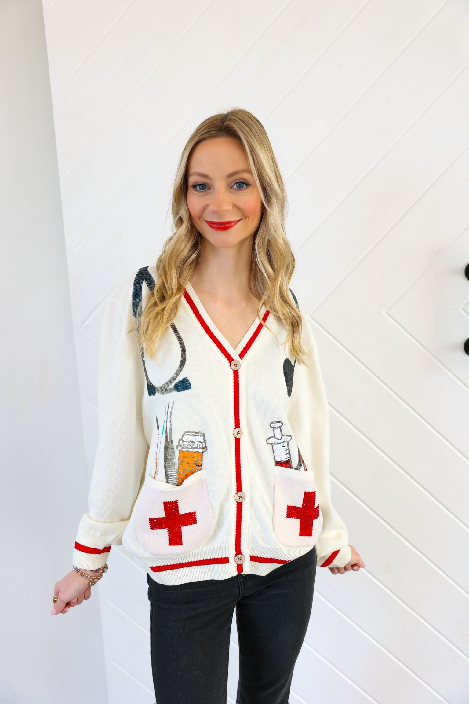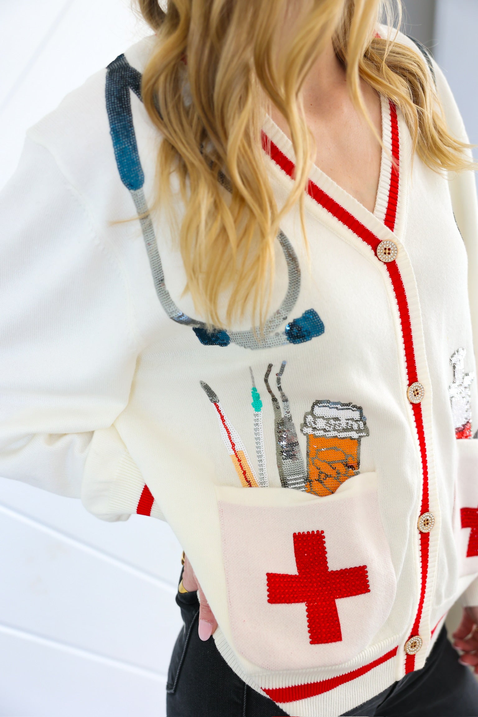 Elevate your medical aesthetic with this striking white button-up cardigan from Queen of Sparkles. Featuring playful medical instrument designs, it seamlessly blends professional style with creative flair. Perfect for healthcare workers, students, or anyone who celebrates their passion for medicine with personality. The classic cardigan silhouette offers versatile layering for scrubs, casual wear, or clinical settings. Comfortable, eye-catching, and conversation-starting—this piece transforms everyday workwear into a statement of individuality and pride in your profession.