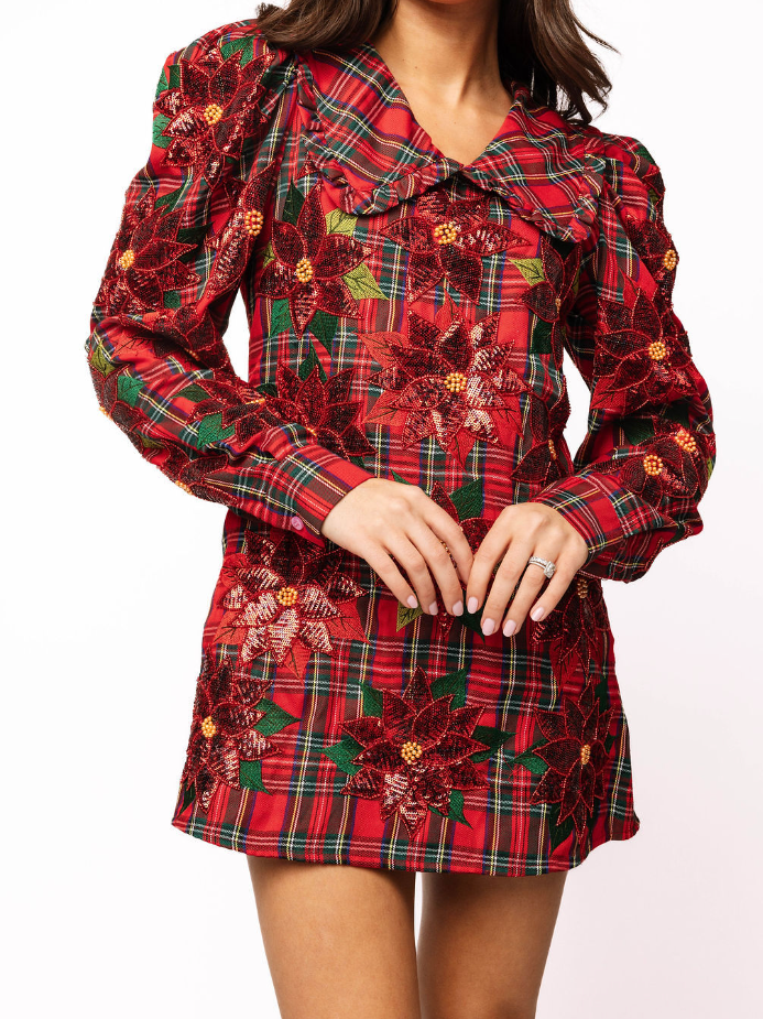 Red Plaid Poinsettia Oversized Collar Poof Sleeve Dress Queen of Sparkles