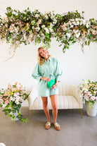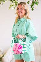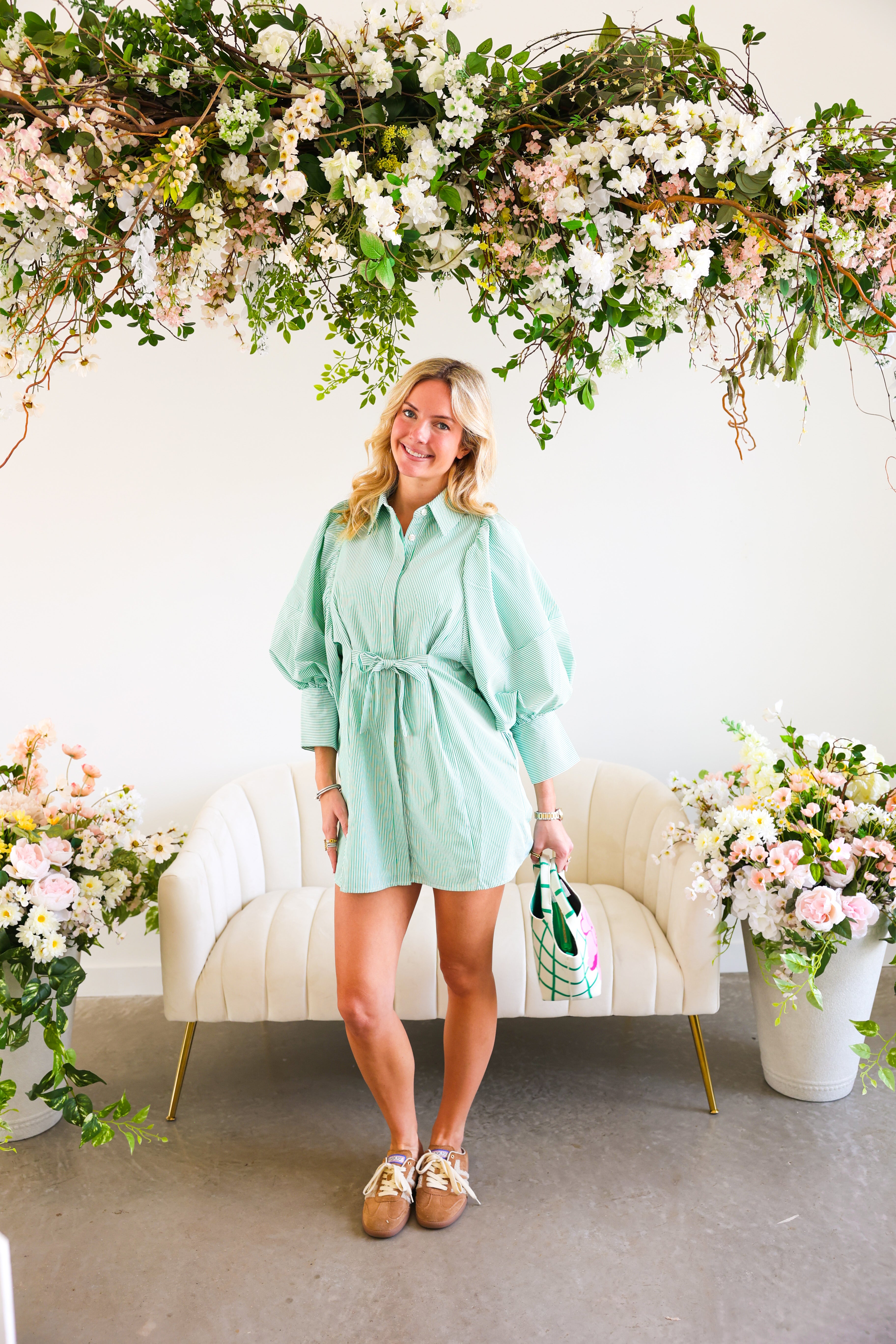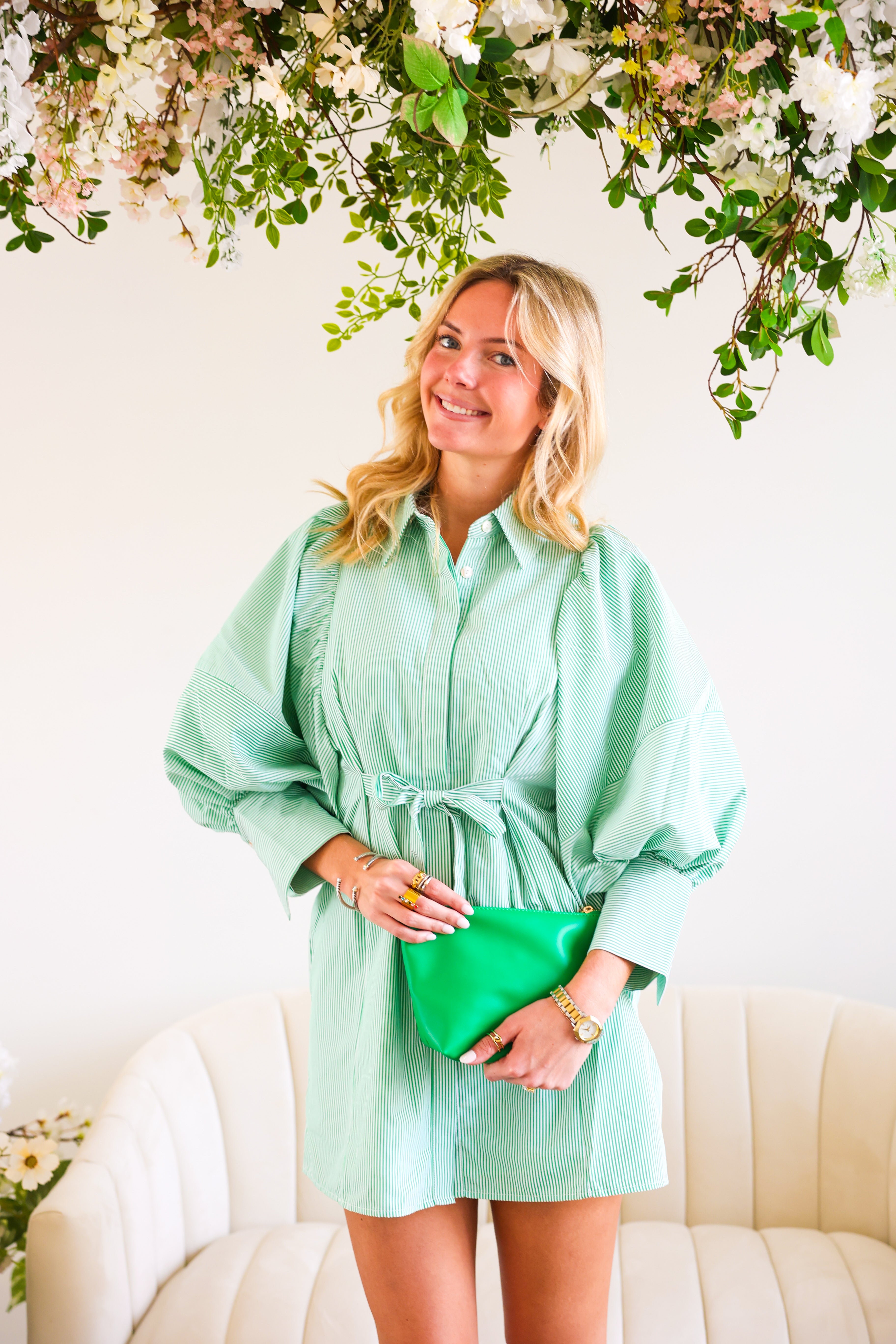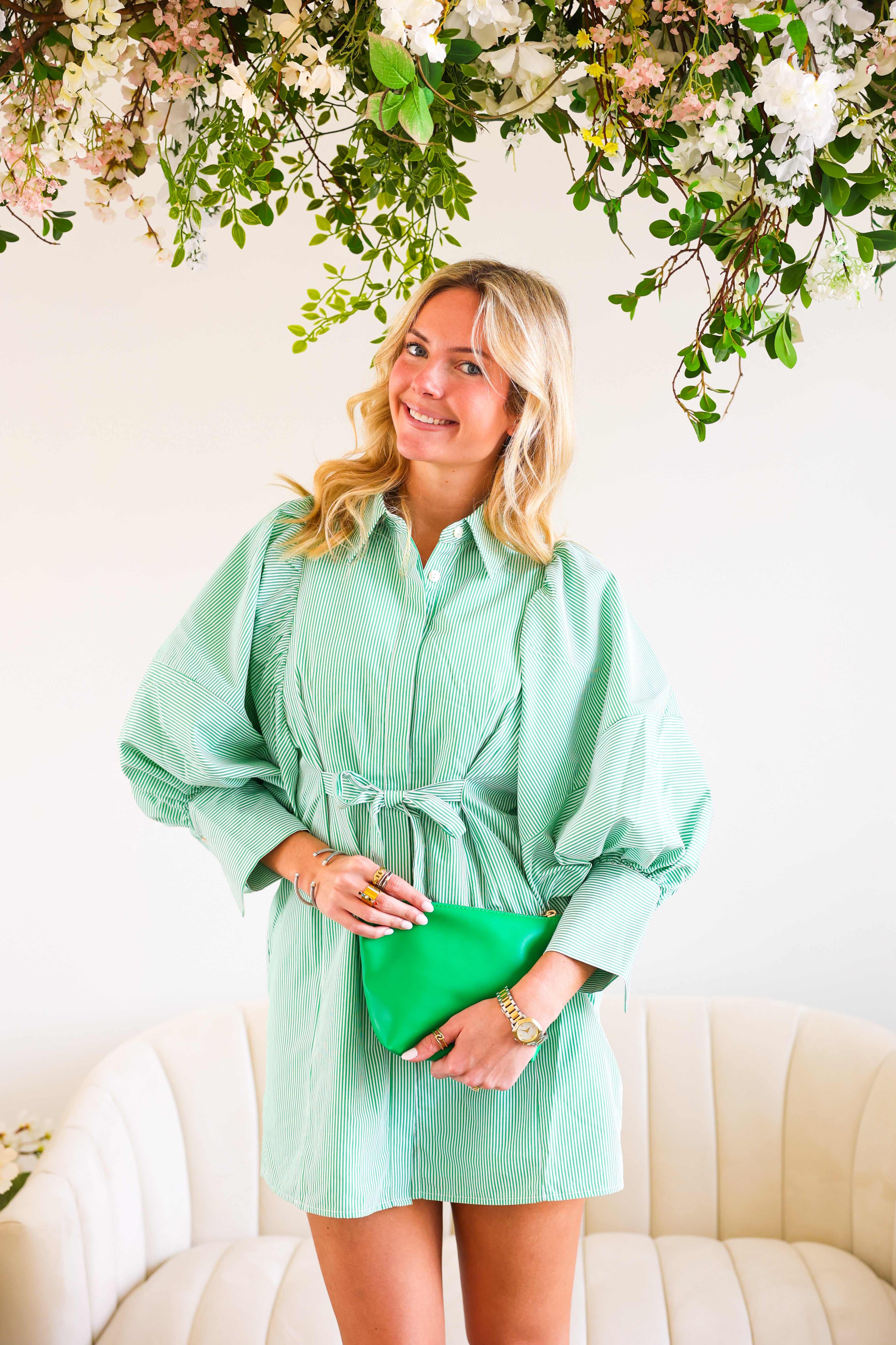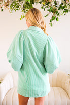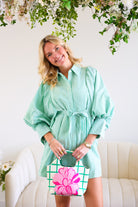Classic, crisp, and clubhouse ready. The Fairway Stripe Shirt Dress features timeless green and white stripes in a tailored silhouette that feels effortlessly polished. With its structured bodice, button-front detail, and flattering shape, this dress brings subtle golf-inspired charm without feeling costume-y.