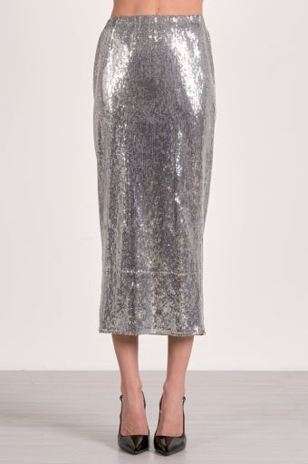 Shine brilliantly in the Silver Sequin Maxi Skirt, designed to catch every eye with its dazzling shimmer. The full-length silhouette creates an elegant, flowing effect that moves gracefully, making it perfect for special occasions or glamorous nights out. Elevate your ensemble effortlessly with this statement piece that combines sparkle and sophistication.