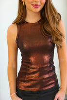Elevate your look with the Brown Metallic Tank, featuring a shimmering finish that catches the light for a subtle yet striking effect. Its sleek, sleeveless design offers a flattering fit that moves effortlessly from day to night. Perfect for pairing with jeans or skirts, this tank adds a touch of glamour and warmth to any outfit, making it a must-have addition to your wardrobe.