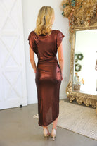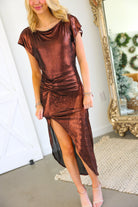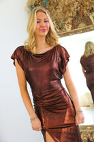 Make a stunning entrance with the Bronze Metallic Maxi dress, designed to captivate with its radiant bronze shimmer. This flowing maxi silhouette offers elegant movement and a flattering fit, perfect for special occasions or evening events. The metallic finish adds a touch of bold sophistication, ensuring you stand out with confidence and grace wherever you go.