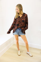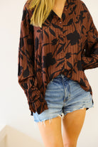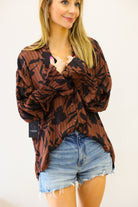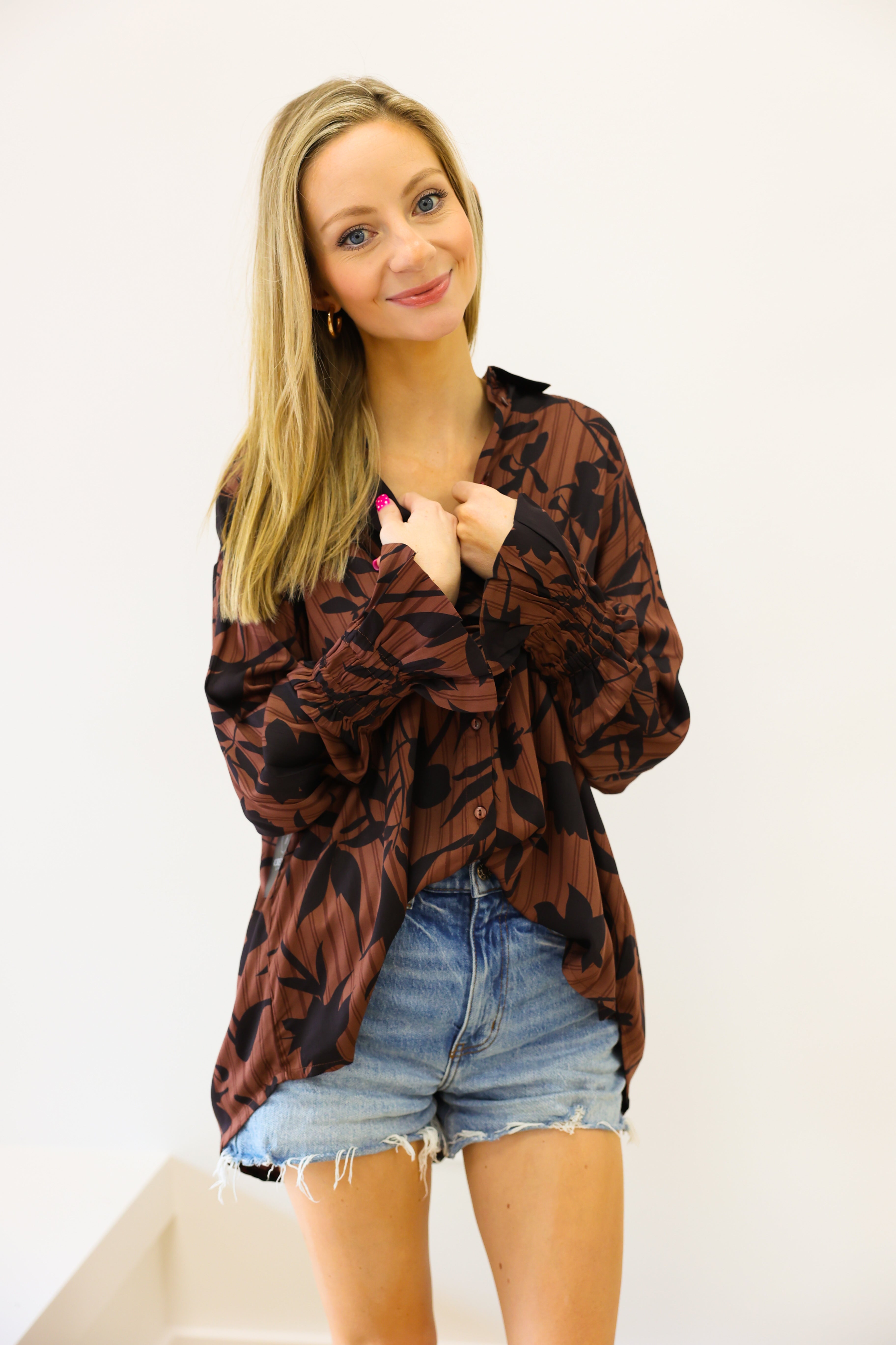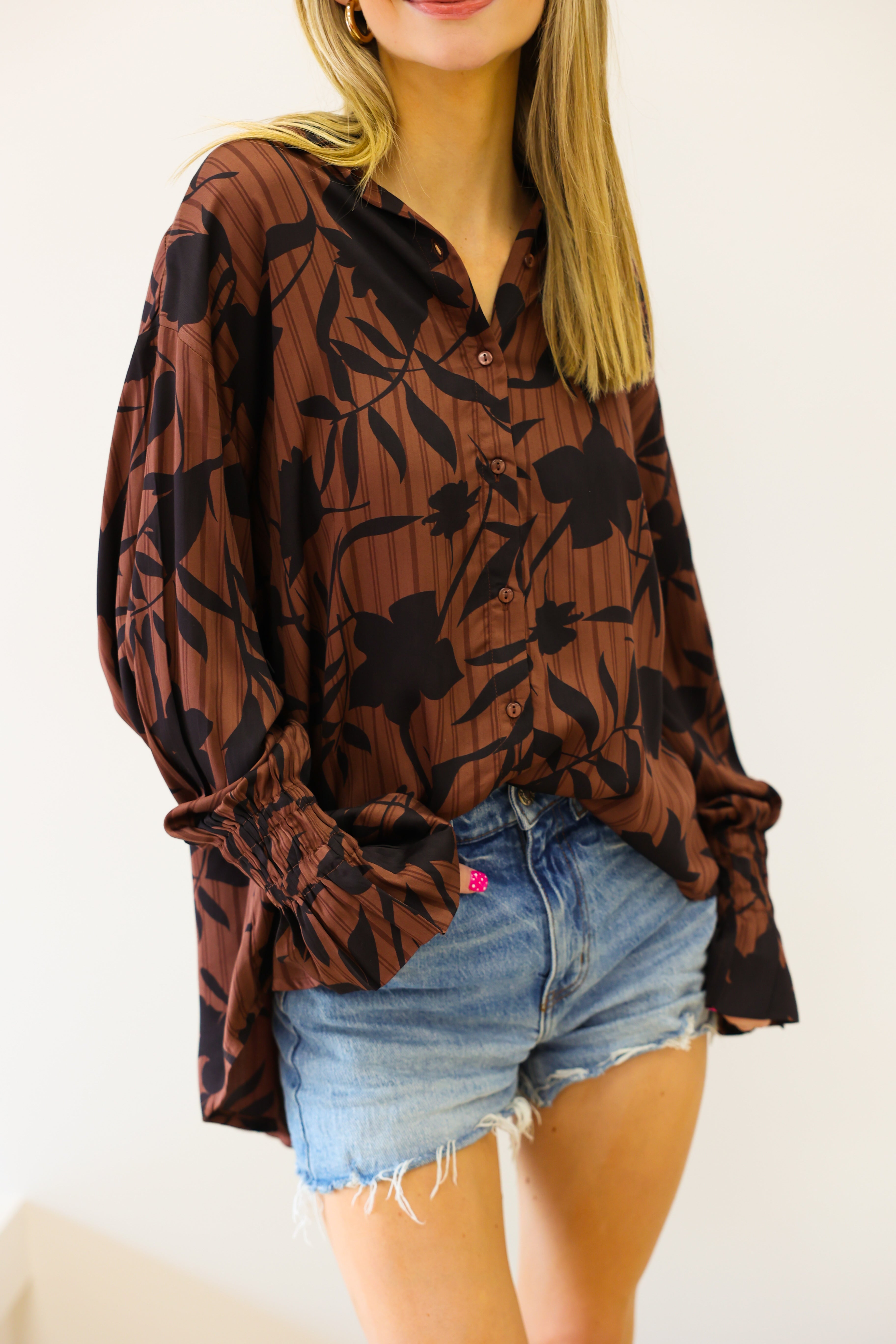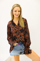 Elevate your look with the Brown Foliage Flair Sleeve Button Down. This beautifully detailed blouse features elegant flair sleeves and a rich brown hue inspired by nature, offering a refined yet relaxed feel. Perfect for layering or wearing alone, it brings a touch of sophisticated charm to your everyday wardrobe.