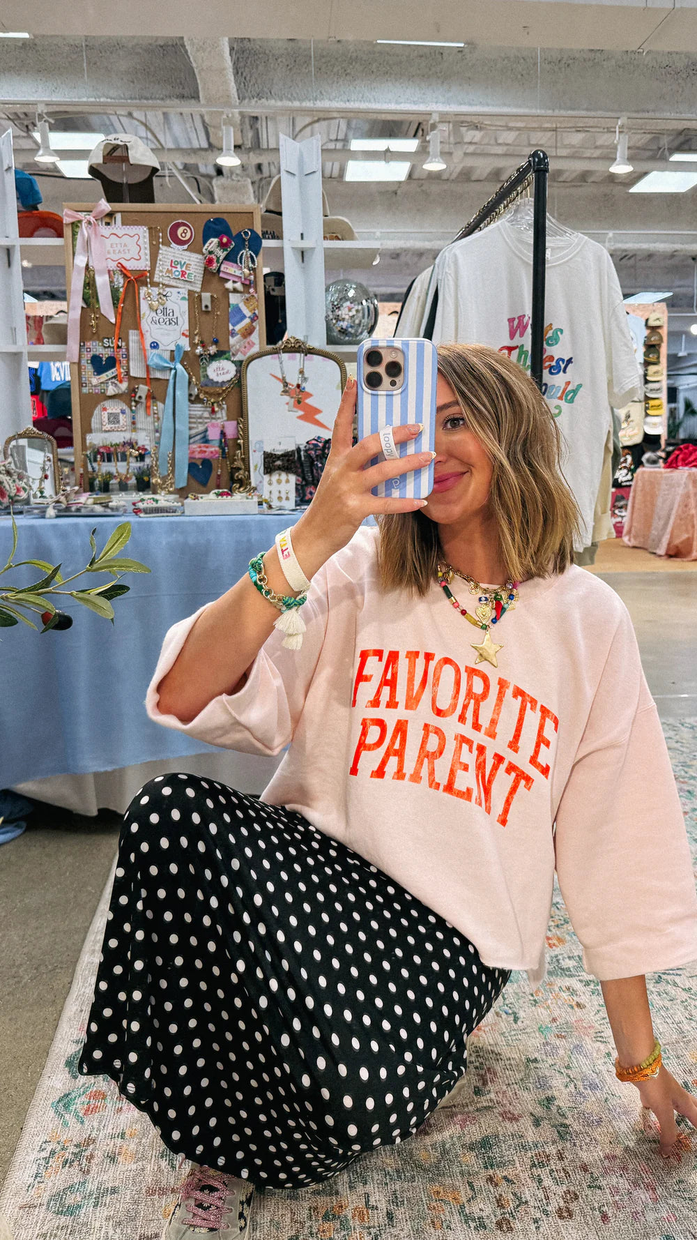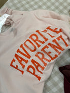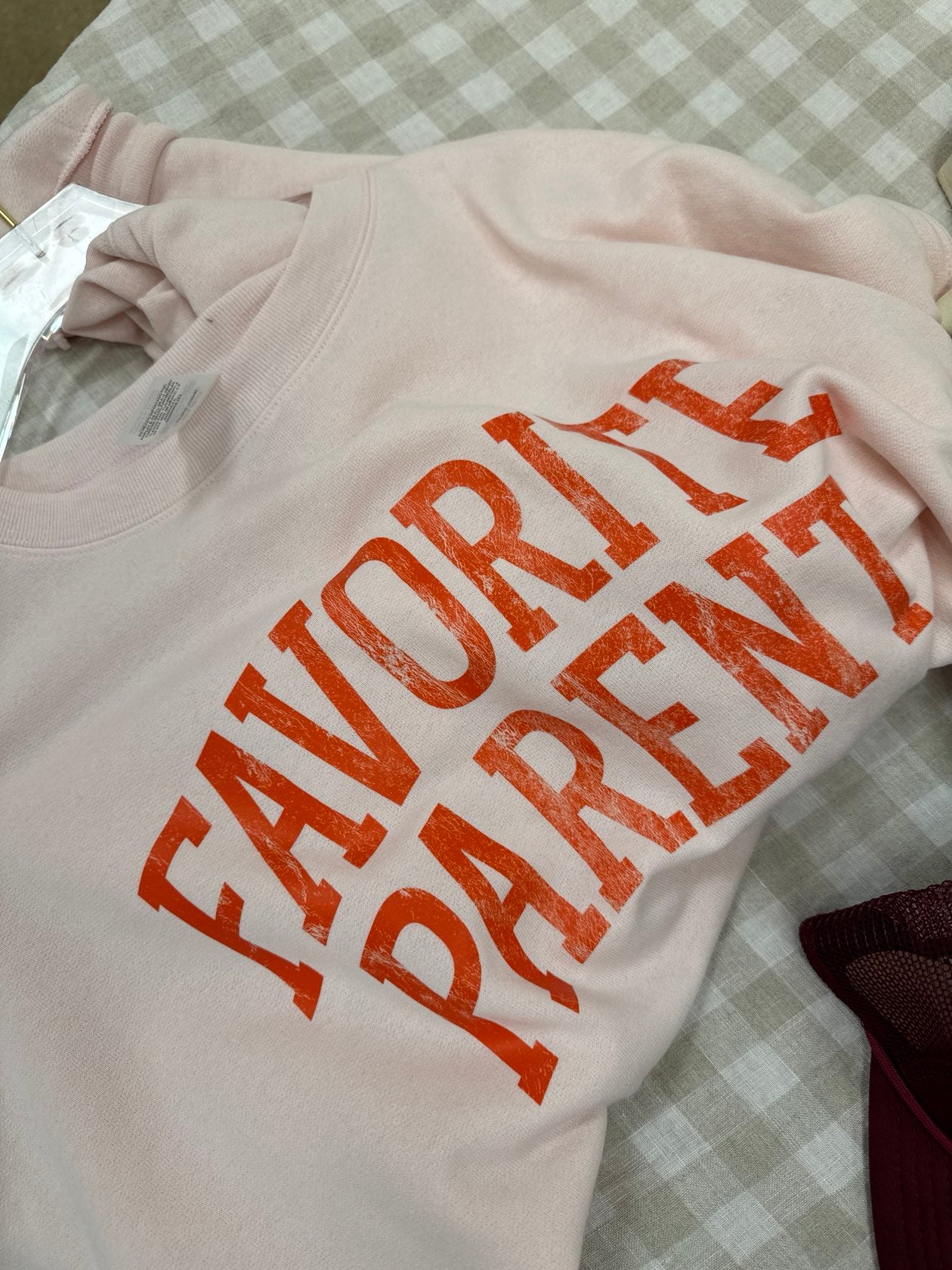 Stay cozy and stylish in the Favorite Parent Sweatshirt, featuring a charming pink and red color combination. Crafted for comfort and warmth, this sweatshirt is perfect for everyday wear or relaxing weekends. Its vibrant hues add a playful touch to your casual wardrobe while celebrating your role as a favorite parent. Embrace comfort without sacrificing style with this must-have sweatshirt!