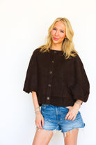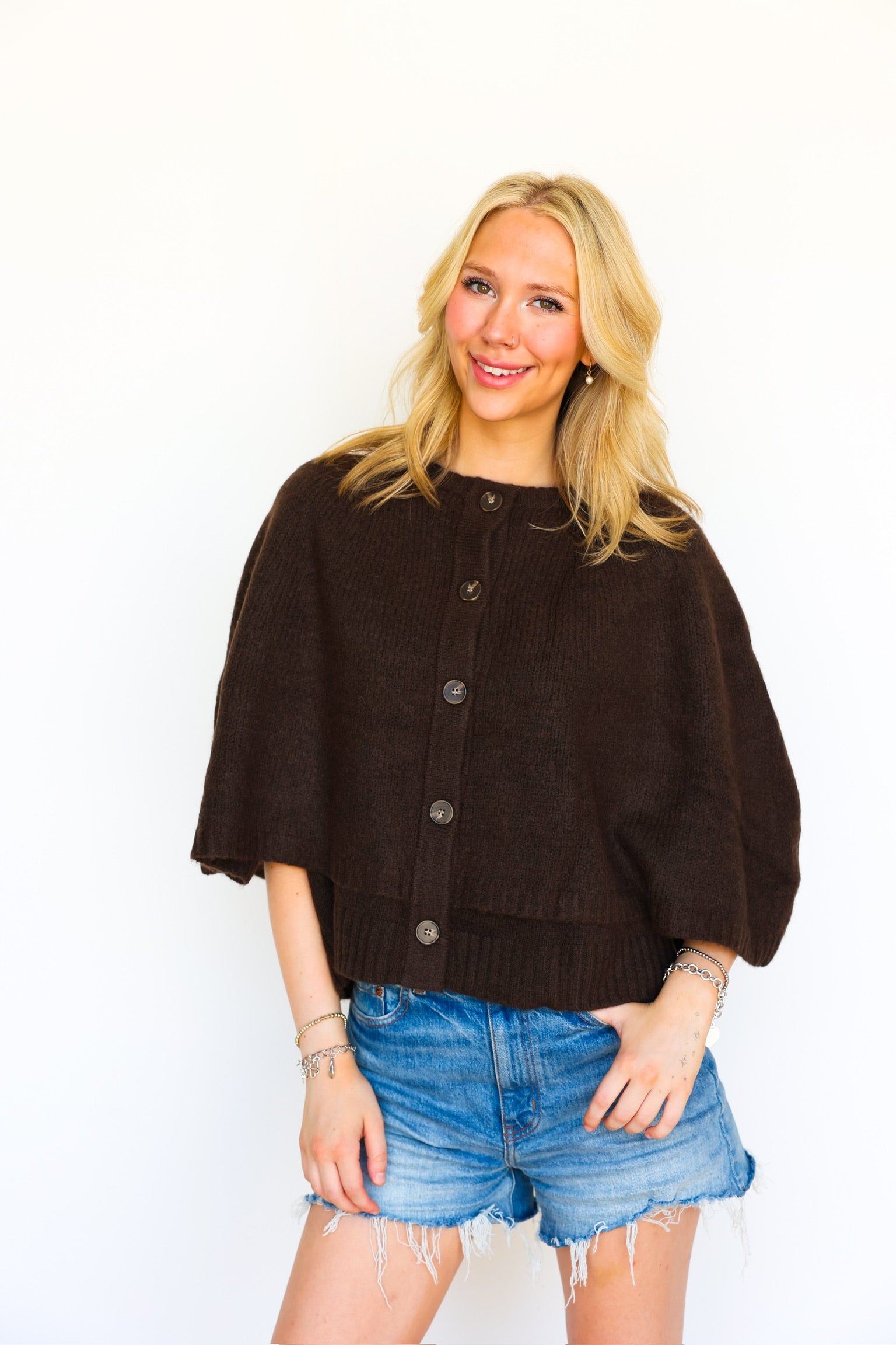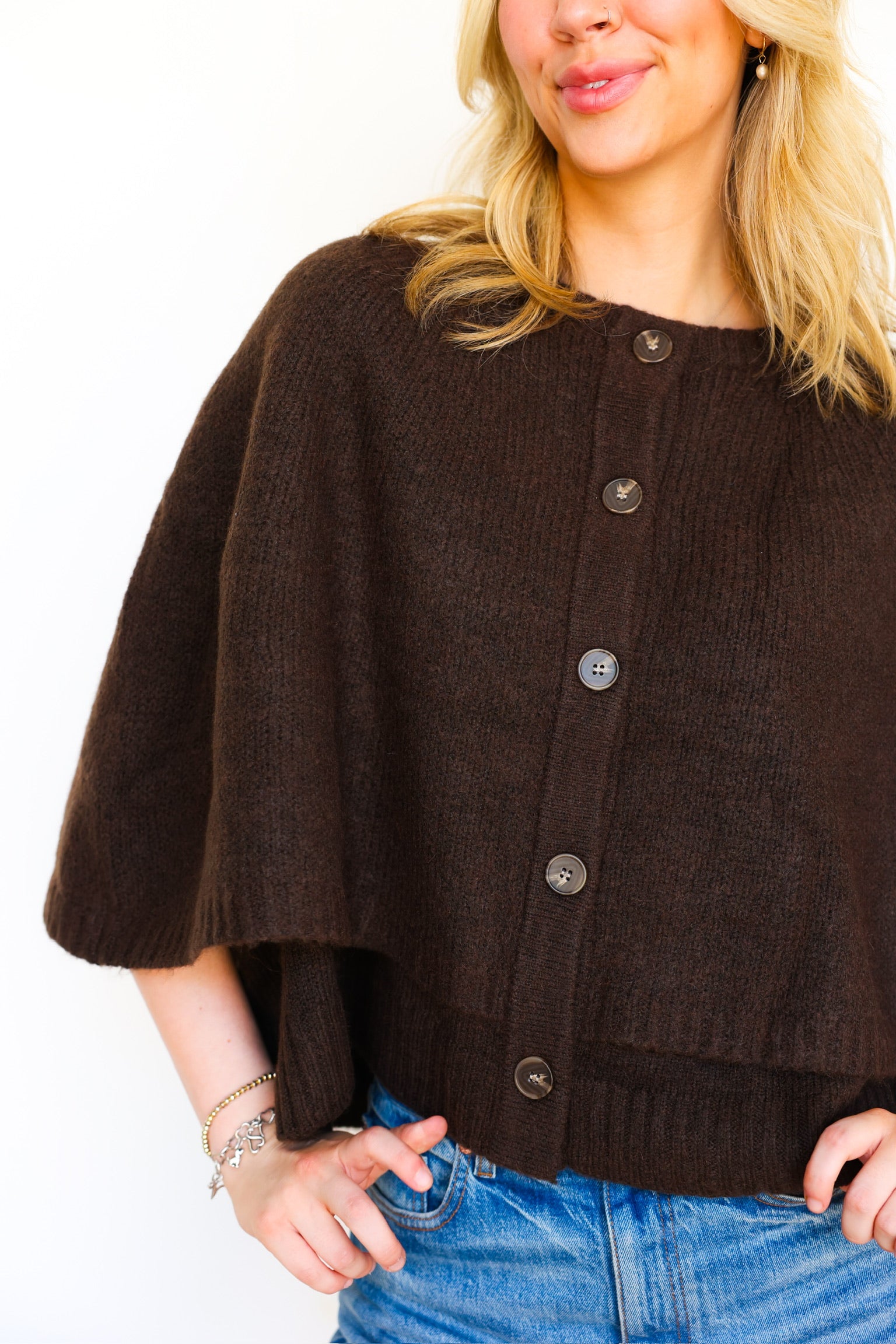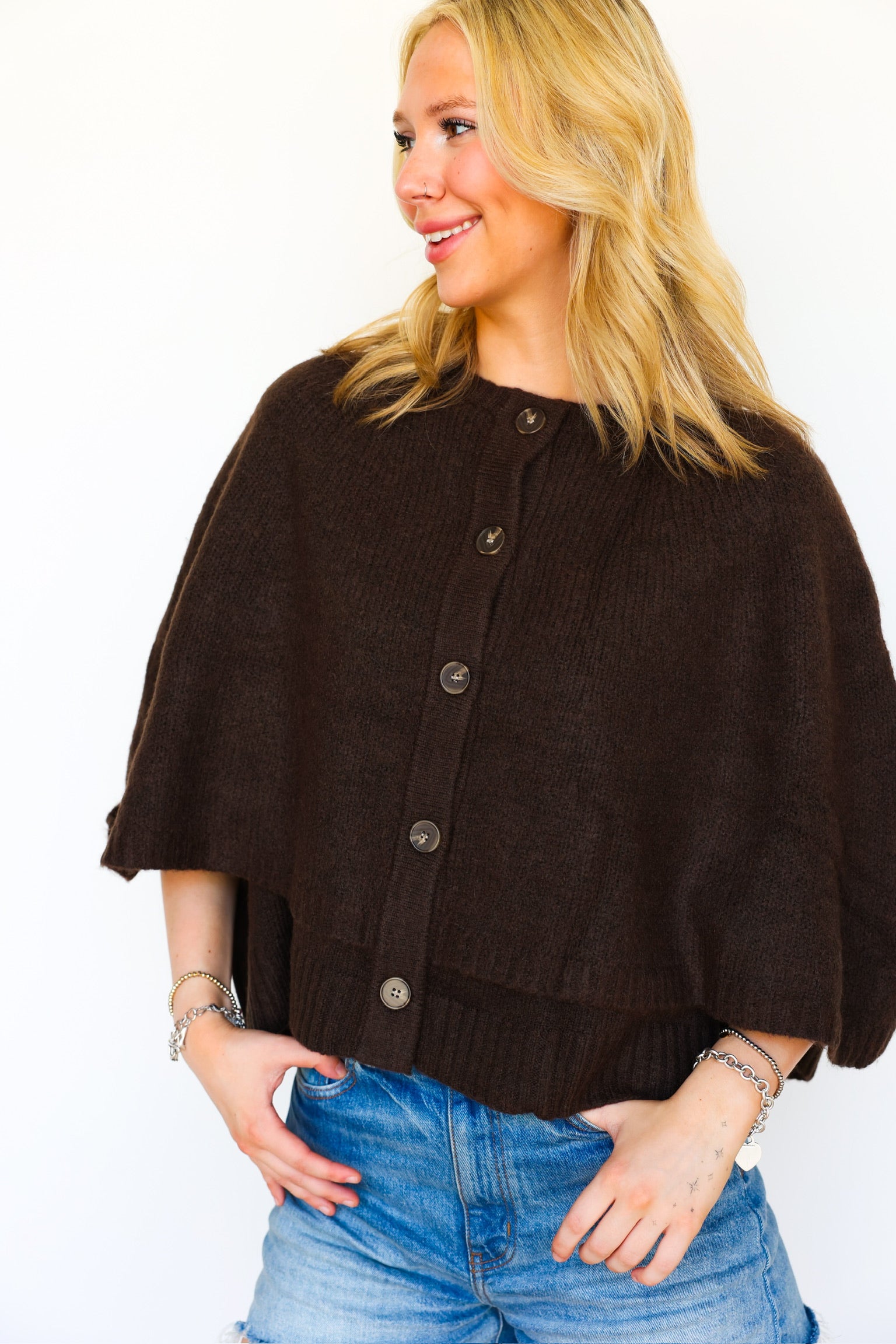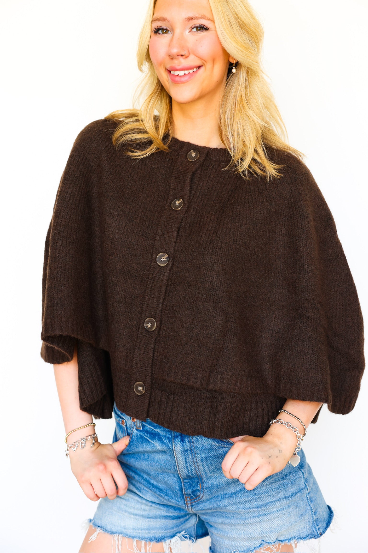 Effortless, cozy, and made to elevate any outfit, this cape-style cardigan is your go-to layer for cooler days. With a relaxed drape, statement buttons, and wide sleeves, it’s the perfect blend of comfort and polish. Just throw it on and go, instant chic, and zero effort.